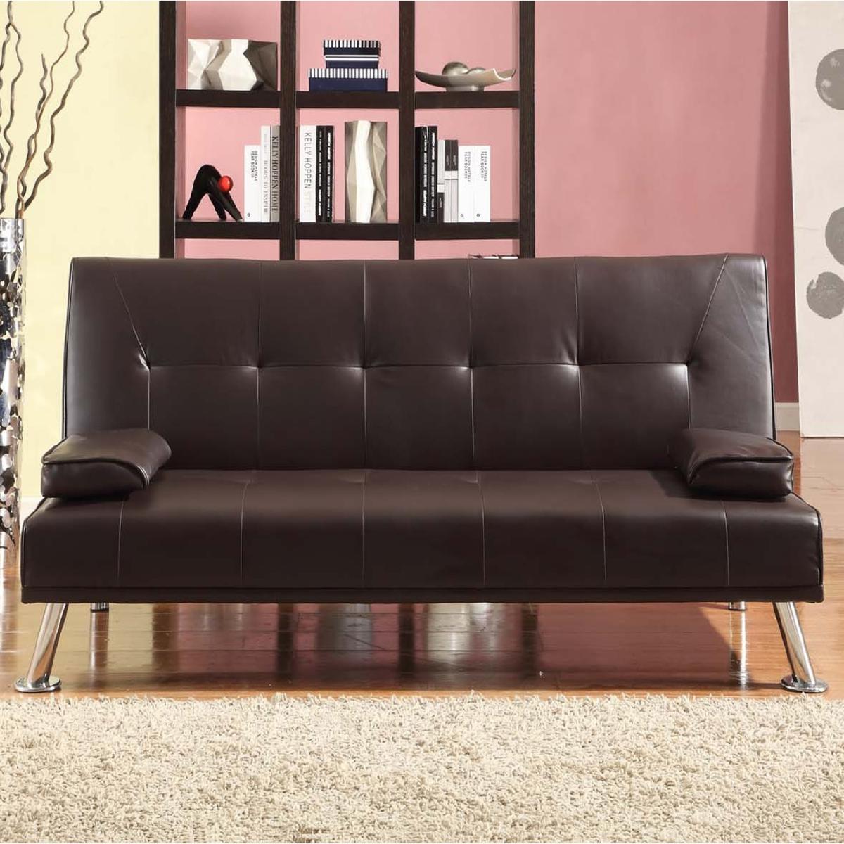 This Sofa Bed is a stunning piece of furniture and would be a great new addition to your home. It can be used in a bedroom or in the living room, bringing a contemporary touch to the room. This sofa uses the ingenious, faultless 'click-clack' mechanism, allowing you to have the sofa positioned in one of 3 ways - sitting, reclining or sleeping. Converting in seconds. This Italian style sofa bed is stylish and highly functional. Made of high-quality faux leather, this multi-functional sofa bed offers great durability and stain-resistant properties. The polished chrome legs give it that extra addition of designer glamour. This sofa comes with two armrests (not attached), that double up as pillows when in bed mode.