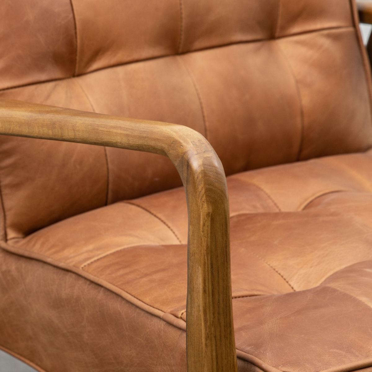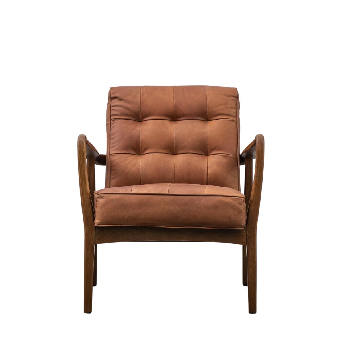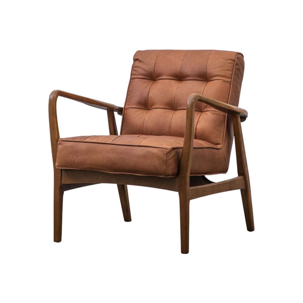 All about me A mid century stand out personality piece with a solid oak angled frame twinned with top grain vintage brown leather and deep pull detailing. Need to know Dimensions:W70 x D74 x H80 cm Colour:Brown Finish: Leather Upholstery Material: Oak, Leather Assembly required: Yes