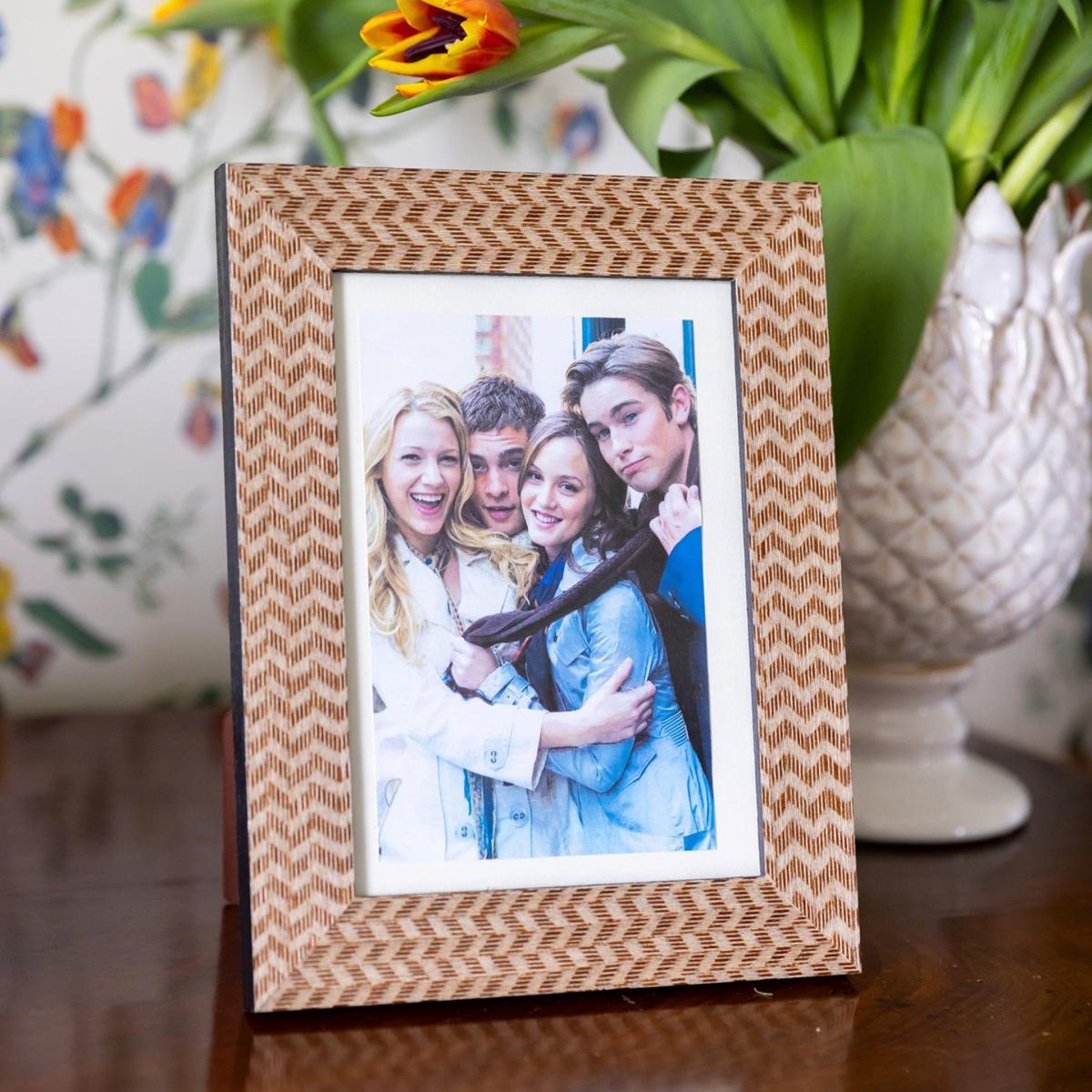I really like this brownie Maquetry pattern, as it adds a subtle texture and visual interest without overpowering the photo it displays. It works particularly well in eclectic or mid-century styled interiors where a hint of pattern adds warmth and personality. To style it effectively, consider pairing it with monochrome or neutral-toned accessories to let the frame stand out, and place it on a clutter-free shelf or sideboard for a polished look. Its medium size makes it adaptable for both tabletops and wall-mounted arrangements, making it a versatile option for personalising spaces with photos or artwork.