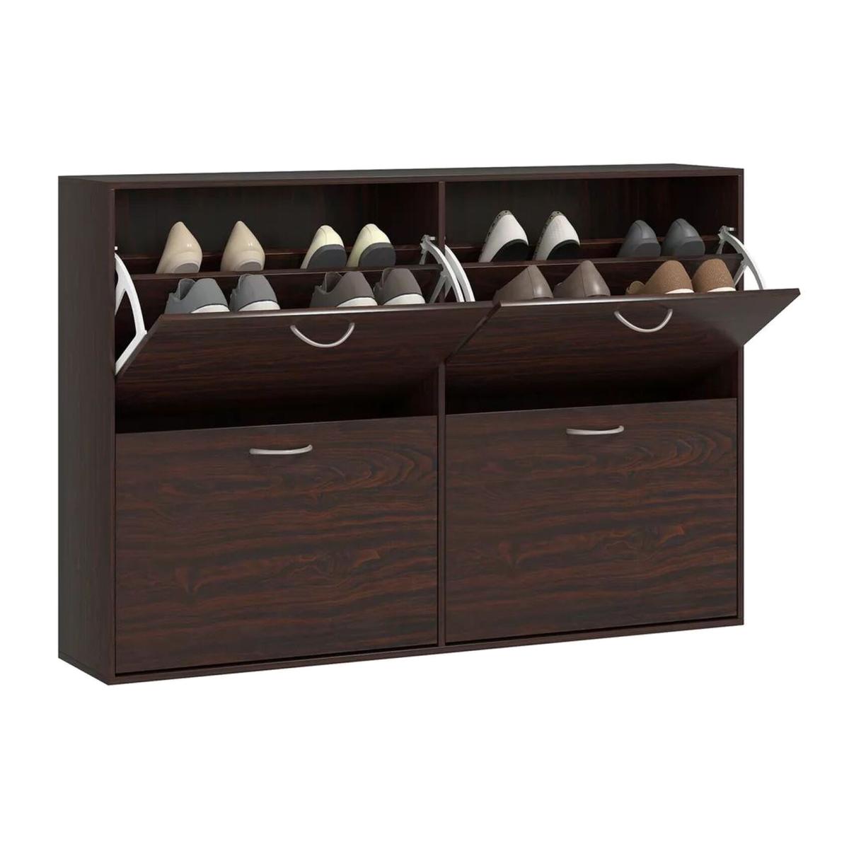 This brown wooden shoes cabinet offers multiple flip-down drawers, providing ample storage for your footwear. Its warm wood finish adds charm to any decor, while the spacious compartments keep your shoes organised and ready for wear.