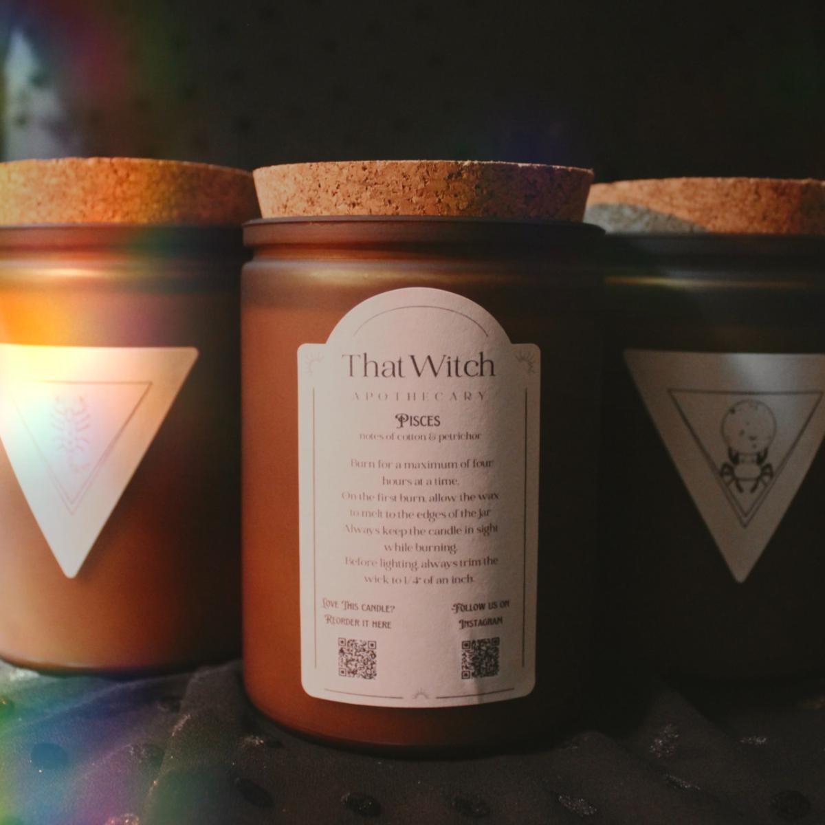 Each of our zodiac candles have unique scents that are formulated based on the herbs, flowers, and woods associated with that particular sign. The scents are also formulated to embody the scents and feelings of the time of year that the astrological season takes place. Fragrance notes: Top: ozone, rain, lemon Middle: cotton blossom, earth, jasmine Base: patchouli, moss, powder 11 ounces | 100 hour burn Soy wax candle made with all natural fragrance Handpoured with magical intention to help ground.