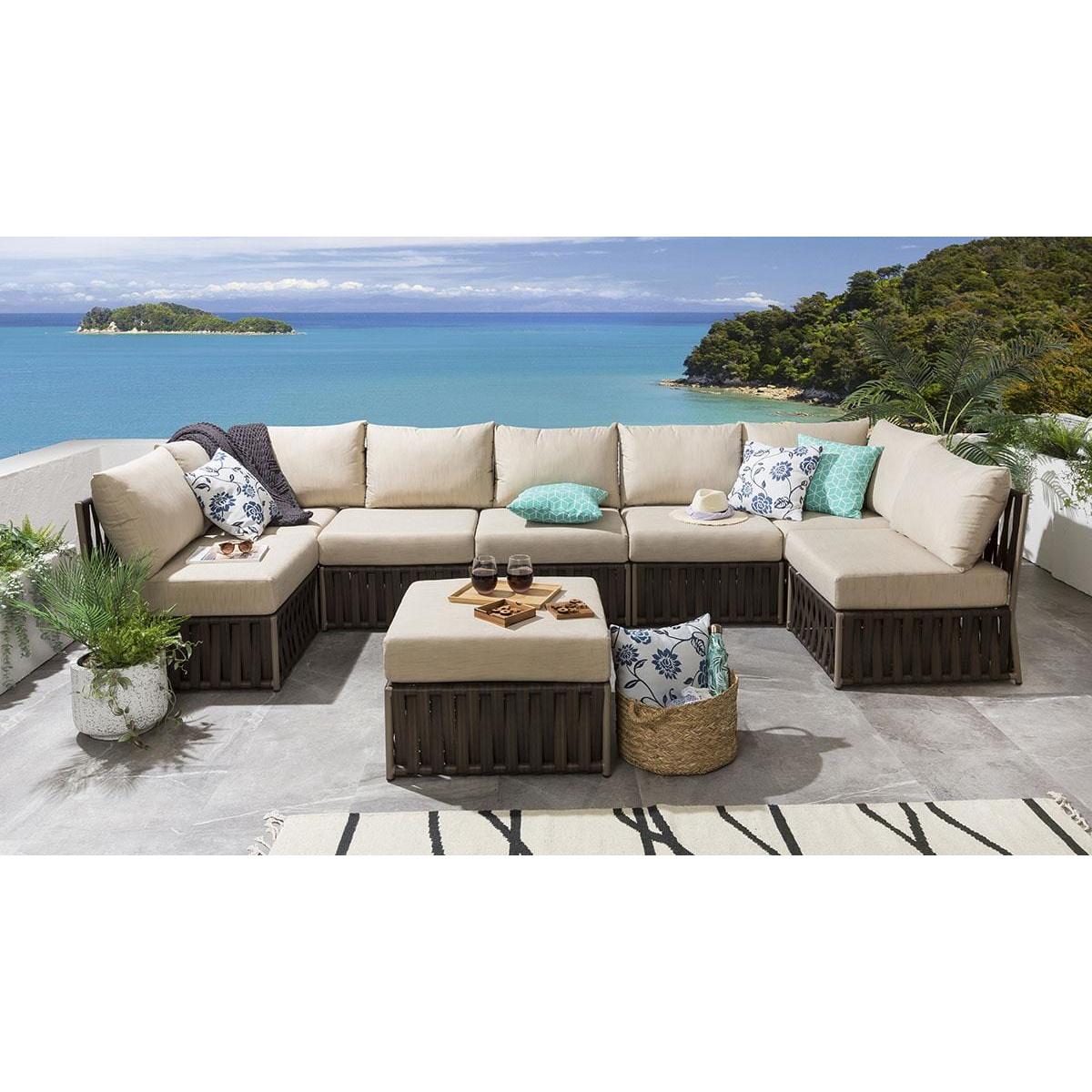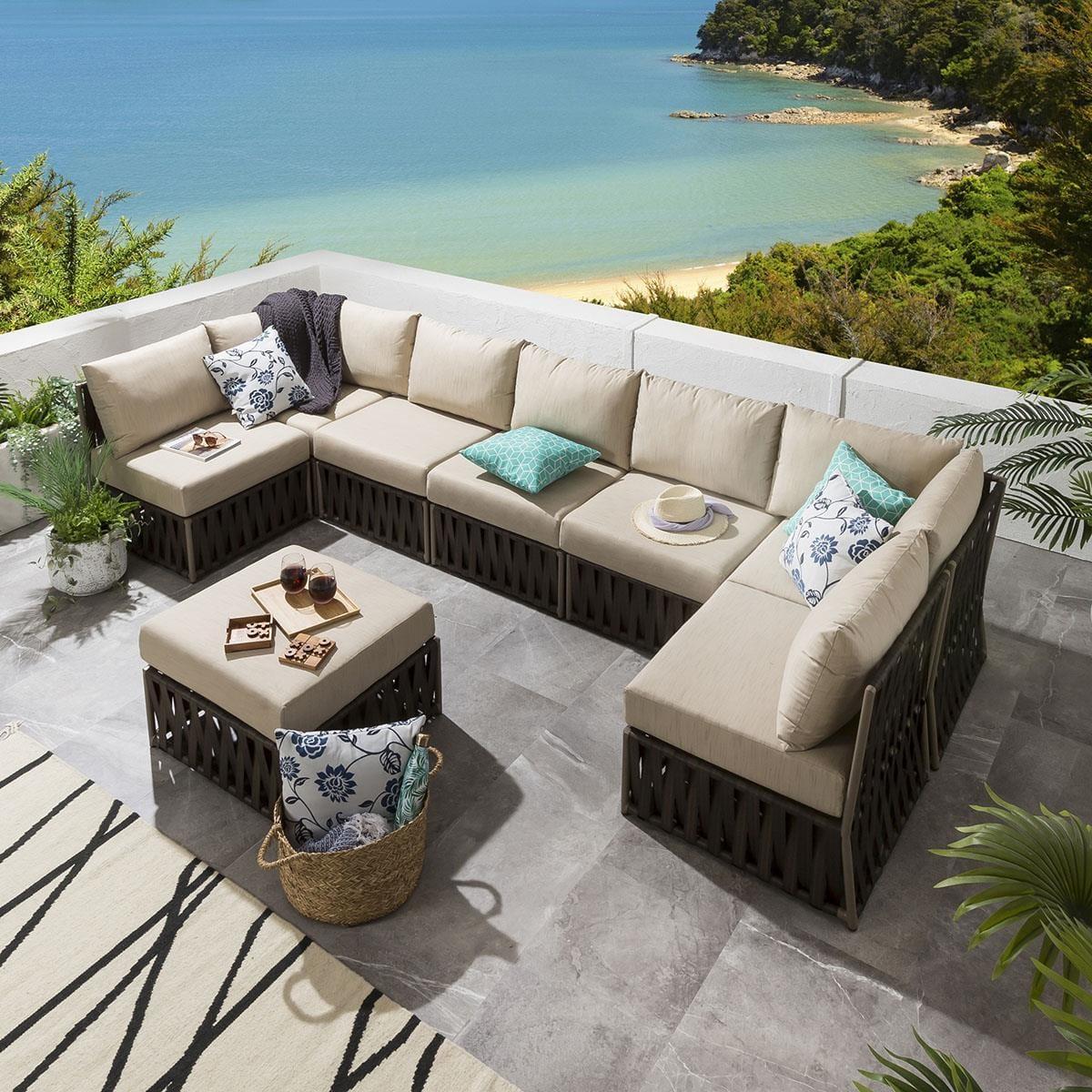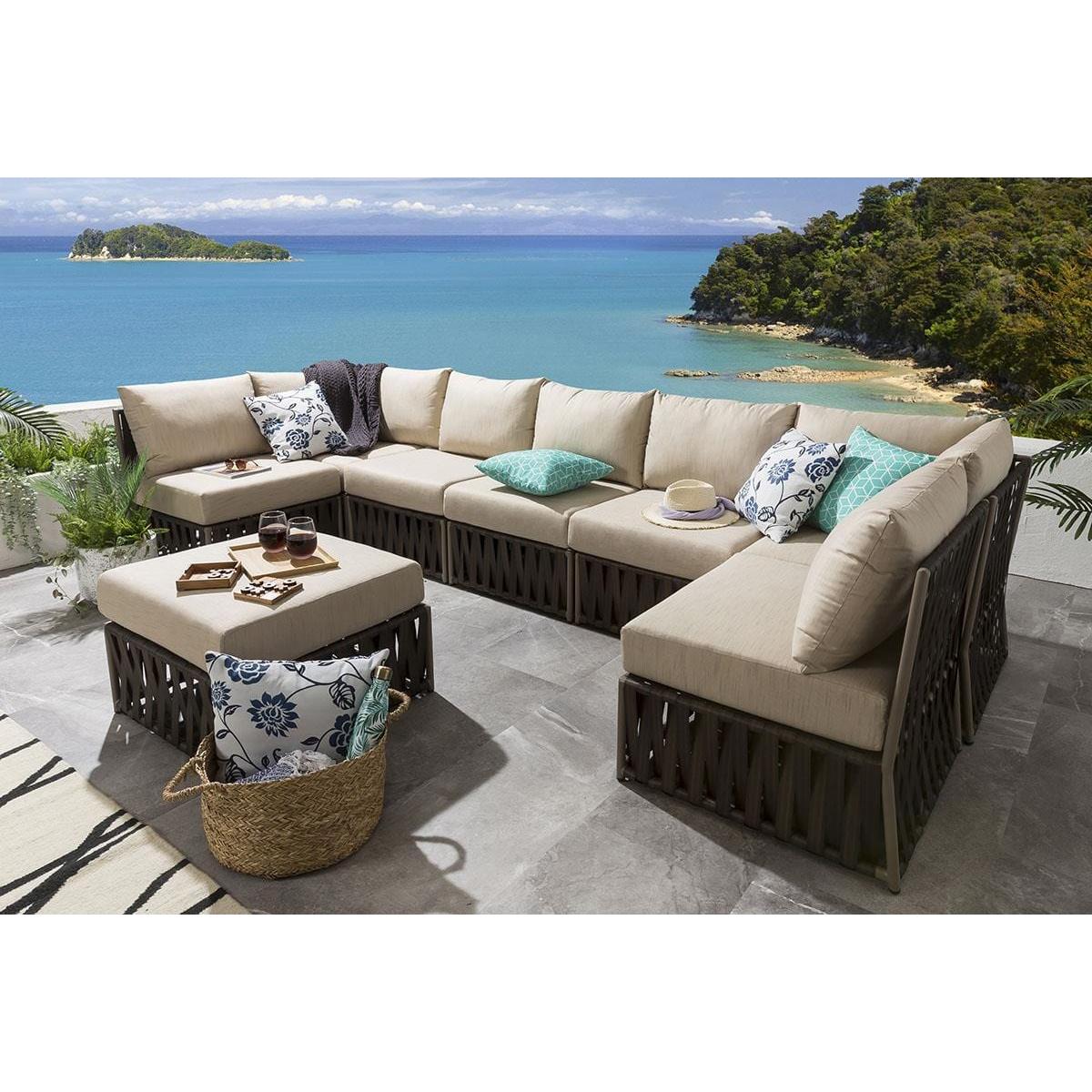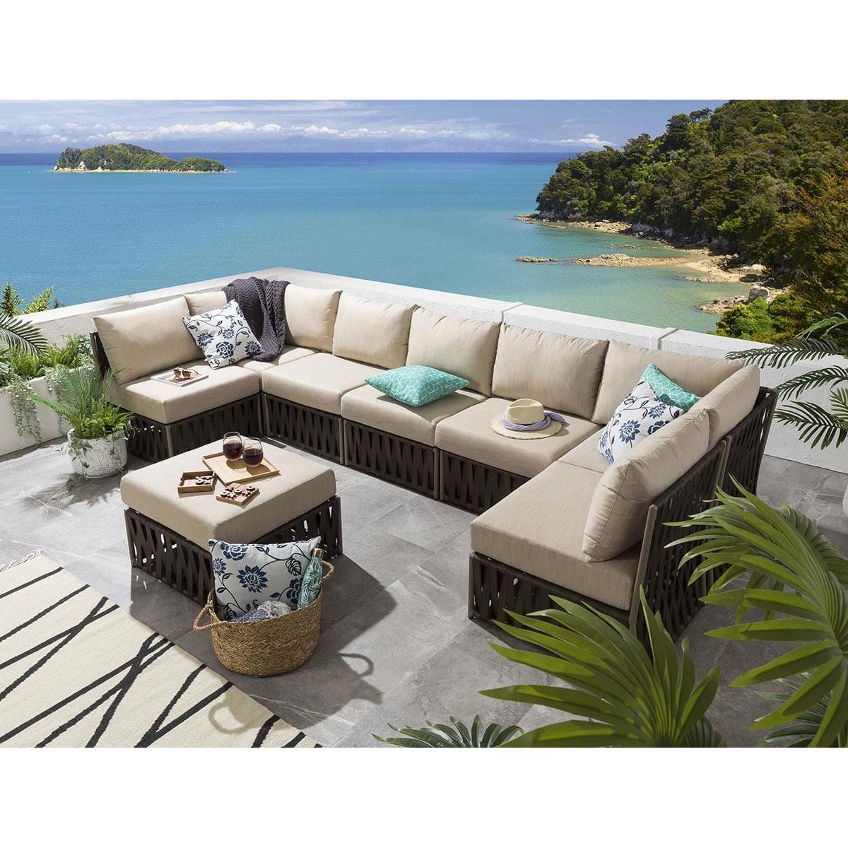 The Theo 5 seater premium brown thick rattan weave sofa range combines modular practicality with designer style and luxury comfort. Our designer outdoor 5 seater U-shaped corner sofa & footstool will make a gorgeous addition to your outdoor seating area or patio. All sections in this range come with a free winter cover. The outdoor sofa set comes complete with our signature luxuriously thick cushioning that offers unbeatable comfort, topped off with rich Beige high-end marine fabric which has amazing resilience to colour fading and damage caused by extreme weather conditions. Expertly crafted aluminium frames are highly durable, complemented by the intricate rattan weave that blends traditional with contemporary. It offers an unexpected alliance between the design minimalism of its metallic structure and the artisanal warmth of its UV and weather-resistant hand-woven rattan. The whole set is super-easy to clean, guaranteeing years of enjoyment with the modular garden sofa. If you need more information about this product, use the Live Chat service to speak to the team or send us a message. Spread the cost our with interest-free finance options. Minimum spend applies. W360cm D145cm H75cm Market Leading 5 Seater U-Shaped Corner Brown Rattan Garden Sofa & Footstool Easily reconfigure the sofa into other layouts