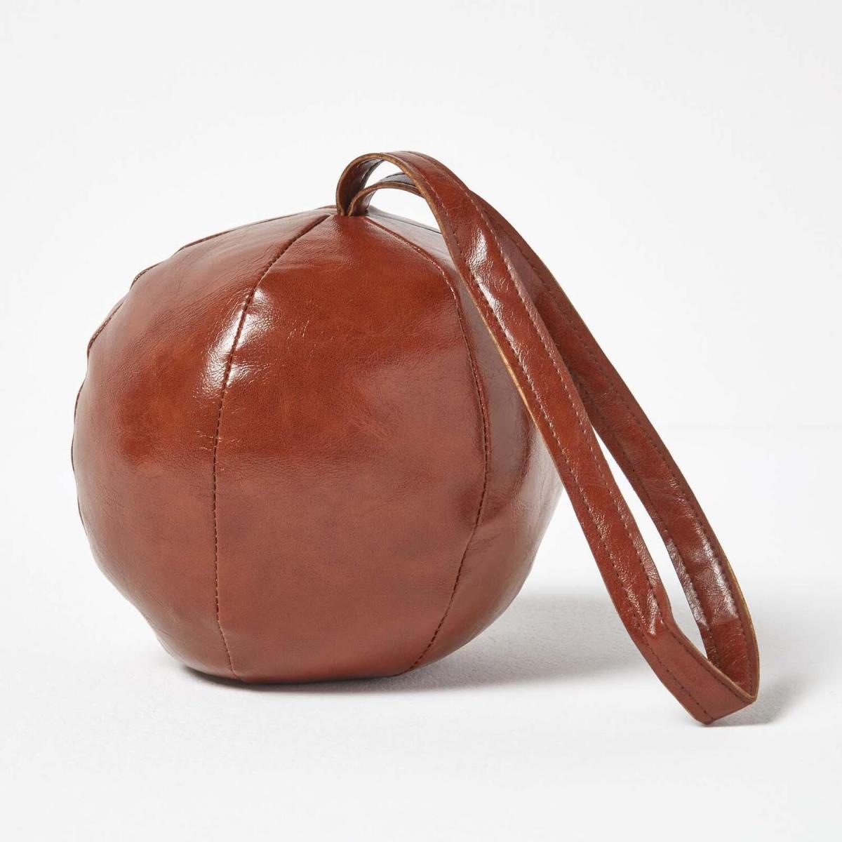 Brown faux leather doorstopper designed with a heavy centre to prevent doors from slamming and to prop them open. This decorative door stopper looks great in interiors and can be hung on door handles to help keep interiors tidy. Filled with sand and fibrefill, this stopper is heavy-duty meaning it will keep even the heaviest of doors open. With its faux leather fabric, this stopper will help prevent scratches on your laminate or hard-wearing floors, compared to other metal door stoppers. Measuring L 16.3 x W 16.3 x H 14.8 cm and weighing 1.2 kg, this door stopper is small yet strong.