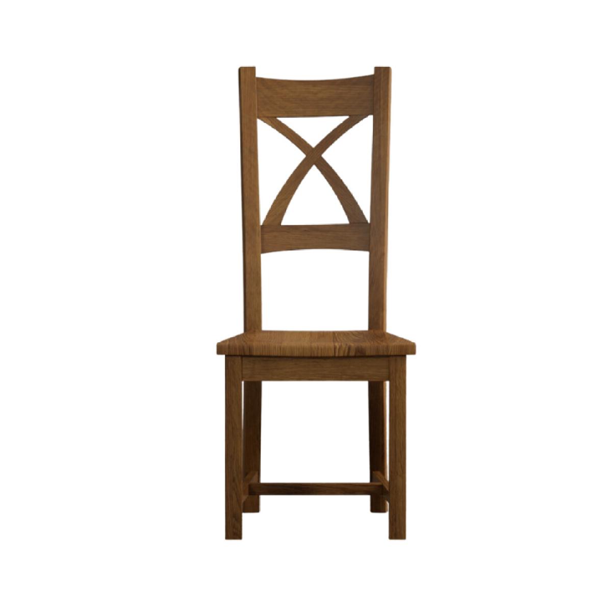 The Rustic Solid Oak X Back Dining Chairs with Rustic Oak Seat Pad are solid oak chairs with a rustic finish, complete with oak seat pads.