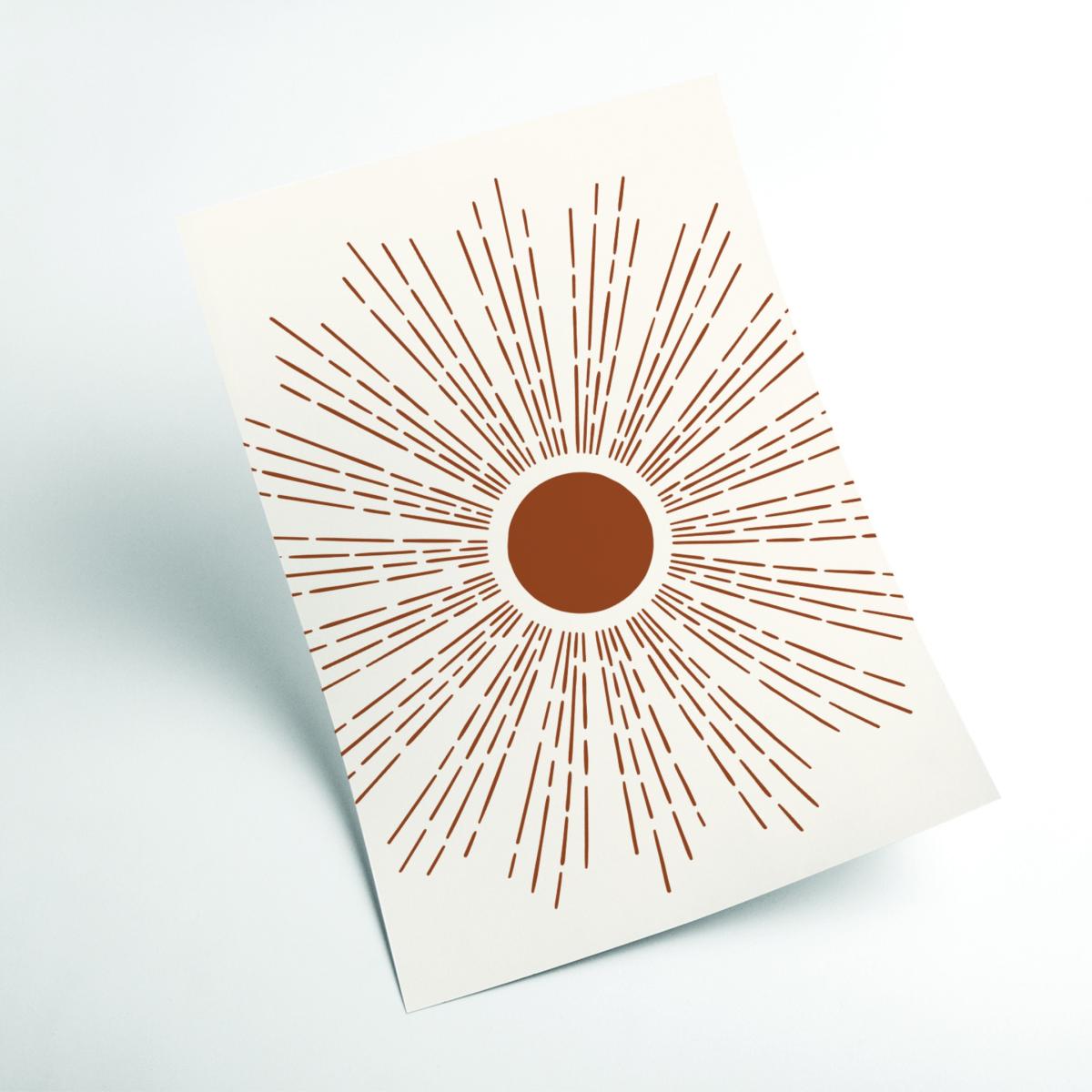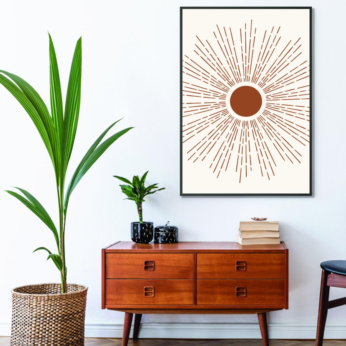 The Brown Sun print is a versatile piece that works particularly well in both minimalist and Scandinavian-inspired interiors due to its simple yet striking design. I love it for its warm earthy tones that add a touch of nature and warmth to a space. It’s a great option for creating a focal point above a sideboard, sofa, or mantelpiece. To style it effectively, consider pairing it with other natural textures like wicker or wood, or even gold accents to enhance its warm tones. Its medium size makes it adaptable for various wall spaces, and framing it in a sleek, modern frame will help highlight its contemporary appeal without overpowering other design elements.