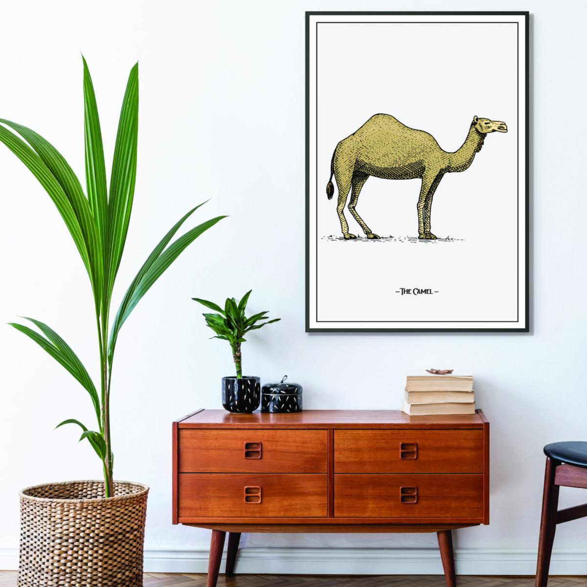 I really like the Brown The Camel print-it adds a subtle touch of personality without overpowering a space. It works particularly well in eclectic, boho, or Arabic-inspired interiors, where its earthy tones and playful character can complement warm colour palettes and natural textures. For styling, consider pairing it with woven baskets, rustic furniture, or textured cushions to create a relaxed vibe. It’s also versatile enough to hang in a living area, hallway, or a study corner, especially when framed simply to emphasise its minimal, vintage feel. A great option for adding a touch of humour and charm while maintaining style integrity.