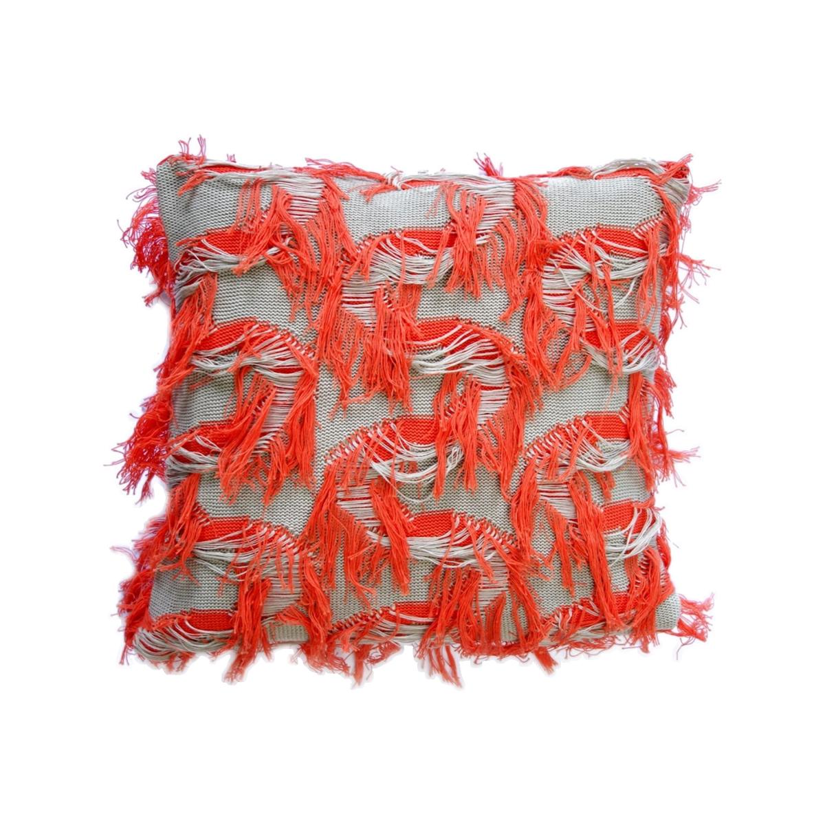 This pillow is made of 100% certified organic cotton from Italy in a special fringe knitting technique that has been developed by CCY currency for this collection. With this funky fringy object you are sure to bring some extra excitement in your living room, either just by itself or mixed and matched with another size or colour. This version has a greyish beige background and coral red fringes The pillow itself is filled with feathers from geese and ducks, made in Germany under OEKO-TEX® 100 standard. Like this, it is long-lasting and good for the environment of your home (no synthetic fibers or micro-plastics). The pillowcase has a zipper opening so it can be easily taken off the pillow to wash it. The pillowcase is made in Germany, the textile is made in Italy