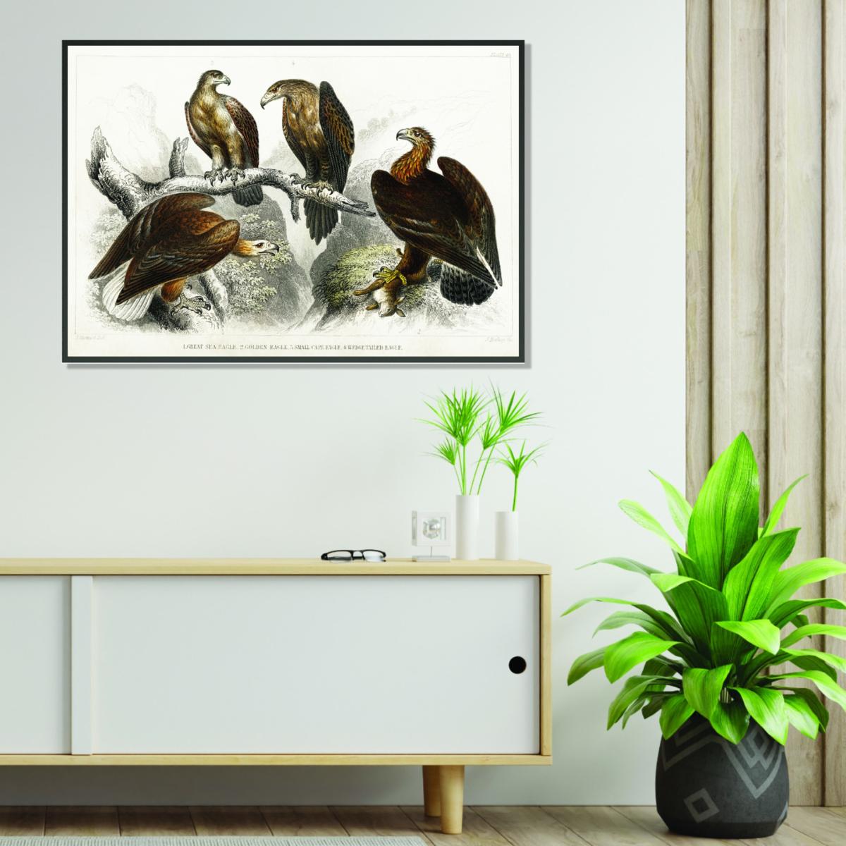 I love this print for its vintage charm and detailed illustration of eagles, making it a great focal point in a study, library, or traditional living space. Its neutral colour palette and natural subject matter lend themselves well to both heritage and rustic interiors, but it can also add an unexpected touch to modern schemes when paired with minimalist frames or sleek accessories. A practical tip is to frame it in a simple, understated frame to let the artwork stand out, and hang it at eye level in a well-lit area to truly appreciate the intricate details. This piece works particularly well above a sideboard, mantel, or in a gallery wall where the historical and natural aspects can be fully appreciated.