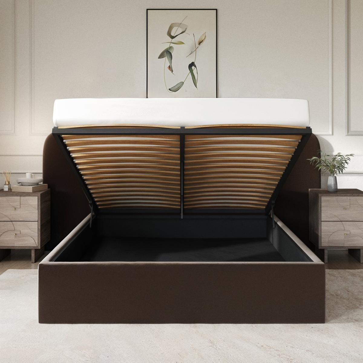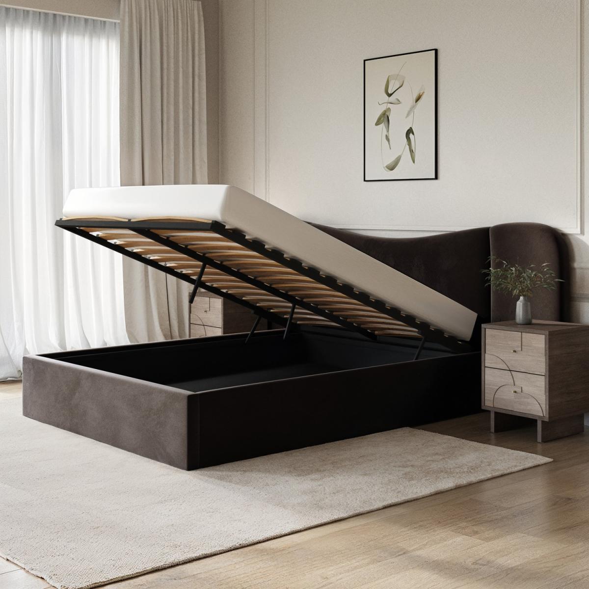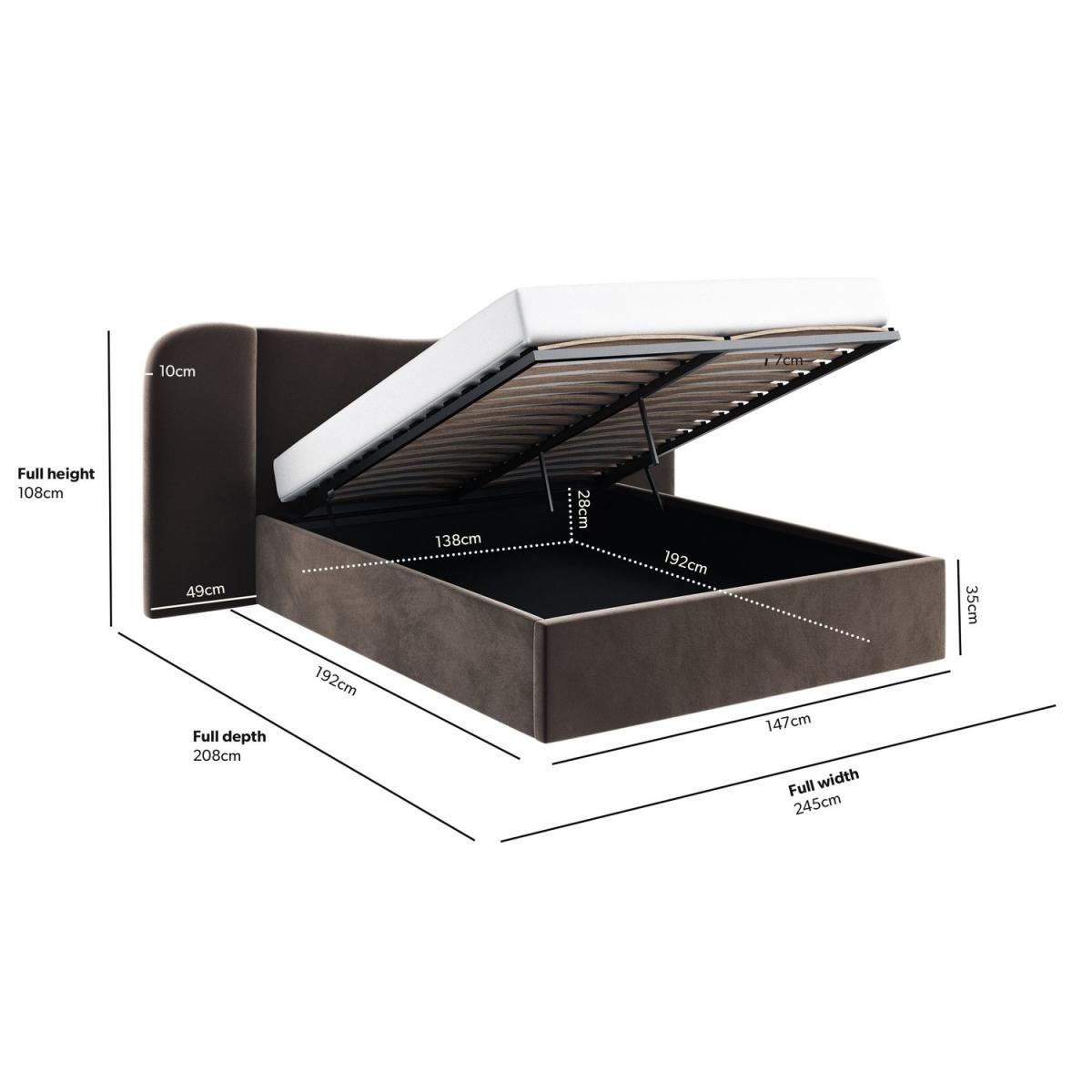 The plush, curved, wide headboard gives your bedroom a modern and sophisticated look. Convenient storage space accessible via a smooth gas-lift mechanism, ideal for bedding, pillows, or seasonal items. The storage compartment features a fabric-lined base, protecting stored items from dust and wear. Provides excellent support for the mattress, promoting airflow for added comfort and longevity. Soft, luxurious fabric in a versatile rich brown shade complements various interior styles. Ideal for maximising bedroom storage without compromising on style. Dimensions:W245 x D208 x H108 cm Inner storage dimensions:W138 x D192 x H28 cm (742. L) Packaging dimensions: Box 1: W201 x D38 x H21 cm / Box 2: W115 x D53 x H22.5 cm / Box 3:W154 x D110 x H12 cm / Box 4: W144 x D19 x H12 cm Weight: 71.8kg Max supported weight: 300kg Bed mattress size: Double (4ft6) Colour: Brown Finish: Upholstered Material: Velvet Filling: Foam Bed base: Sprung-slatted Storage Base: Fabric non-woven Storage opening: End-lift Assembly required: Yes Mattress Included: No Please be advised the ottoman lift mechanism supports a weight of up to 55kg when open