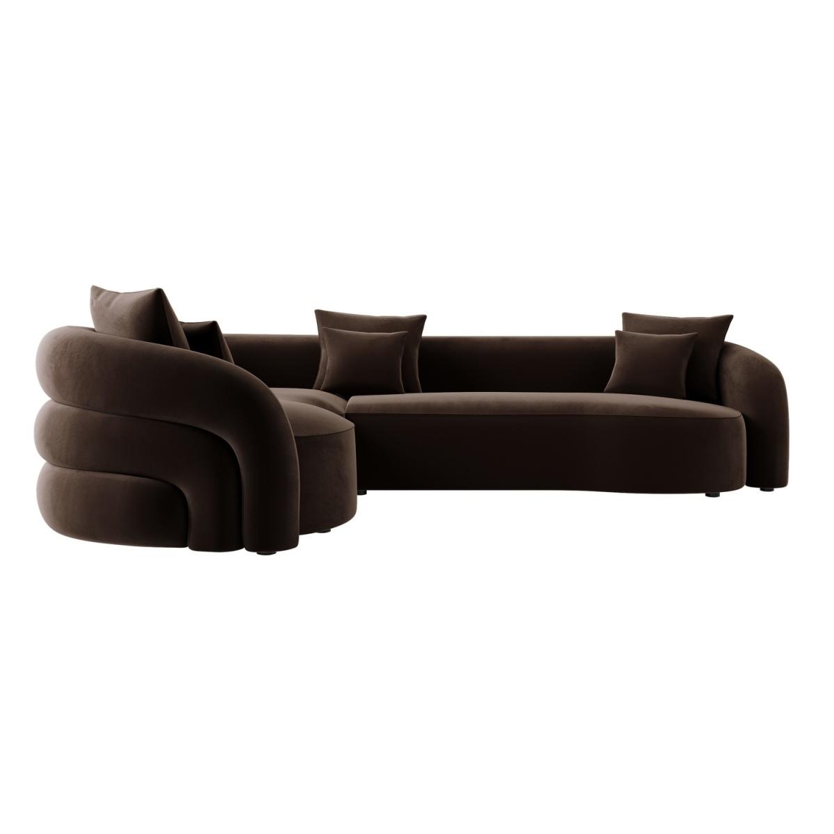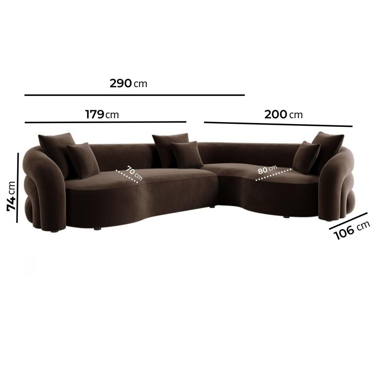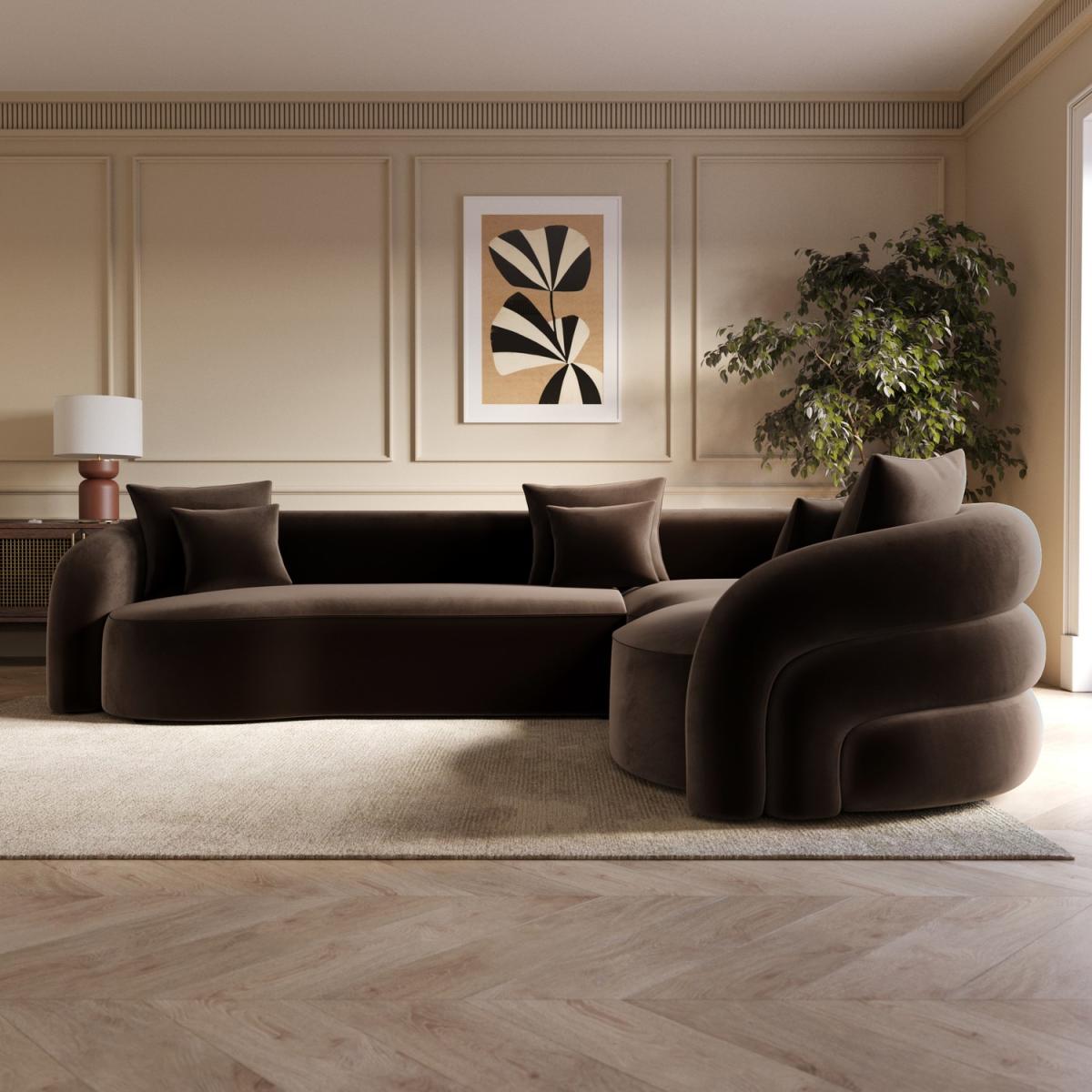 Foam filled Scatter Cushions Included Luxurious chocolate brown velvet fabric, offering both comfort and style. The soft-to-the-touch velvet upholstery provides a cosy, sophisticated feel, making it the perfect statement piece for any modern home. Adds a modern and contemporary touch to any living space. Comfortable seating for up to four people, ideal for family use or entertaining guests. Comes with three big cushions and three small cushions for added comfort and style, perfectly complementing the sofa's stylish design. Built with a strong frame for longevity, ensuring this sofa stands up to daily use. Avoid direct sunlight to prevent fading, and gently vacuum or brush to keep the velvet clean and dust-free. The Zuri 4-seater Curved Corner Sofa combines style and comfort with its inviting curves and layered cushioning, creating a cosy and classy feel in any room. Perfect for corners, this beautiful sofa is made with soft chocolate brown velvet fabric and comes with six matching scatter cushions for added comfort. Its modern curved shape brings a fresh, contemporary look, making it perfect for relaxed lounging and the ideal centrepiece for both stylish and welcoming living spaces.