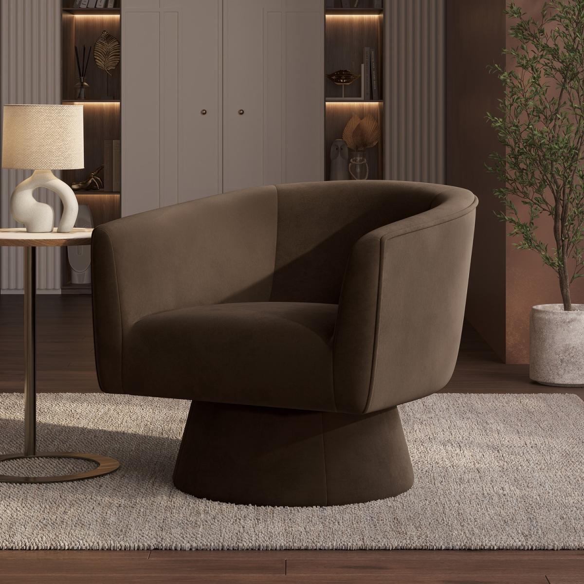 I love this swivel chair for its modern yet cosy vibe, making it a versatile piece for both contemporary and classic interiors. The rich velvet in warm brown adds a touch of luxe and works particularly well in neutral schemes or warm colour palettes. It’s perfect as an accent piece in a living room or a reading nook, offering both comfort and style. Practical styling tips include pairing it with soft throws or textured cushions to soften its sleek silhouette, and placing it next to a side table for convenience. Its swivel function also makes it a functional addition to social spaces or home offices, fostering easy conversations or fluid movement around the room.
