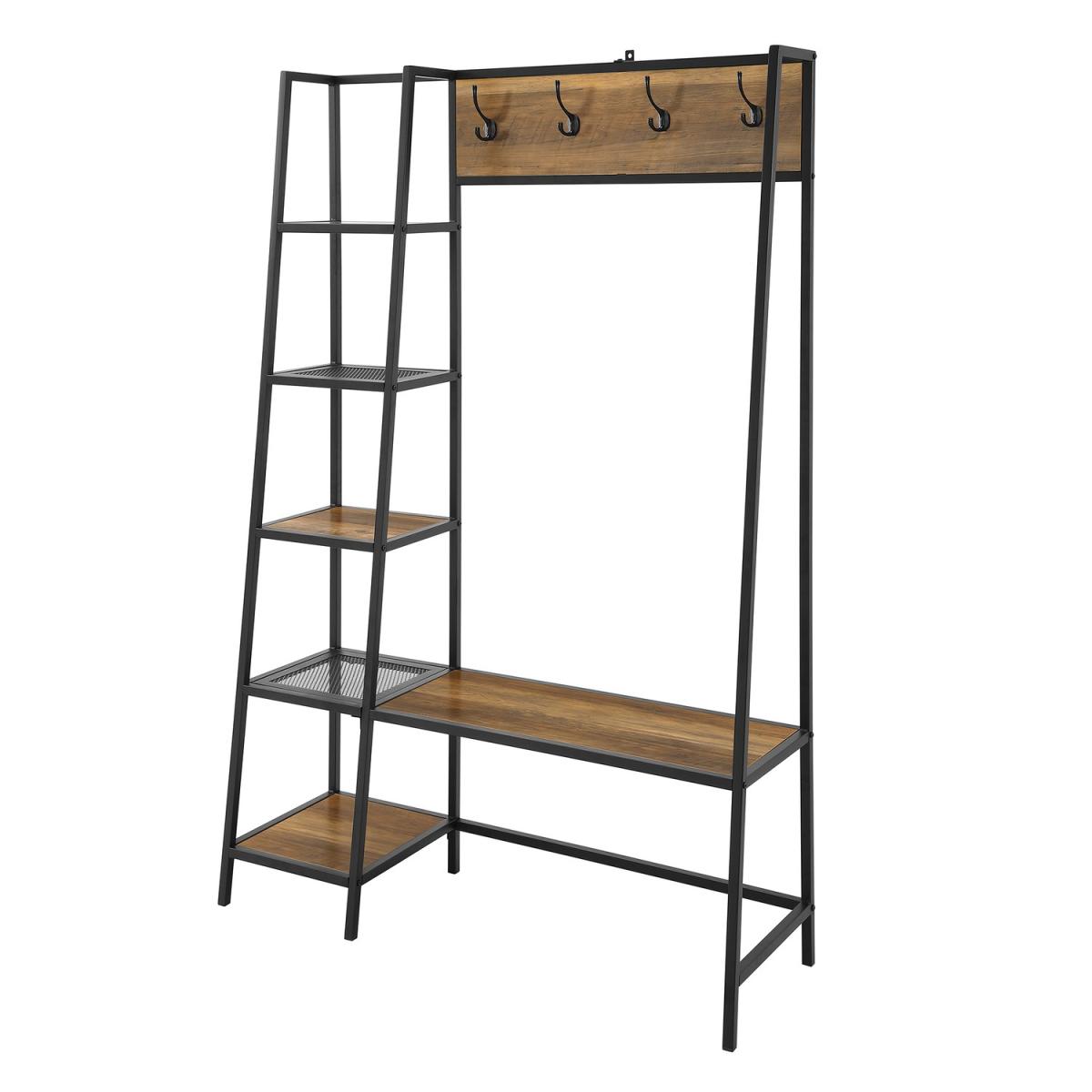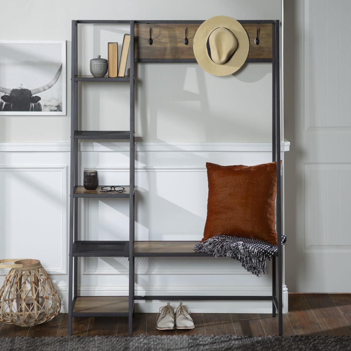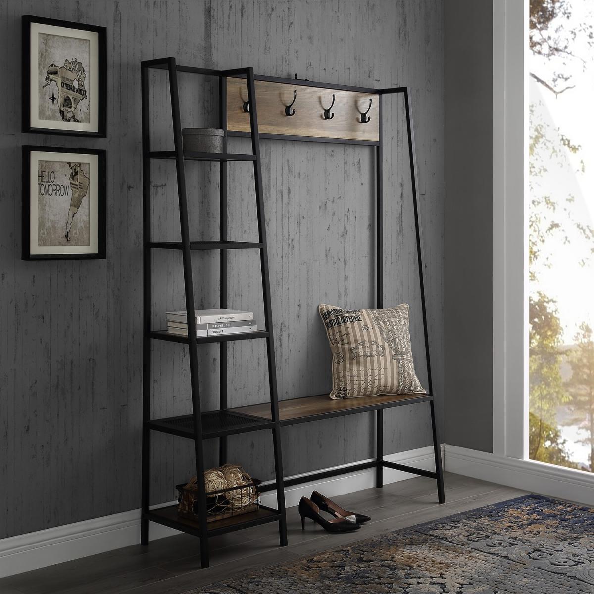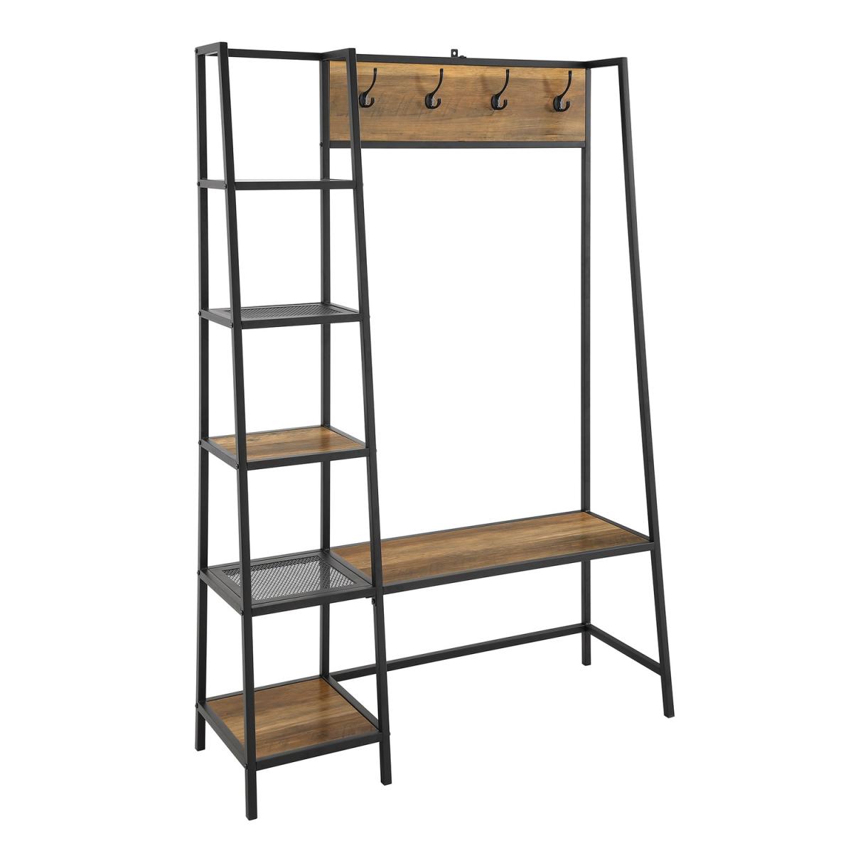 Dimensions H173 x W117 x D41 cm. Transform your entryway with this modern industrial style hall tree. Our hall tree creates the perfect spot to place your daily items for easy access before heading out the door. With five side shelves four top hooks and a bench that can also be used as a shelf this piece is truly versatile. A metal frame keeps the structure sturdy with durable laminate and mesh metal shelving. Sit on the bench to put on your shoes unhook your jacket from above and grab your bag on one of the shelves just in time to leave your home. Features. With a blend of metal and durable laminate for a strong design. With a melamine finish that helps resist to moisture. Featuring a modern industrial style. Includes wall mount hardware for added stability. Step-by-step instructions for ease of assembly Assembly required..