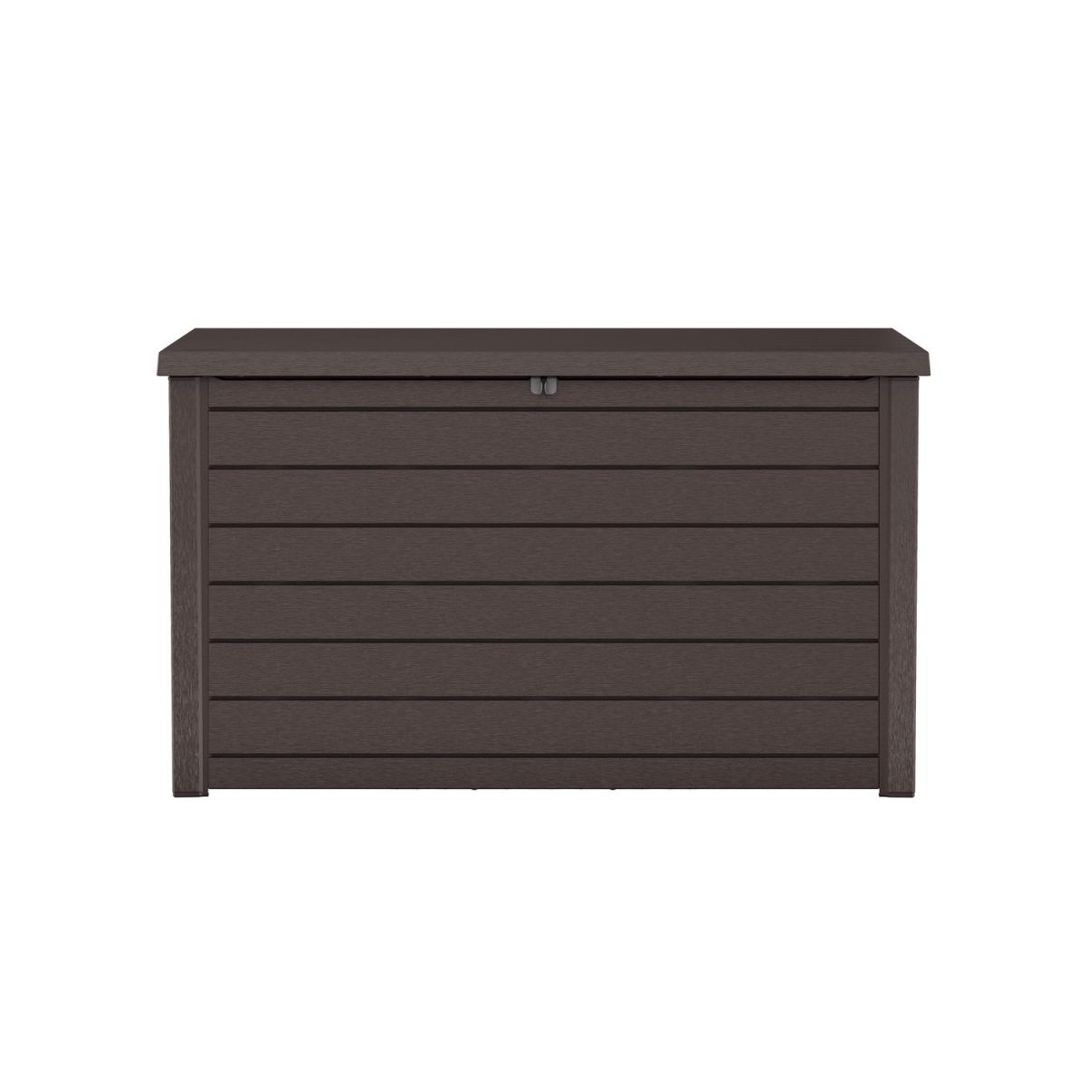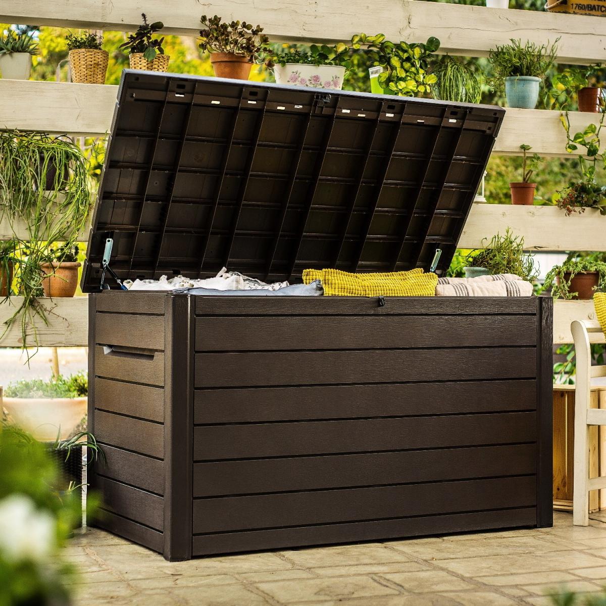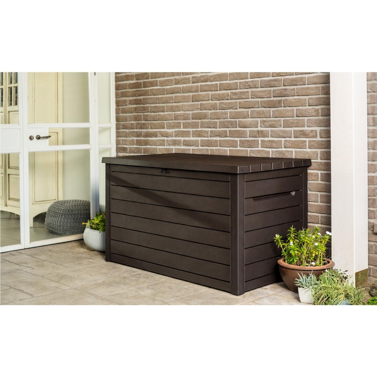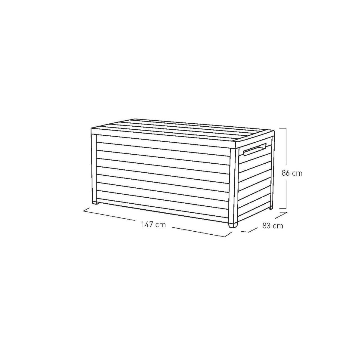 Dimensions H86cm x W147cm x D83cm. The brown large outdoor deck box features a wood look finish resembling the look and feel of wood. includes built-in handles for easy transportation and repositioning. Its weather resistant-resin material wont rust peel or need any further maintenance ensuring product durability to enjoy for years to come making it the Ideal storage for garden or pool areas. Features. Brown large outdoor deck box 870L. Weather resistant-resin non-fade and UV-protected. Lockable to keep items safer. Features built-in handles and piston automatic lid mechanism230 G/ 870 L capacity..