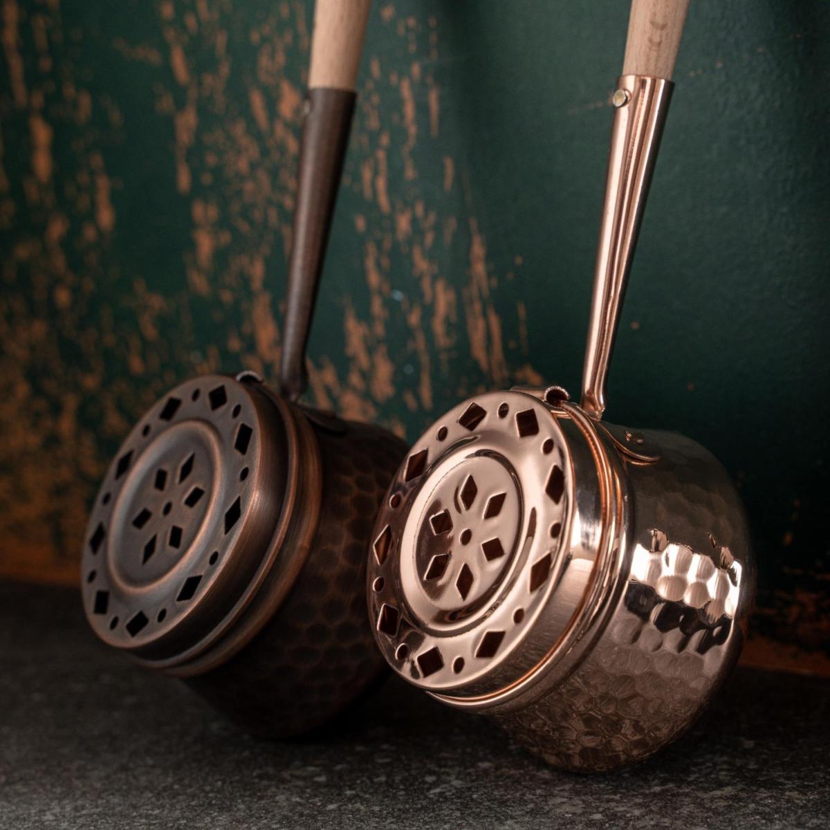 Create a serene and calming atmosphere with the Zen Handcrafted Hammered Copper Incense Burner. Beautifully crafted from pure copper with a rich dark finish, this piece blends traditional artistry with functional design. Its hammered texture adds a rustic elegance, while the ventilated lid allows for controlled, even burning of incense. The wooden handle provides a comfortable grip, making it easy to move while in use. Perfect for meditative practices, spiritual rituals, or simply adding a touch of sophistication to your home decor, this burner is as versatile as it is beautiful.