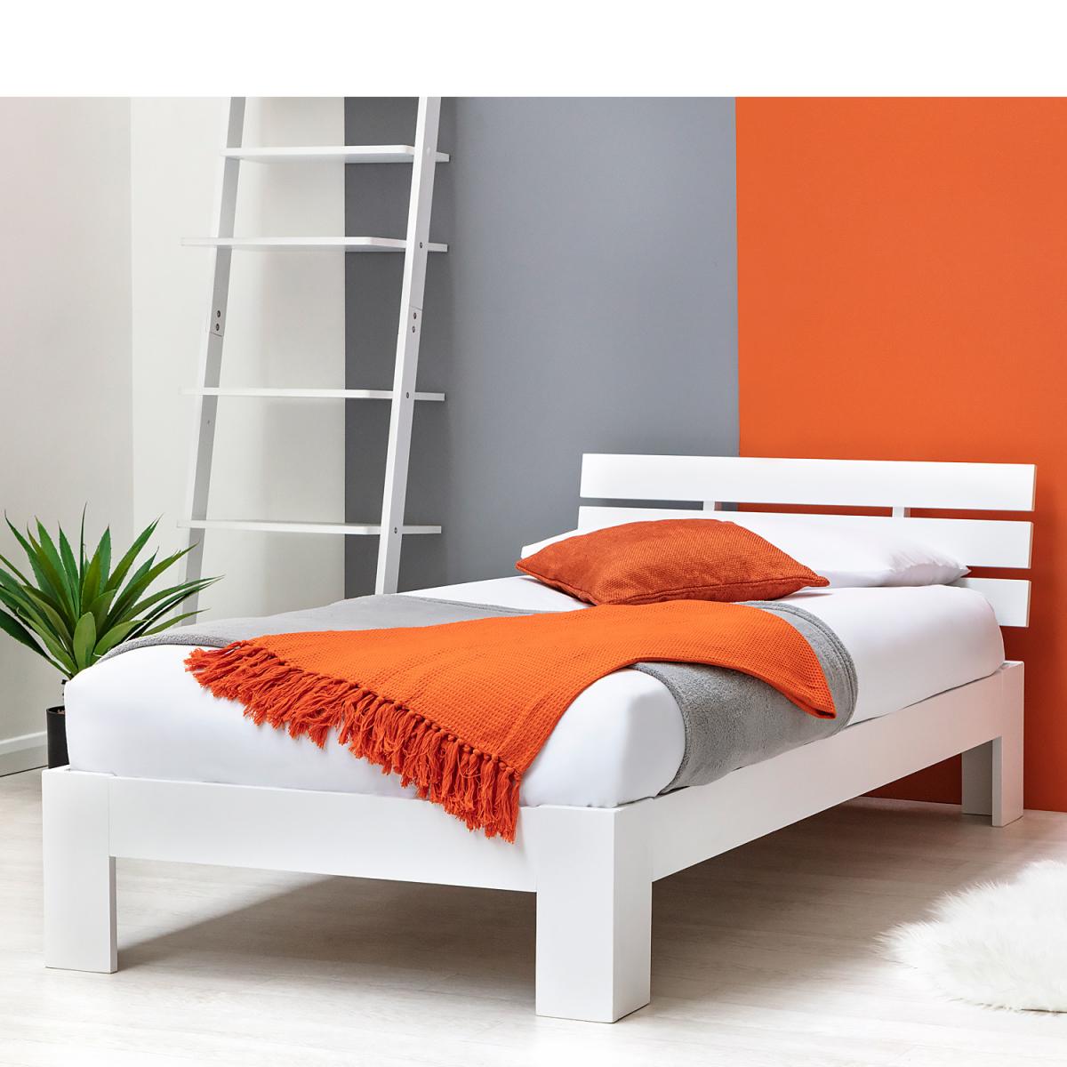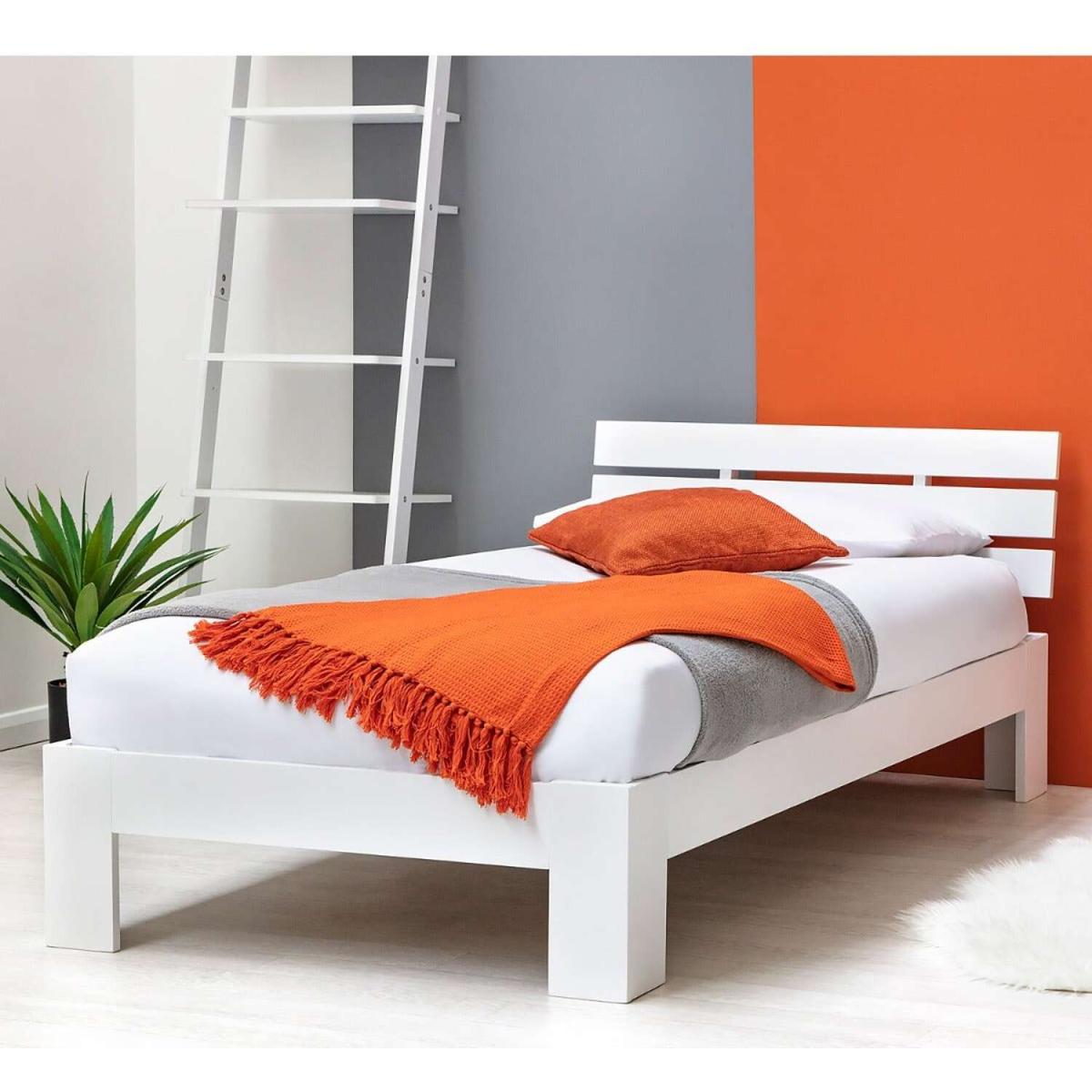 The Broxton white wooden bed frame is a contemporary low platform style bed frame. The bed is very low to the ground, ideal for rooms with slanted, or low ceilings. The wooden bed frame features a slanted slatted headboard design, with a crisp white painted finish, is and fitted with solid slats. The bed comes in one box for easy handling. NOTE This bed frame is very low to the floor. Please double check measurements before purchase. The headboard depth is very shallow. We advise if you want the headboard to be on show to purchase a mattress with a shallow depth.