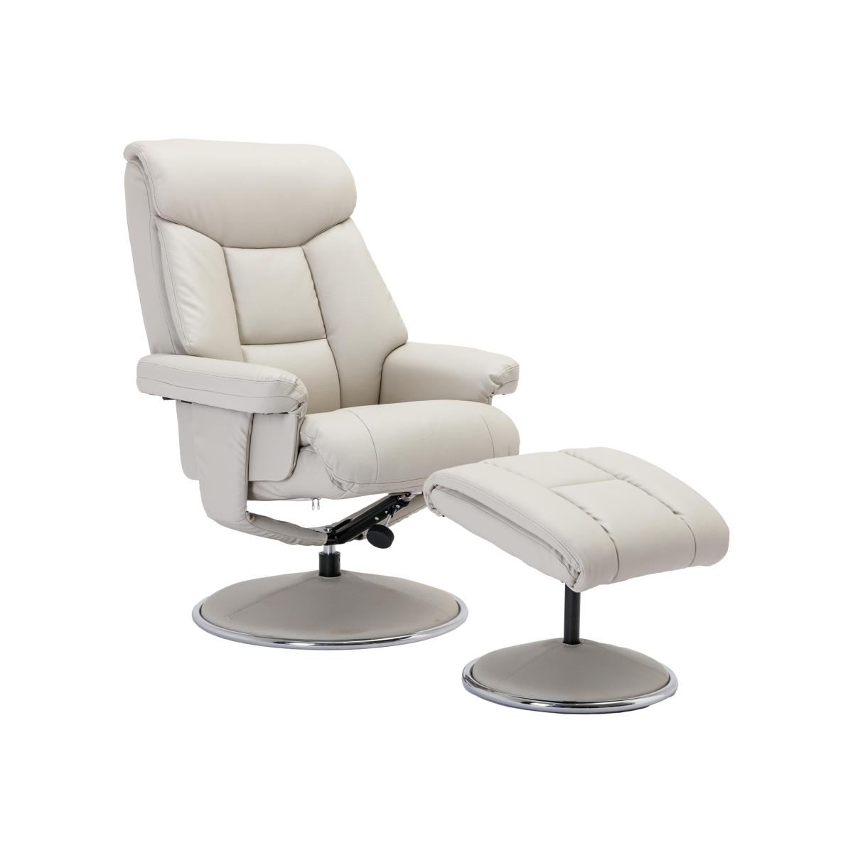 Cool contemporary good looks with cocooning, reclining comfort. The Bruges swivel recliner chair with footstool looks and feel so good, you won’t believe the price. Why you’ll love it High-backed, deeply supportive comfort. Clean lined contemporary style. The compact scale suits smaller spaces. Soft-touch faux leather upholstery looks and feels like real leather. In a choice of chic, sophisticated shades. Sumptuous headrest, winged back cushions, wraparound arm cushions. ‘Easy twist’ handle operates the manual recliner. Chair and footstool have round upholstered bases with a chrome trim. What you need to know Strong metal frame. Resilient foam and fibre cushioning. Some fabrics can show wear on areas of more use or in direct sunlight. Smoothing seat cushions prevents ‘puddling’. Please read our upholstery care guide for more advice. Allow time for recliners to settle. Minor gaps for motion vary by floor type. Manual recliners may feel stiff at first, but will ease with use.