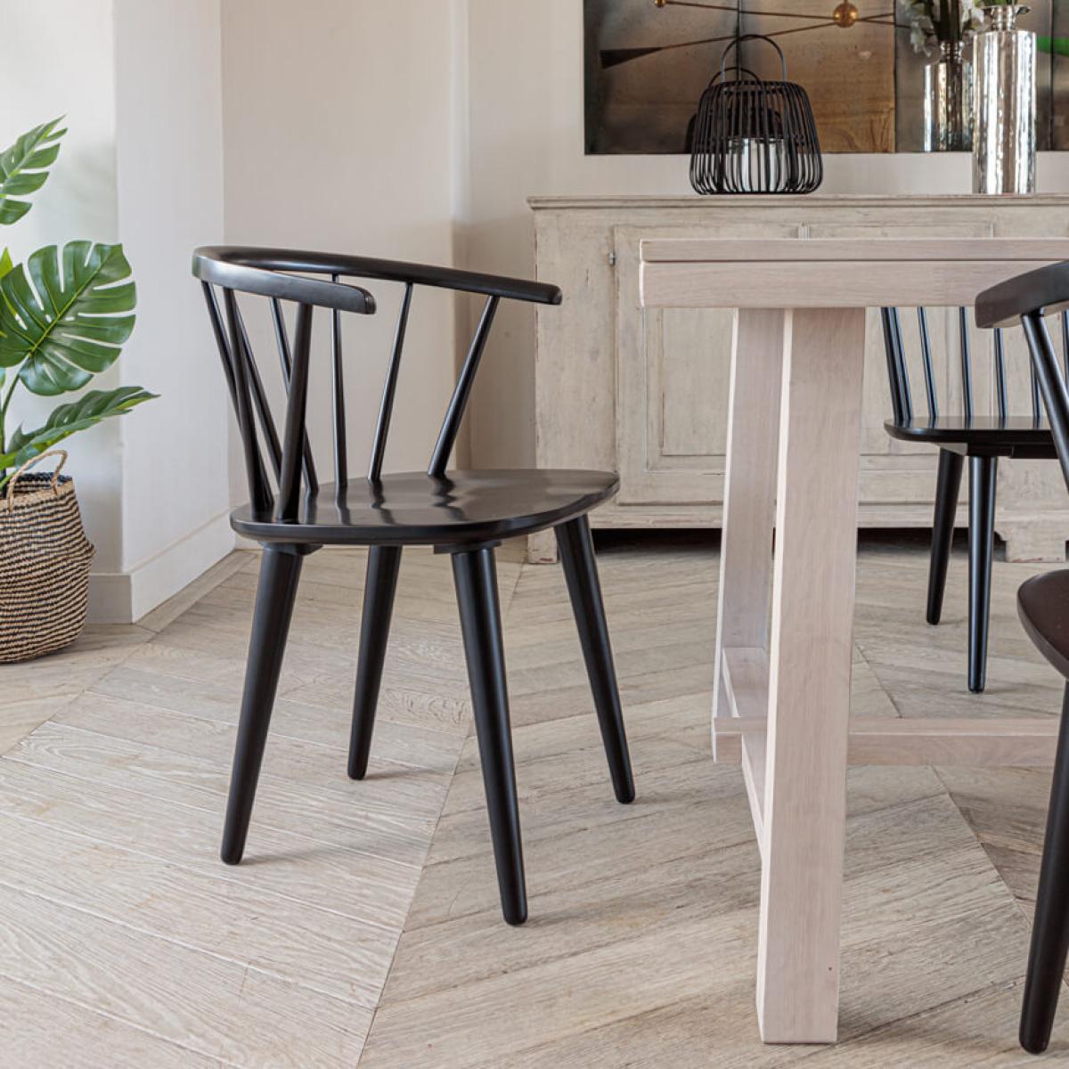 This wonderfully unassuming and elegant wood dining chair will slot nicely into many homes. A classic design has been updated for the modern home, with more than a hint of timeless Victorian farmhouse influence. A lovely lacquered black coat finish is applied to the rubberwood design, with a seat that is set to ever so slightly backward tilt for optimum comfort. A horseshoe band of wood binds the strut design and also acts as a handy elbow rest, all the while staying true to the time honoured Windsor design of this wooden dining chair. This classic wooden furniture will easily pair with a number of dining tables but we especially recommend adding to the sleek. Kitsilano Solid Oak Dining Table. , where it features in our. Kitsilano pre-determined dining sets. If you like this chair, we also have a. Matching dining bench. Check out the other. Colour variations. Of this chair – Grey, True White and Whitewash.