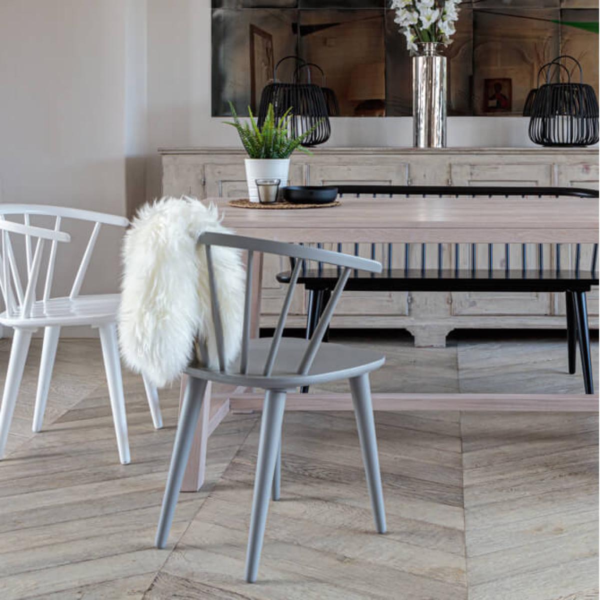 This chair design is based on a classic styled ‘Windsor chair’ but with some crucial modern touches which mean it could just be the dining chair to pair with absolutely any modern dining table. A frame made entirely of rubberwood has been lovingly lacquered in an original and stand out engine grey tone, the lacquering of this modern dining room seat not only offers an attractive matte glint but will ensure quality for years to come. A horseshoe shape band binds the spindles together but also acts as a handy elbow rest. The sleek chair legs splay which adds a modern flare to this classic design. You could pair this with any number of modern dining tables but it does go especially well alongside the Kitsilano dining range. This attractive spindle wooden dining chair comes in three other colours (black, white and whitewash), all of which feature in the Kitsilano pre-determined dining sets.