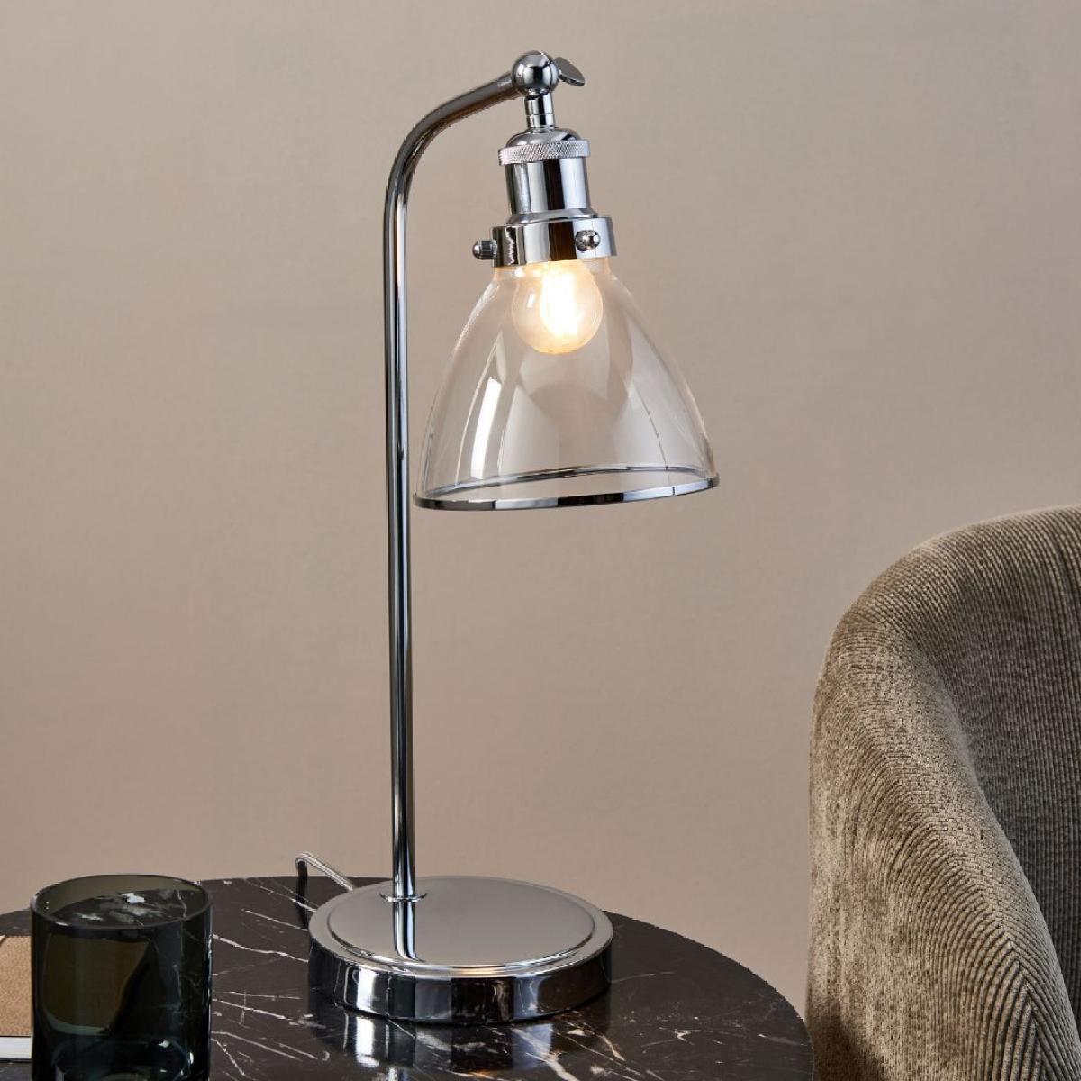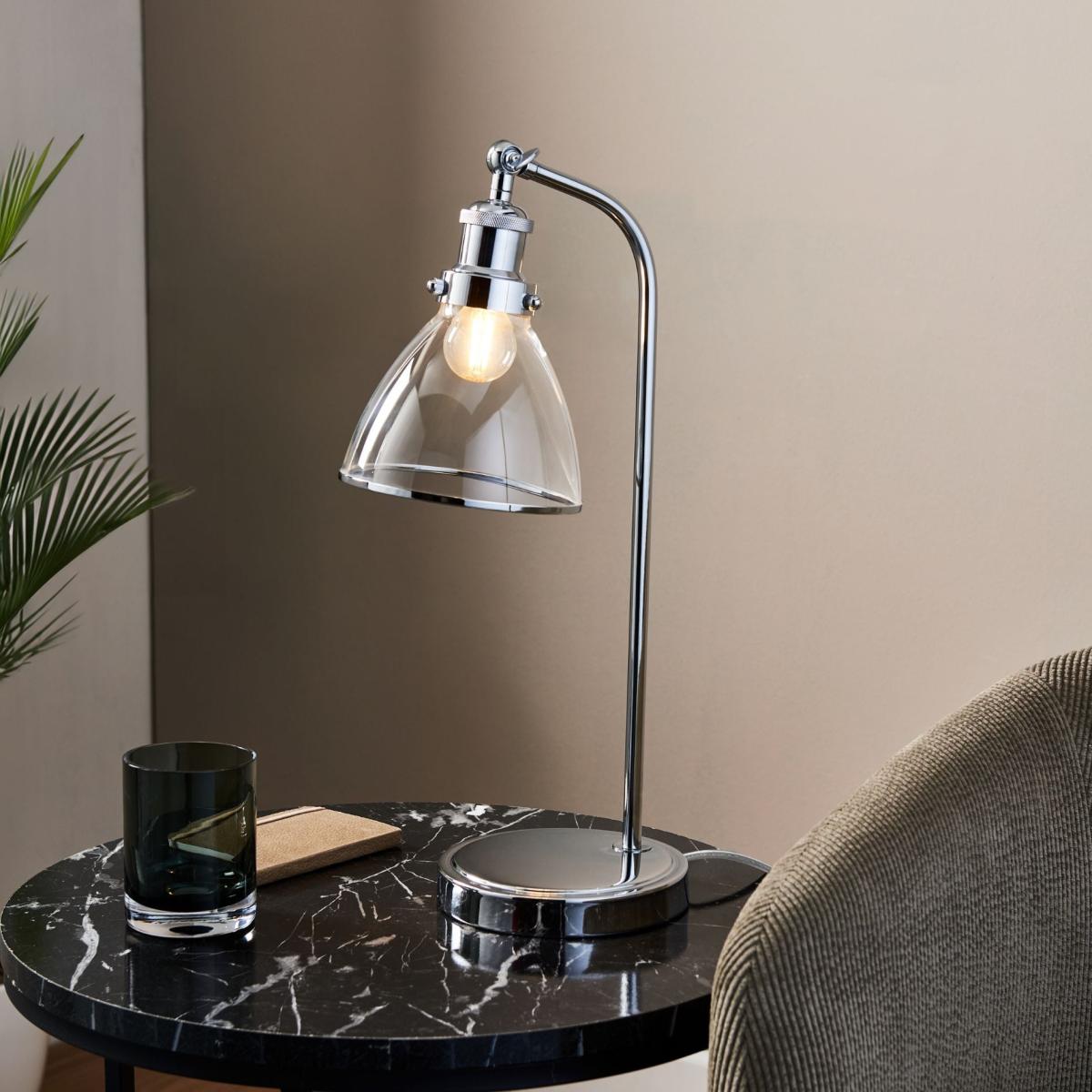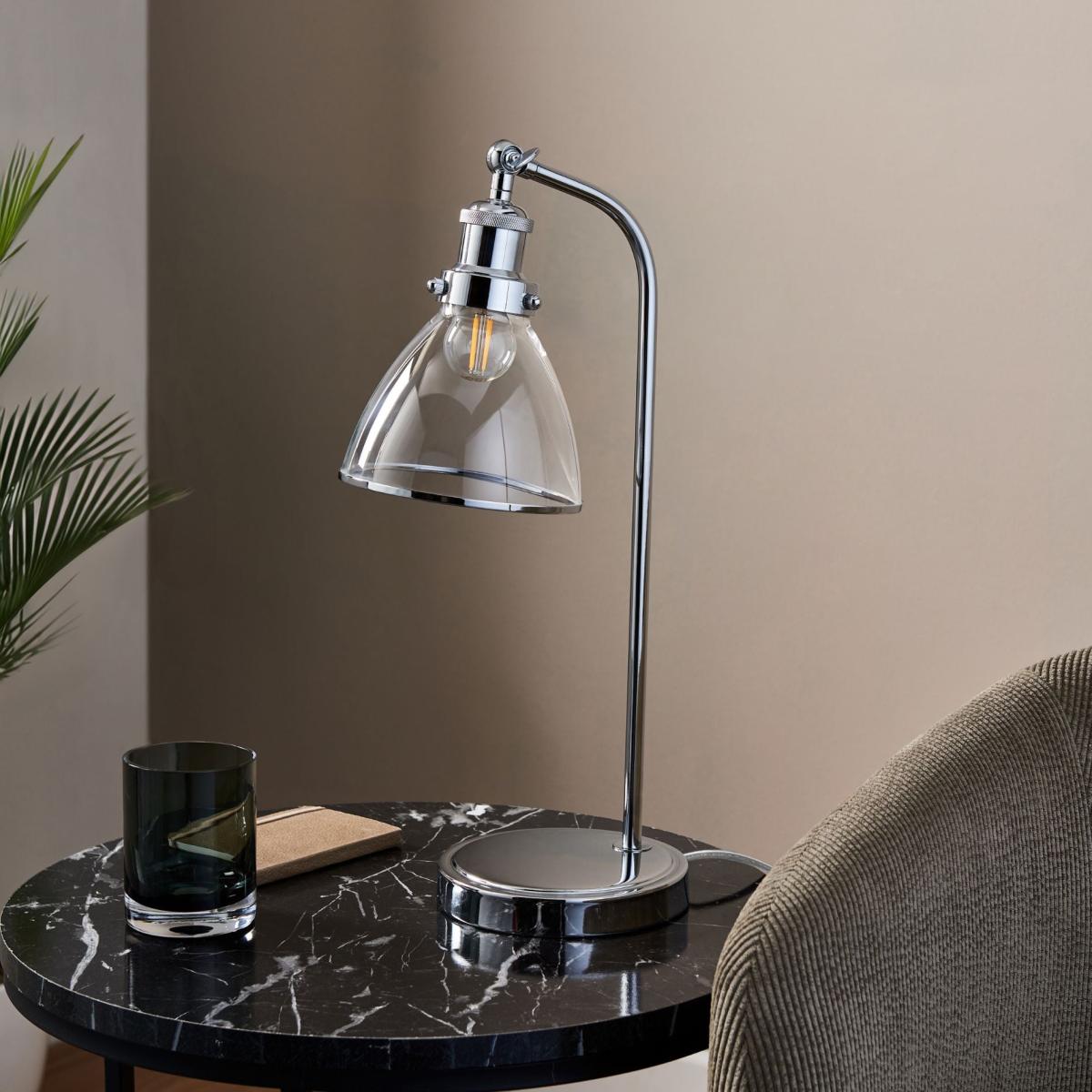 Brunswick 1-light table lamp, featuring a glass shade and a polished chrome finish. Brunswick 1-light table lamp, featuring a glass shade and a polished chrome finish.