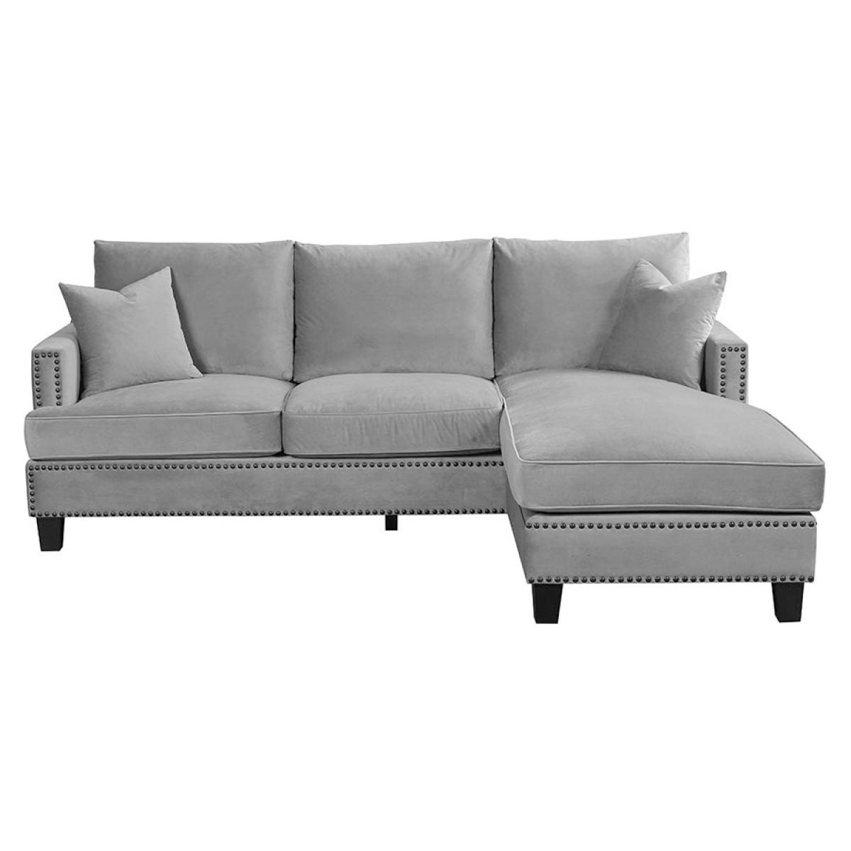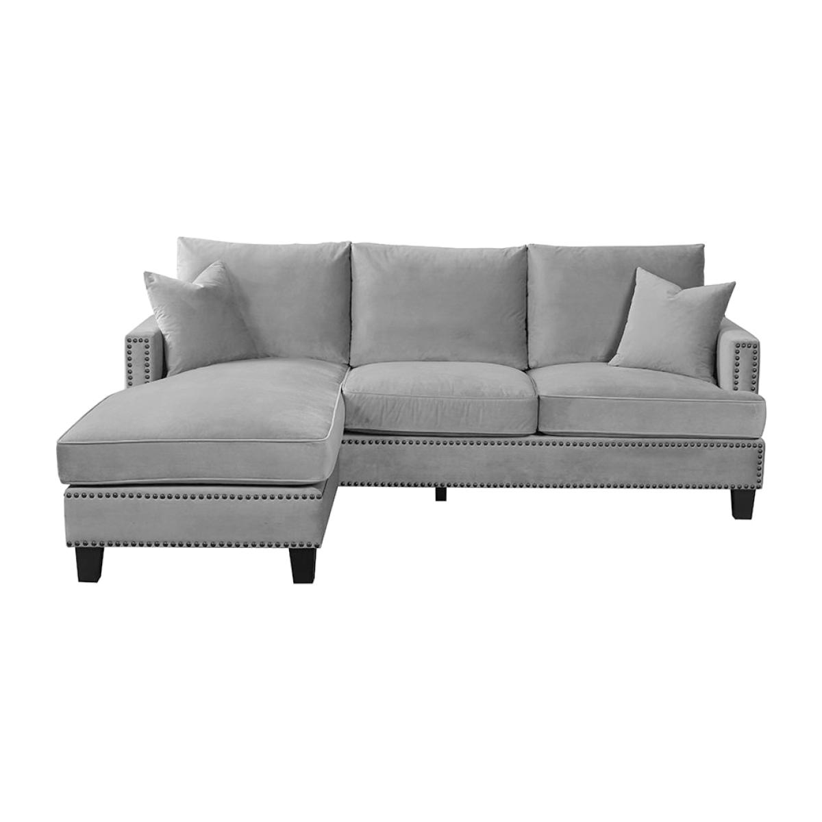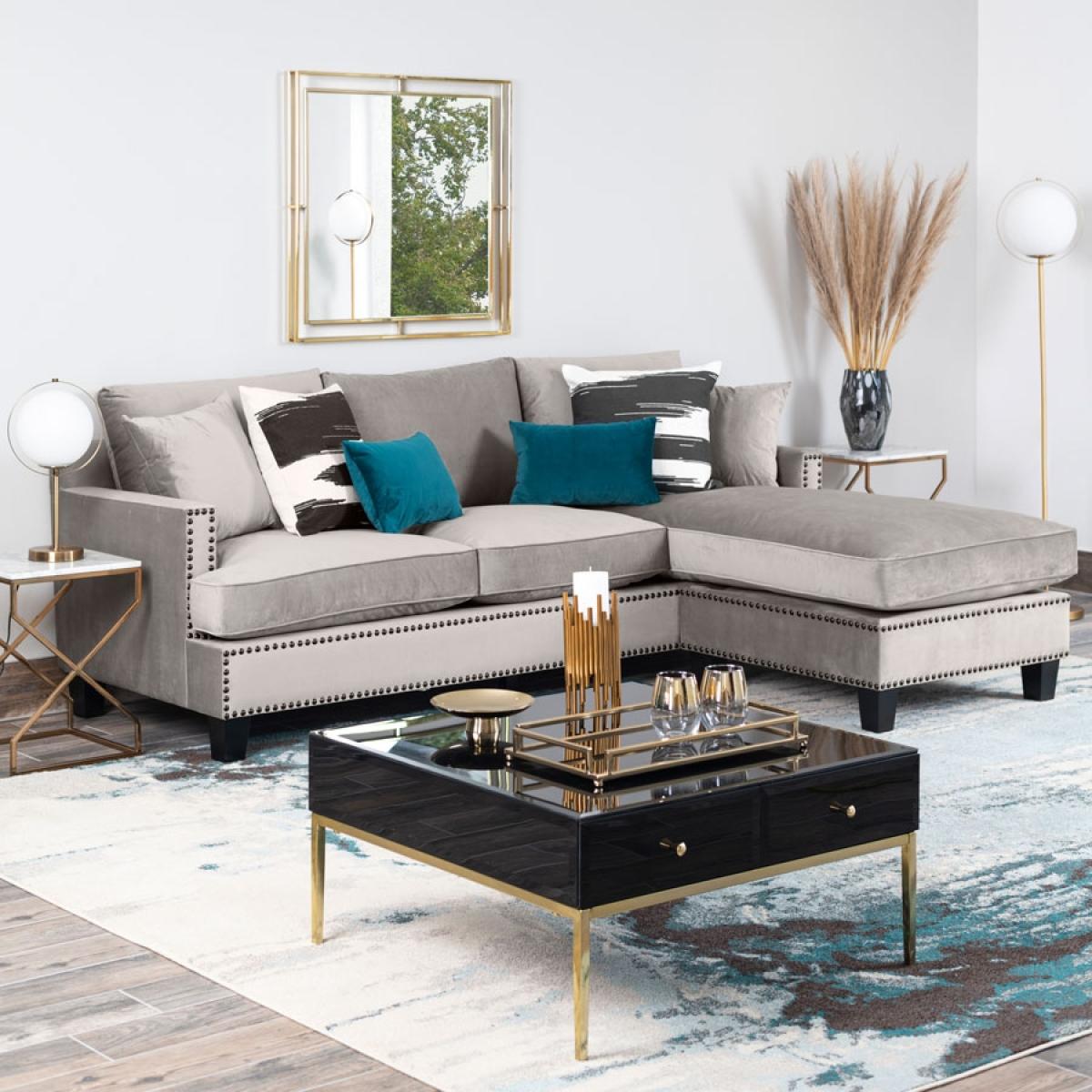 Handsome, contemporary corner sofa, designed for maximum comfort. The footstool section can be repositioned to create a right or left-hand corner sofa as required. Generous deep seat and back cushions filled with a combination of feather, foam and fibre. Two feather and foam-filled scatter cushions included. Sprung seat and backrest. Solid ash legs with dark brown stain. Oversized upholstery studs with bronze finish. Velvet upholstery fabric. Free returns on sofas if you change your mind within 7 days. Simply notify us, put the sofa back in the box, and we will collect it and send you a full refund. (This offer excludes Scottish highlands and islands & any Ireland addresses).