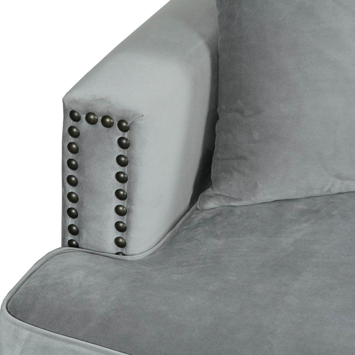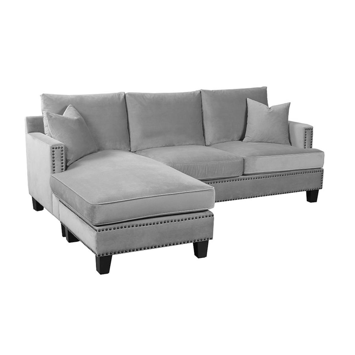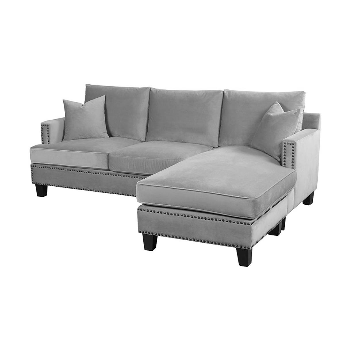 Handsome, contemporary corner sofa, designed for maximum comfort. The footstool section can be repositioned to create a right or left-hand corner sofa as required. Generous deep seat and back cushions filled with a combination of feather, foam and fibre. Two feather and foam-filled scatter cushions included. Sprung seat and backrest. Solid ash legs with dark brown stain. Oversized upholstery studs with bronze finish. Velvet upholstery fabric. Free returns on sofas if you change your mind within 7 days. Simply notify us, put the sofa back in the box, and we will collect it and send you a full refund. (This offer excludes Scottish highlands and islands & any Ireland addresses).
