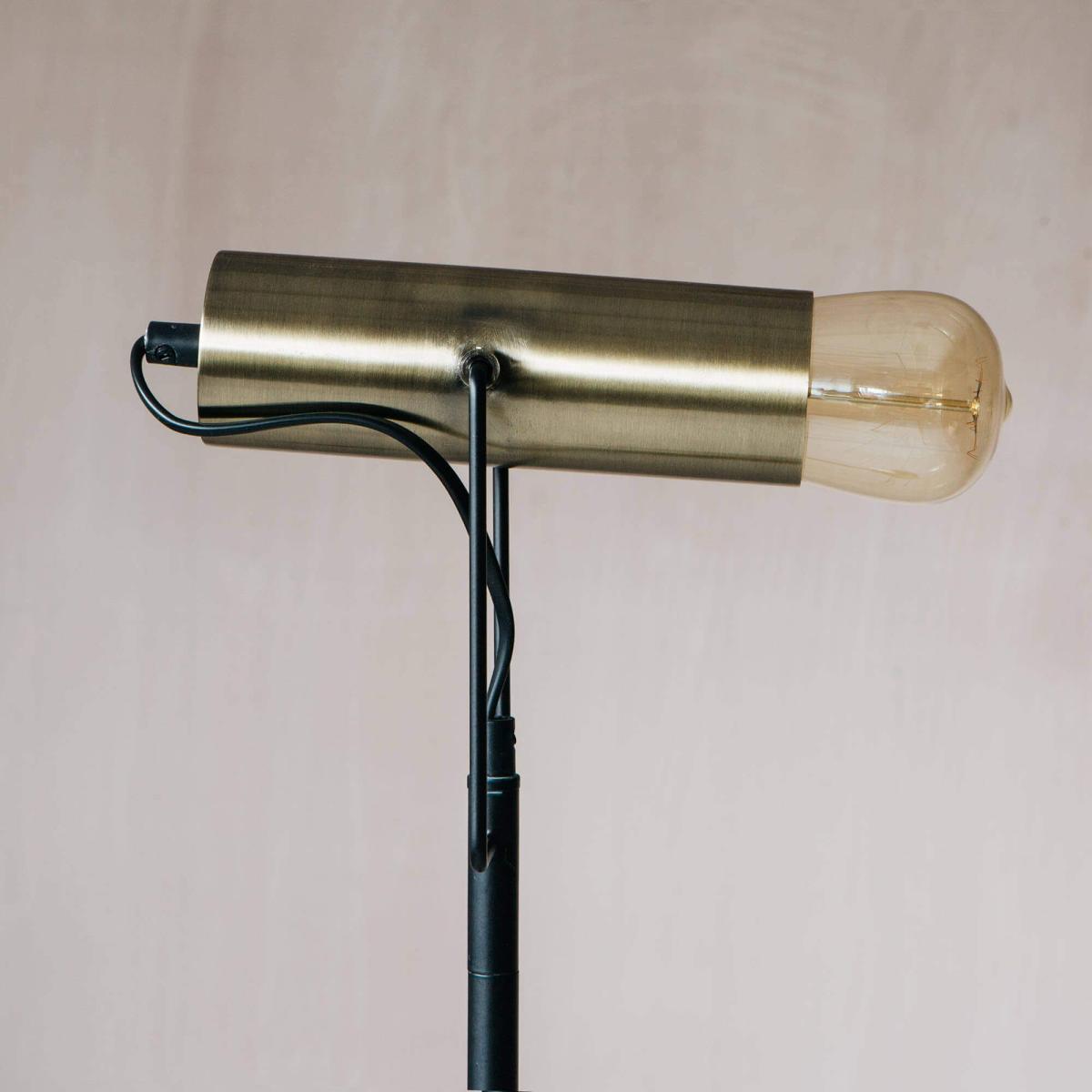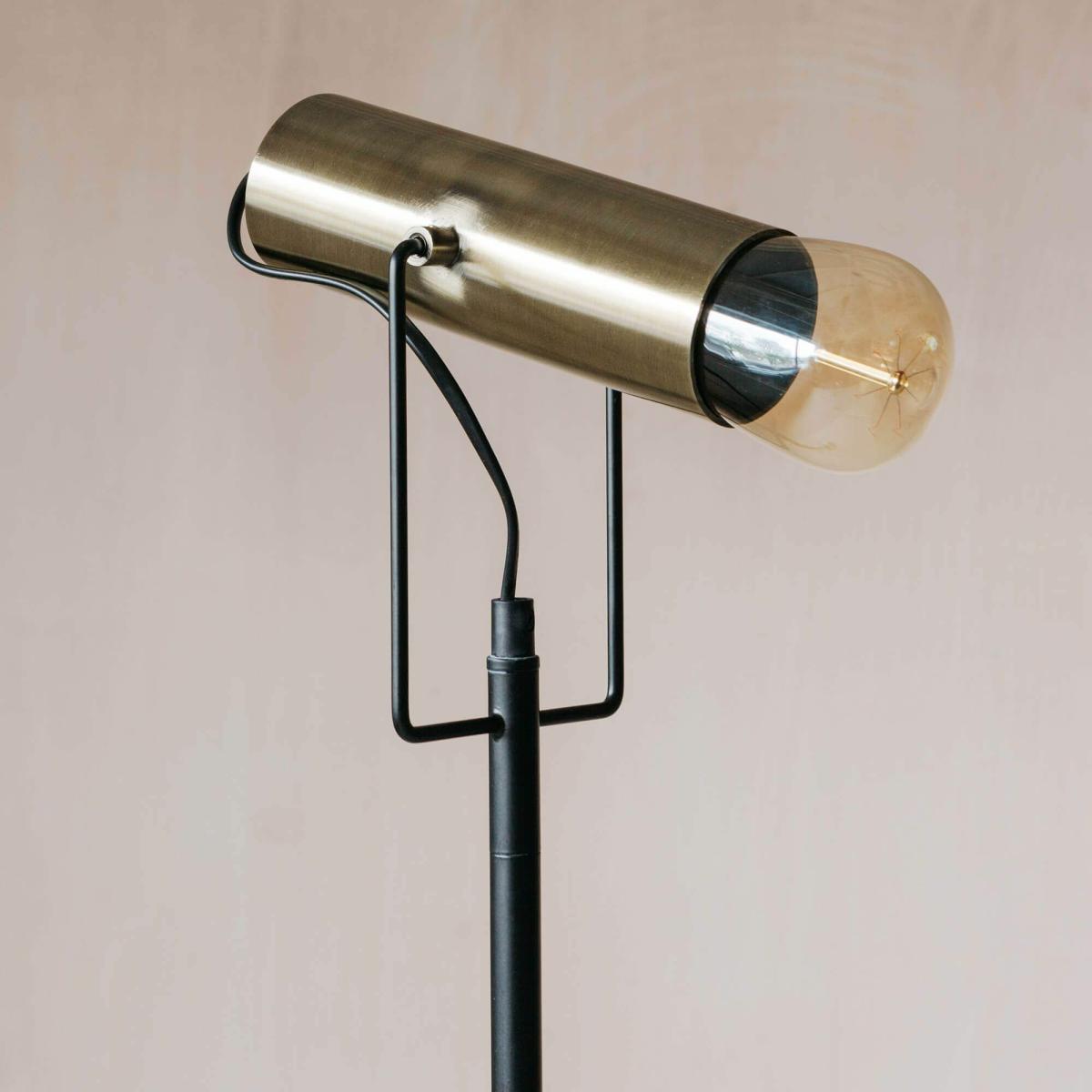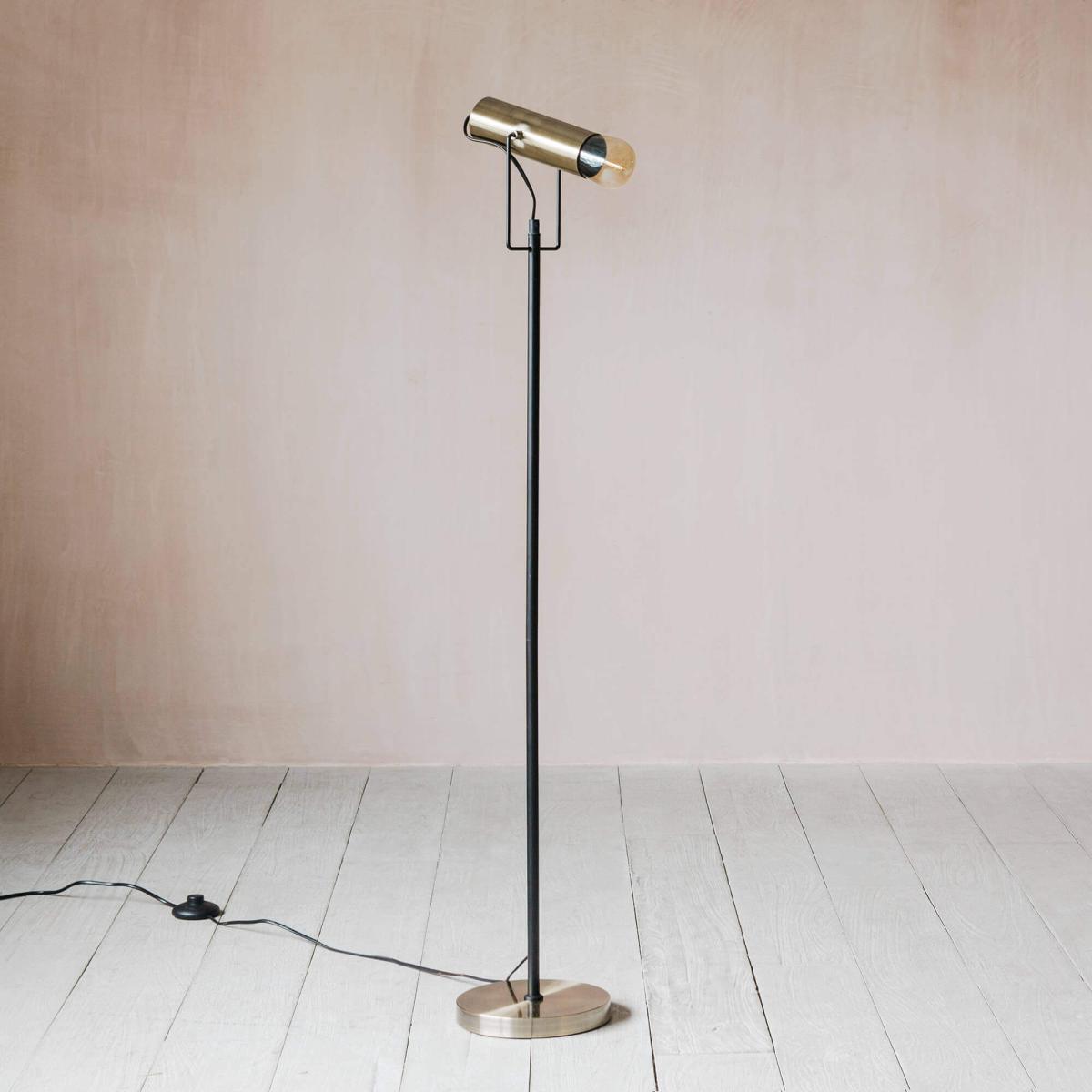An elegant floor lamp with an angled shade like a camera lens and a smooth brass finish, create cinematic spotlights around your home.