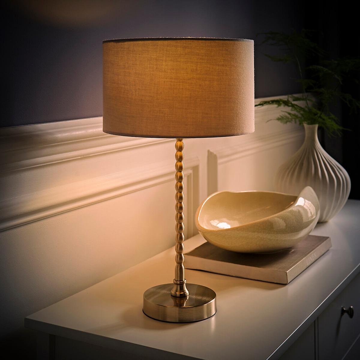 This is the table lamp that's all about stacking up the style! Featuring a sleek brushed metal base with a trendy stacked bobble design, it's a true statement piece. Paired with a fabric shade, this lamp adds a touch of elegance and warmth to any room. This versatile table lamp brings playful charm and sophistication, perfect for creating a personalised look. Ready to light up your space with style? this lamp the perfect foundation for your chic lighting design!