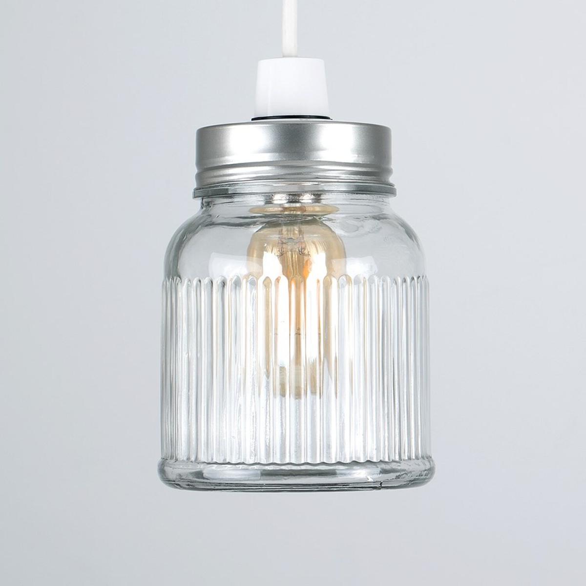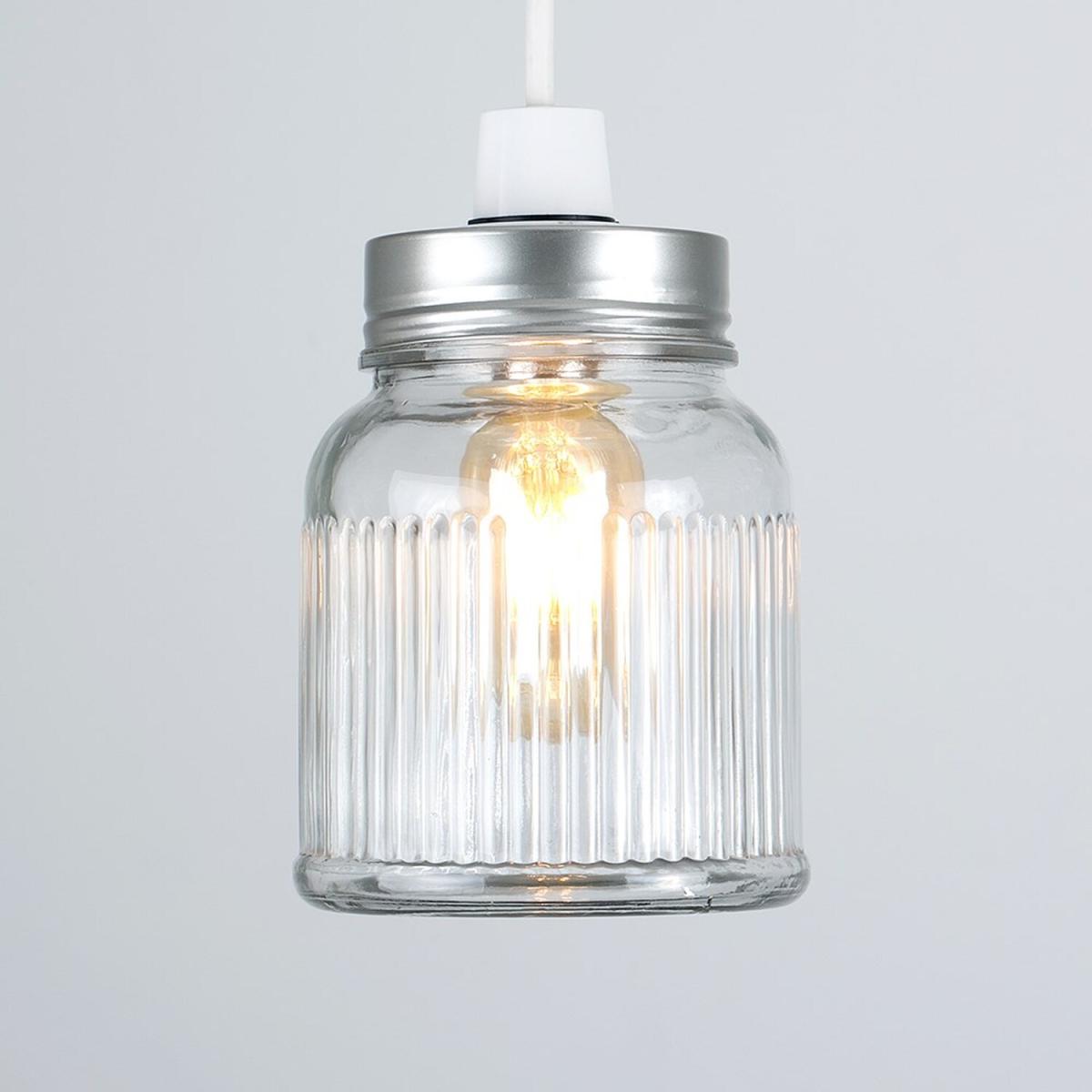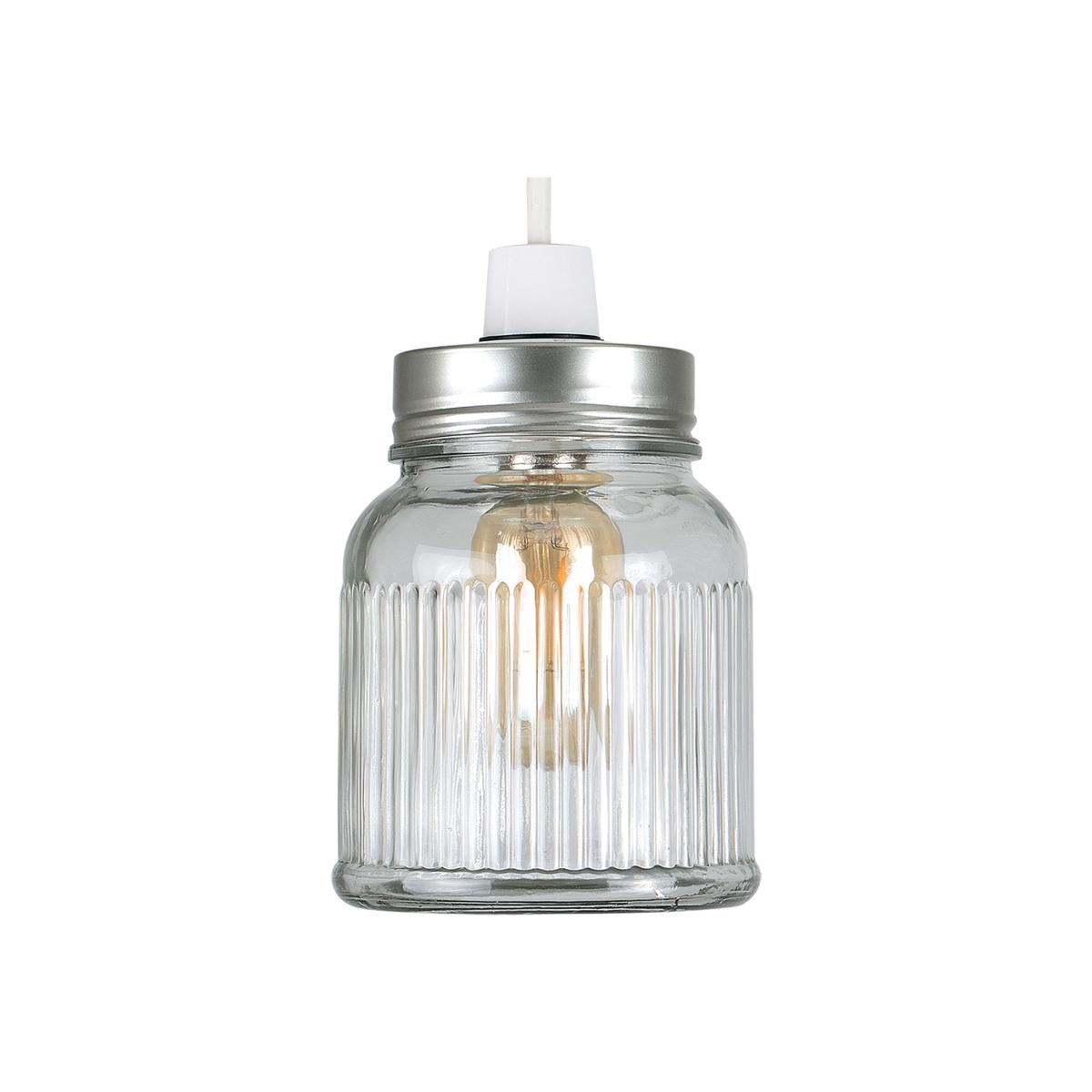 Retro style jar ceiling pendant light shade with a silver brushed chrome lid and clear textured ribbed pattern glass finish. Ideal for living rooms, bedrooms, dining rooms and hallways. Easily fits to a ceiling light socket - no electrical installation required. Ceiling lights are usually the main source of illuminating a room but with the many styles on offer today, also become a main focal point or talking point. The right fitting can make a real style statement and complete your living space look. 1 x 40w BC B22 Bulb Is Required - Not Supplied.