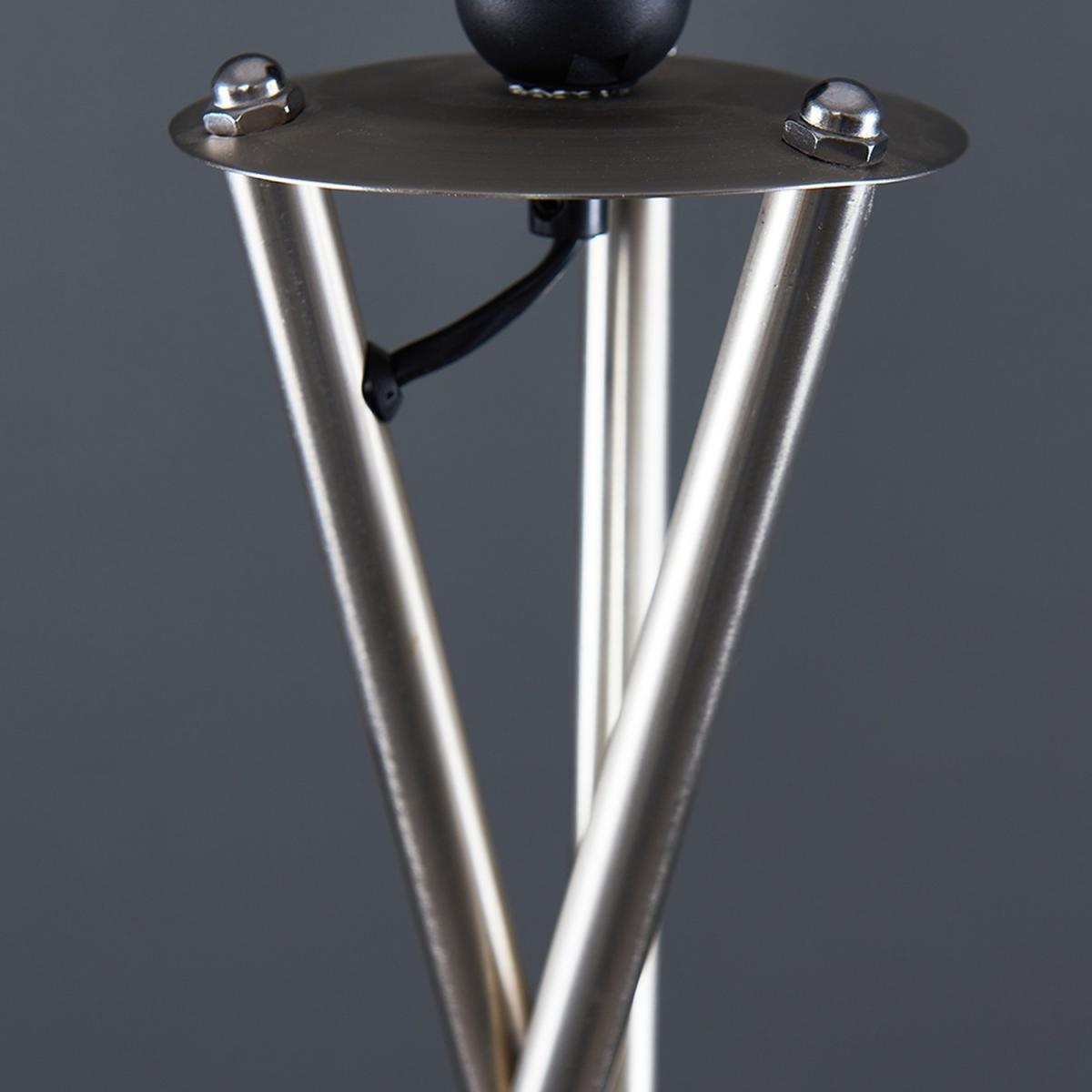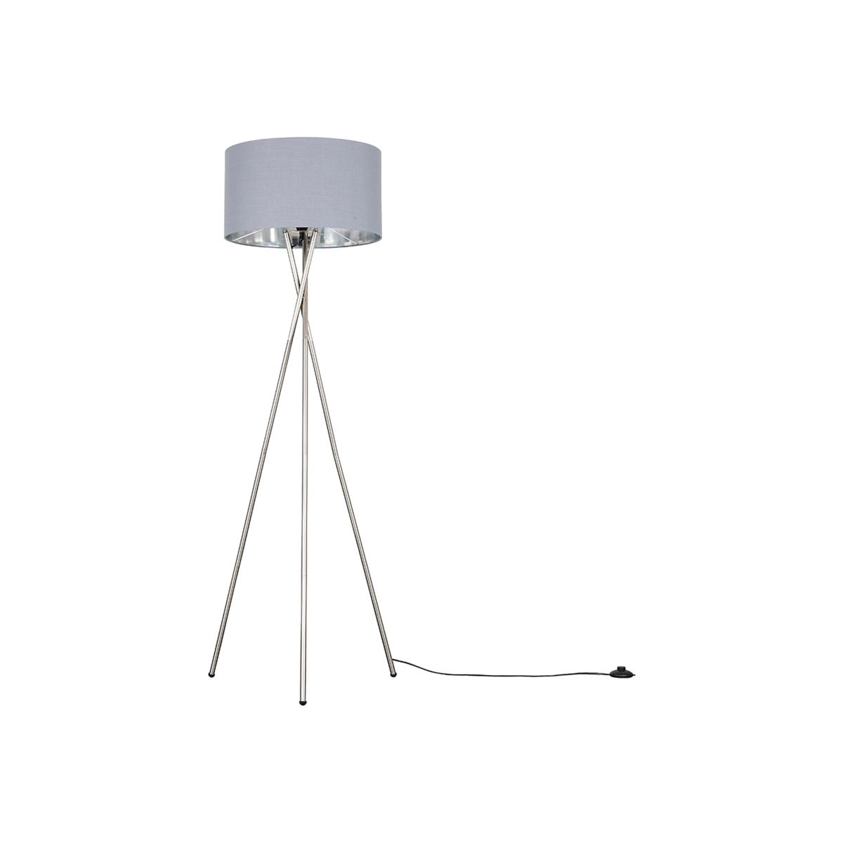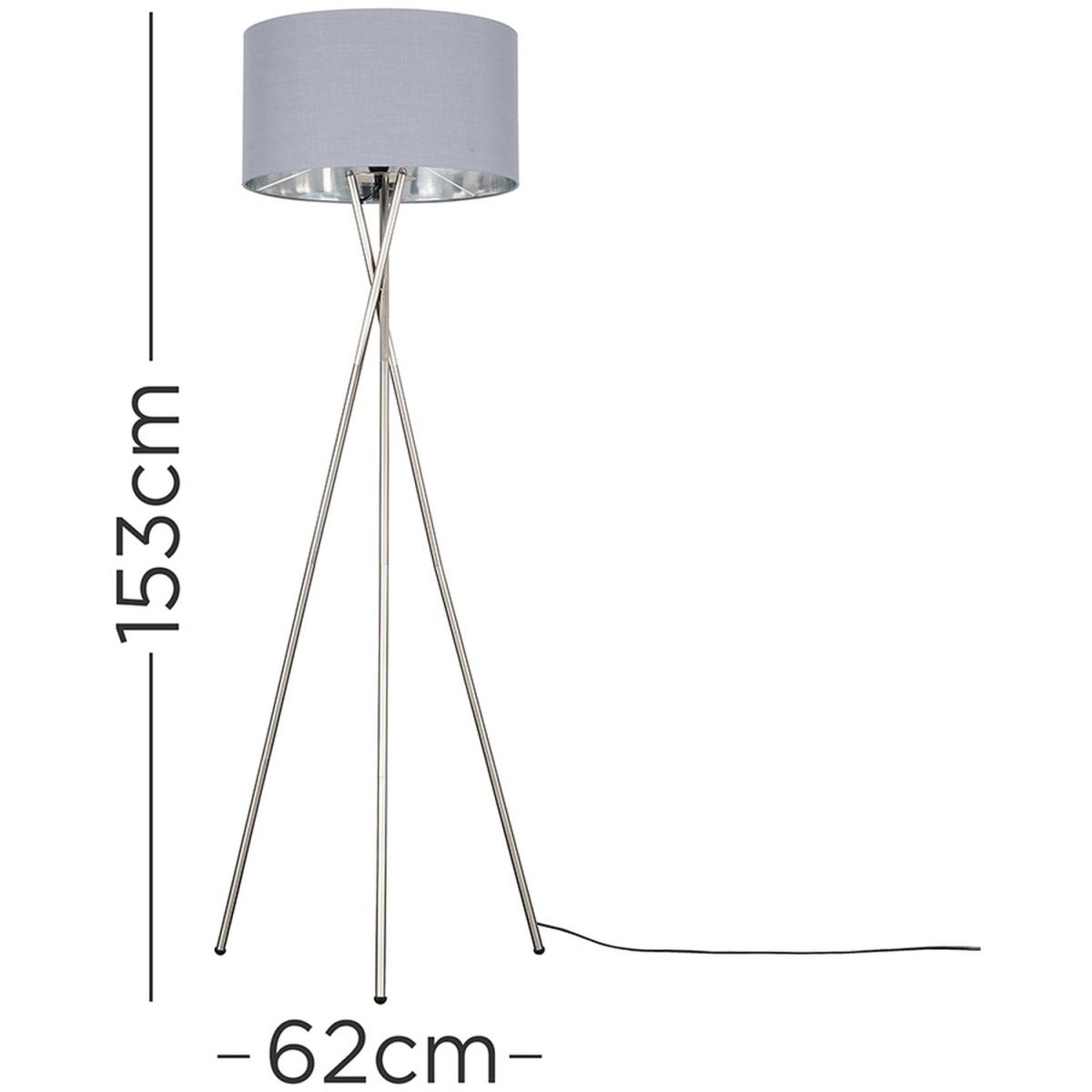 Tripod floor lamp in a brushed chrome metal finish. Comes complete with an extra large grey fabric cylinder lamp shade with a chrome coloured interior, and features an in-line onoff foot switch for easy use. Floor lamps are a great way to bring additional lighting to a room. Ideal for lounges, hallways, bedrooms and other areas around the home.