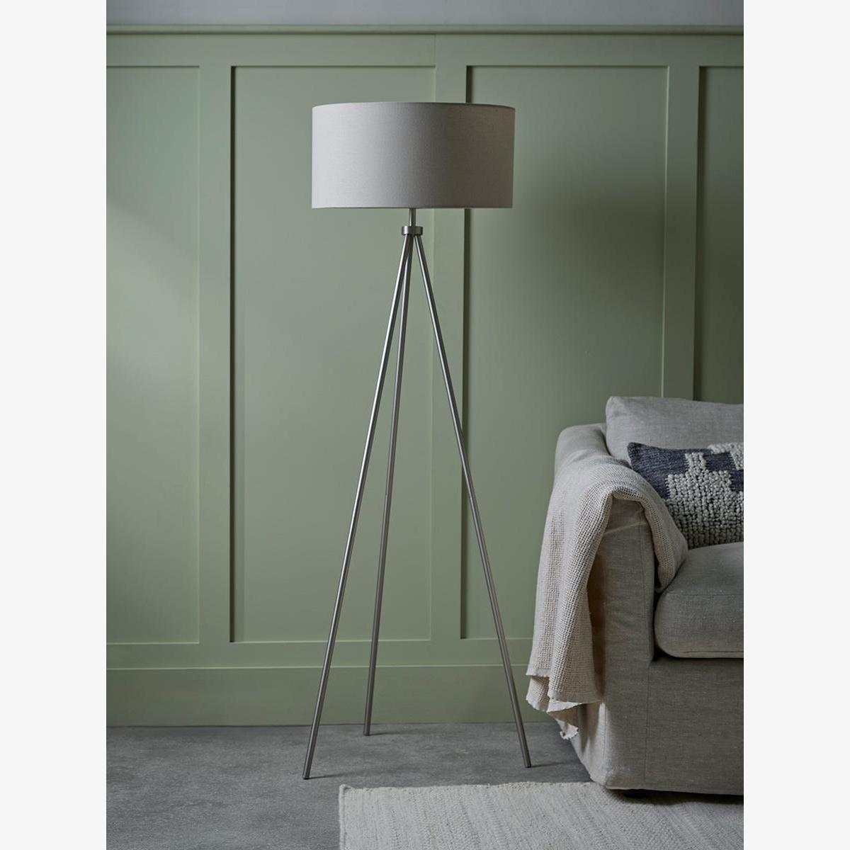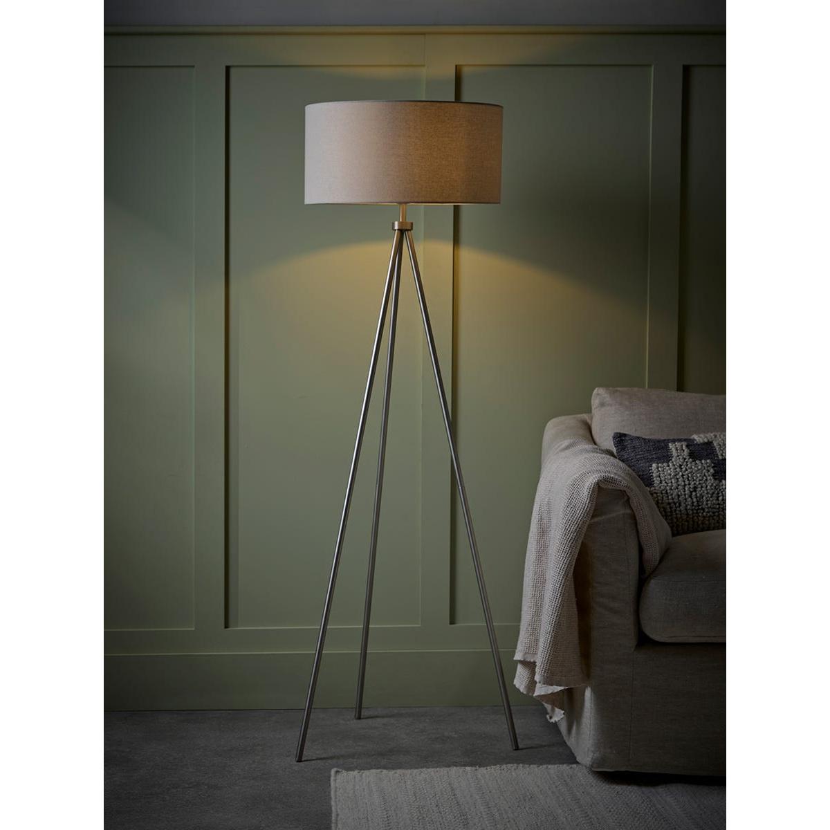 I love this tripod floor lamp for its sleek, modern silhouette and versatile brushed silver finish, which makes it a great addition to both contemporary and minimalist interiors. It works particularly well in living rooms and reading nooks, where its streamlined design adds a touch of understated elegance without overwhelming the space. For styling tips, consider placing it beside a neutral-toned sofa or armchair, and pair it with textured cushions or throws to create a layered, inviting look. Its tripod base lends it stability and a subtle architectural feel, making it both a practical lighting piece and a statement feature in any stylish scheme.