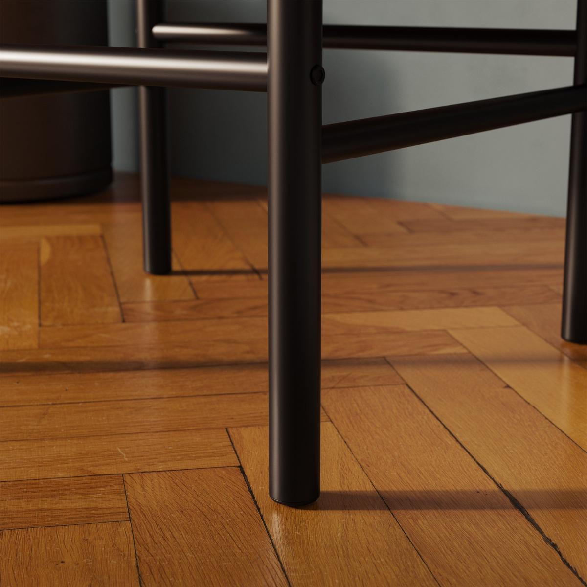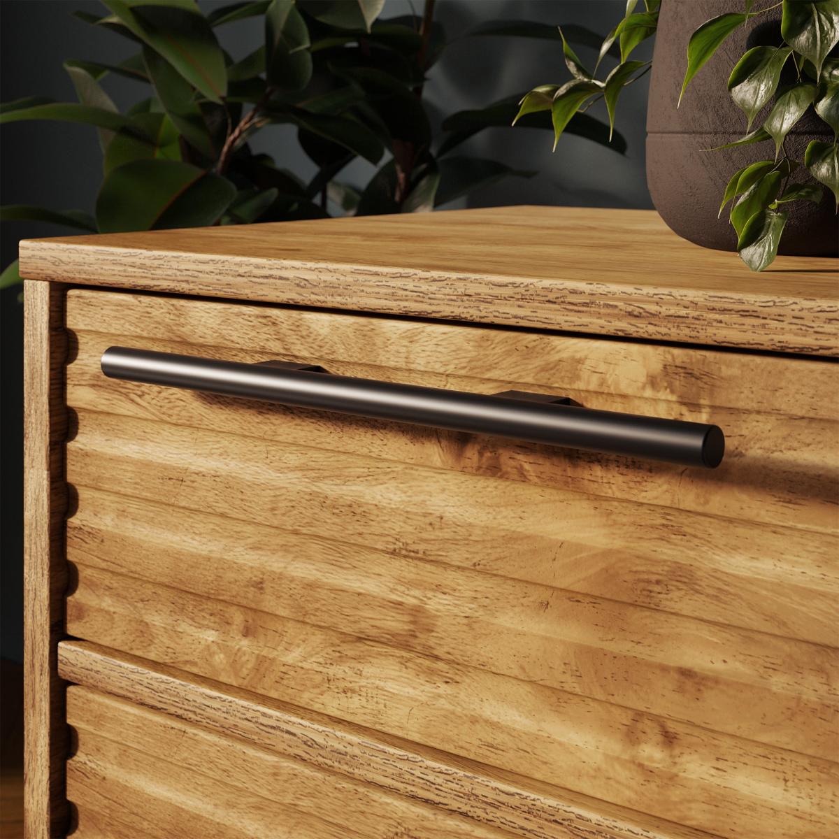 I’m a fan of this bedside table for its clean, modern silhouette and the warm, mango-wood effect finish that brings a subtle texture without overwhelming the space. The slim black metal legs lift the piece, making it ideal for smaller bedrooms or schemes that need a lighter touch. It works equally well in Scandi-inspired rooms, contemporary-industrial lofts or relaxed bohemian spaces. Top it with a simple ceramic lamp, a small pot plant and a neat stack of books to balance function and style. The two drawers keep bedside clutter out of sight, while the natural-wood tone pairs easily with soft linens, rattan accents or matte black hardware elsewhere in the room.