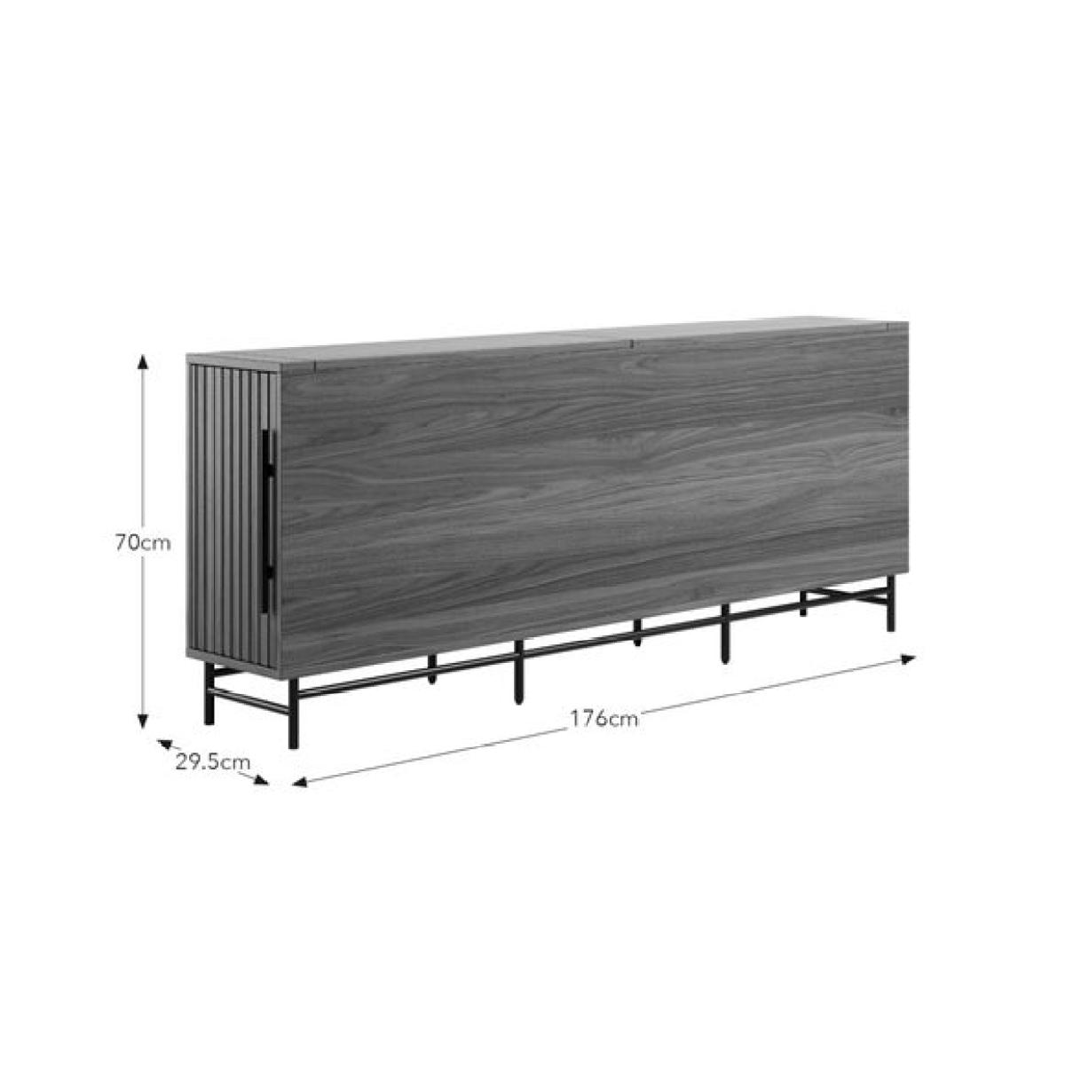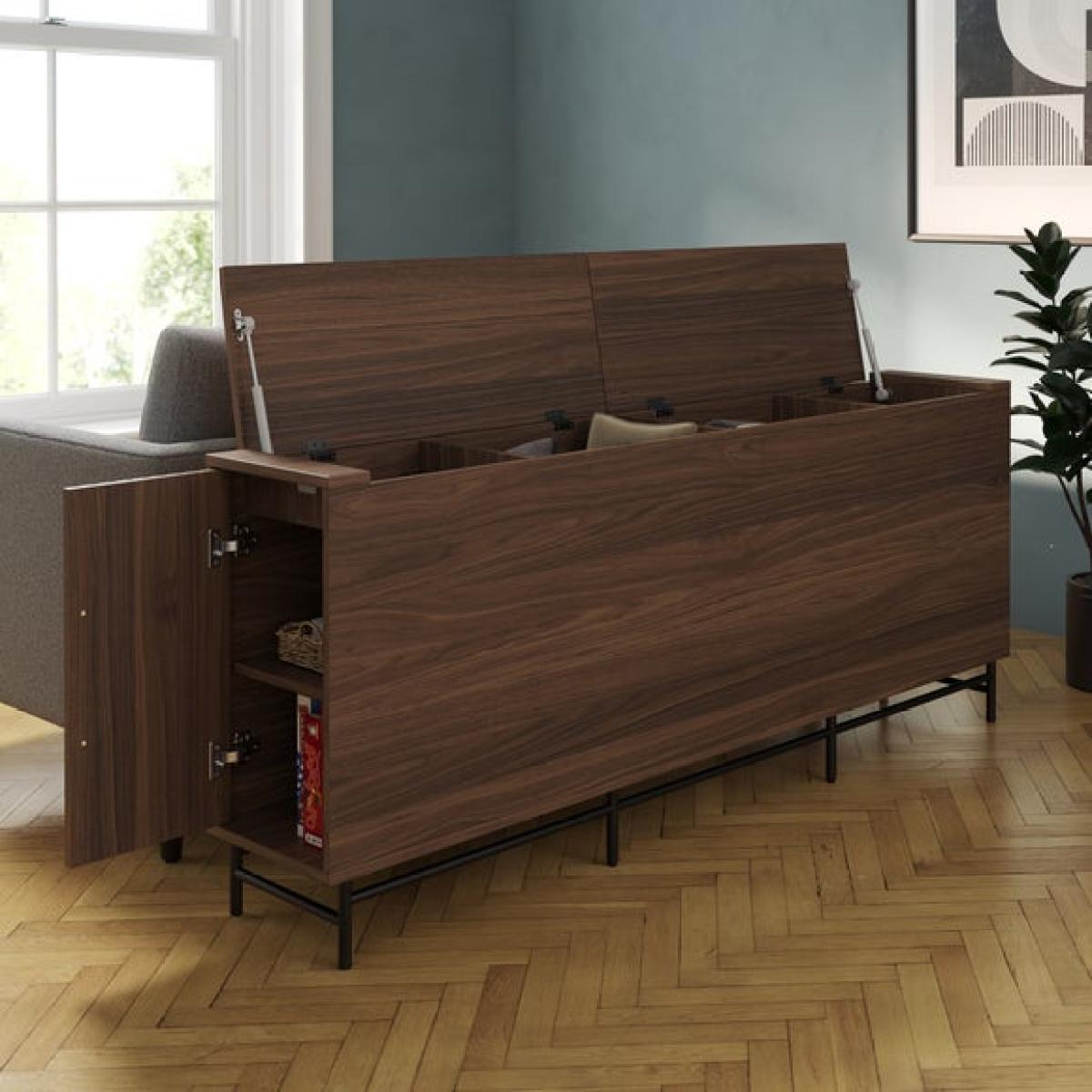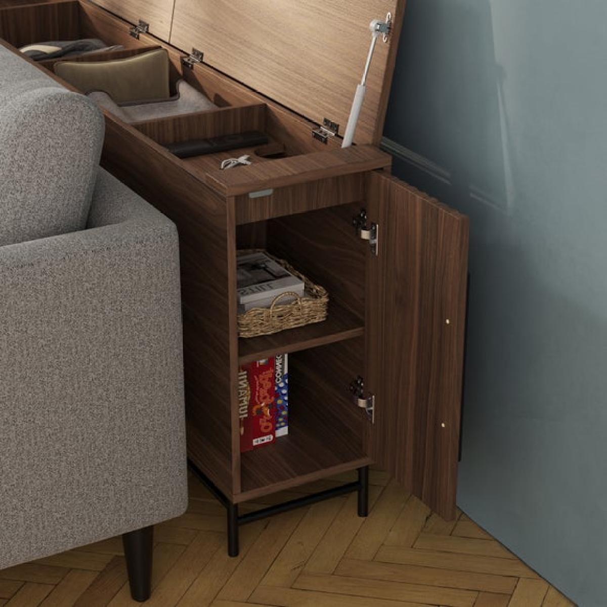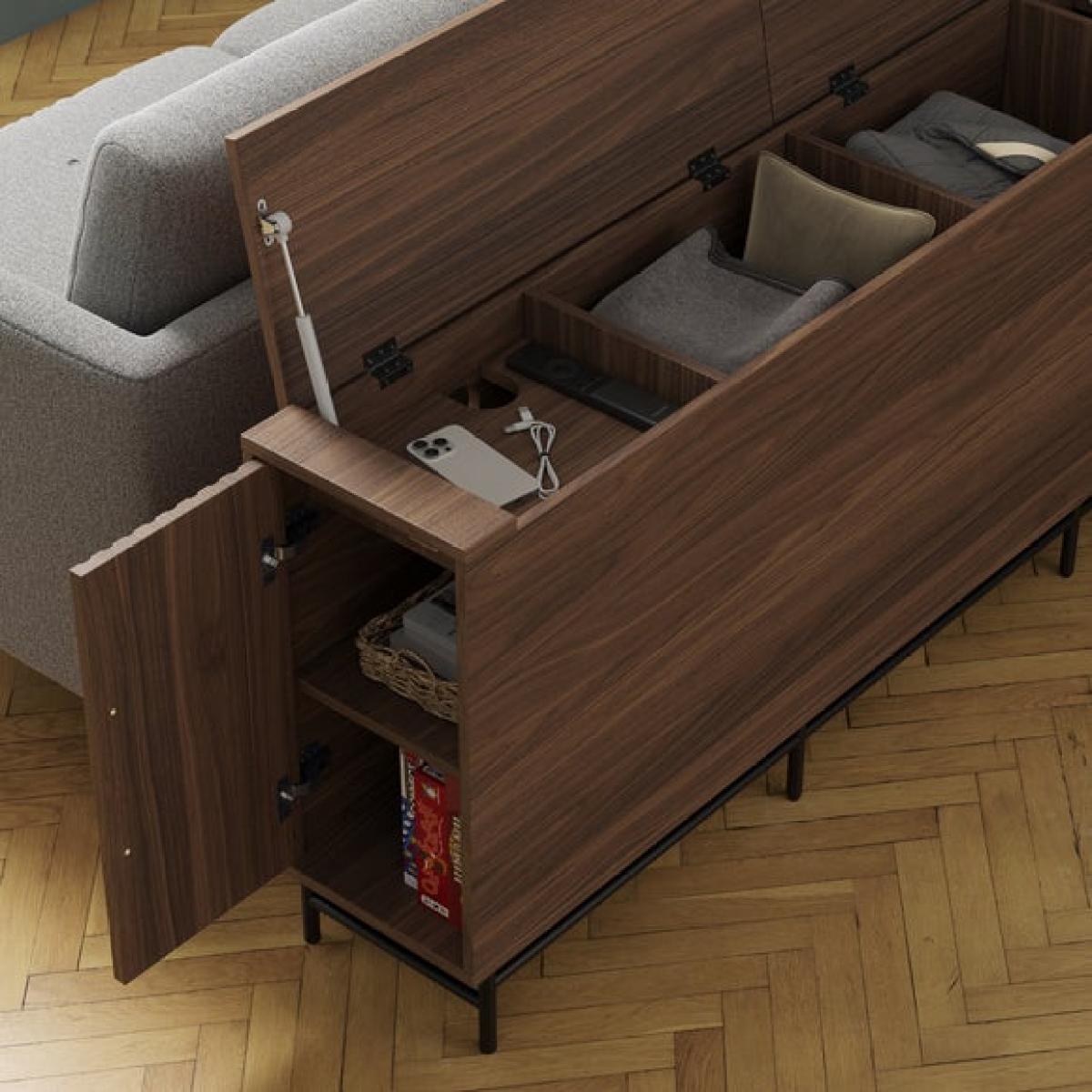* Wood effect frame * Extra storage * Cable management * Metal legs This unit is a clever and discreet storage solution designed to sit neatly behind your sofa, keeping your living space organised and clutter-free. With an open top for easy access while seated, it’s perfect for storing remotes, phones, and chargers thanks to its built-in cable management. Raised compartments keep essentials within reach, while deeper sections offer space for blankets and other larger items.
