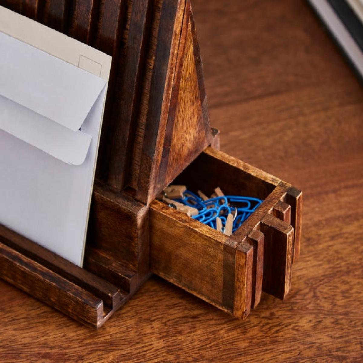 * Handy desk organiser * Mango wood * Letter rack * Slide out drawer Keep your desk clutter-free with the Bryant Mango Wood Desk Organiser. Made from mango wood with a geometric design, it features a letter rack to keep post and paperwork in order. The built-in slide-out drawer is perfect for tucking away paperclips and other small essentials. Its compact design makes it ideal for smaller workspaces, making this a practical piece with clean lines and a warm wood finish, which pairs neatly with both modern and traditional interiors.