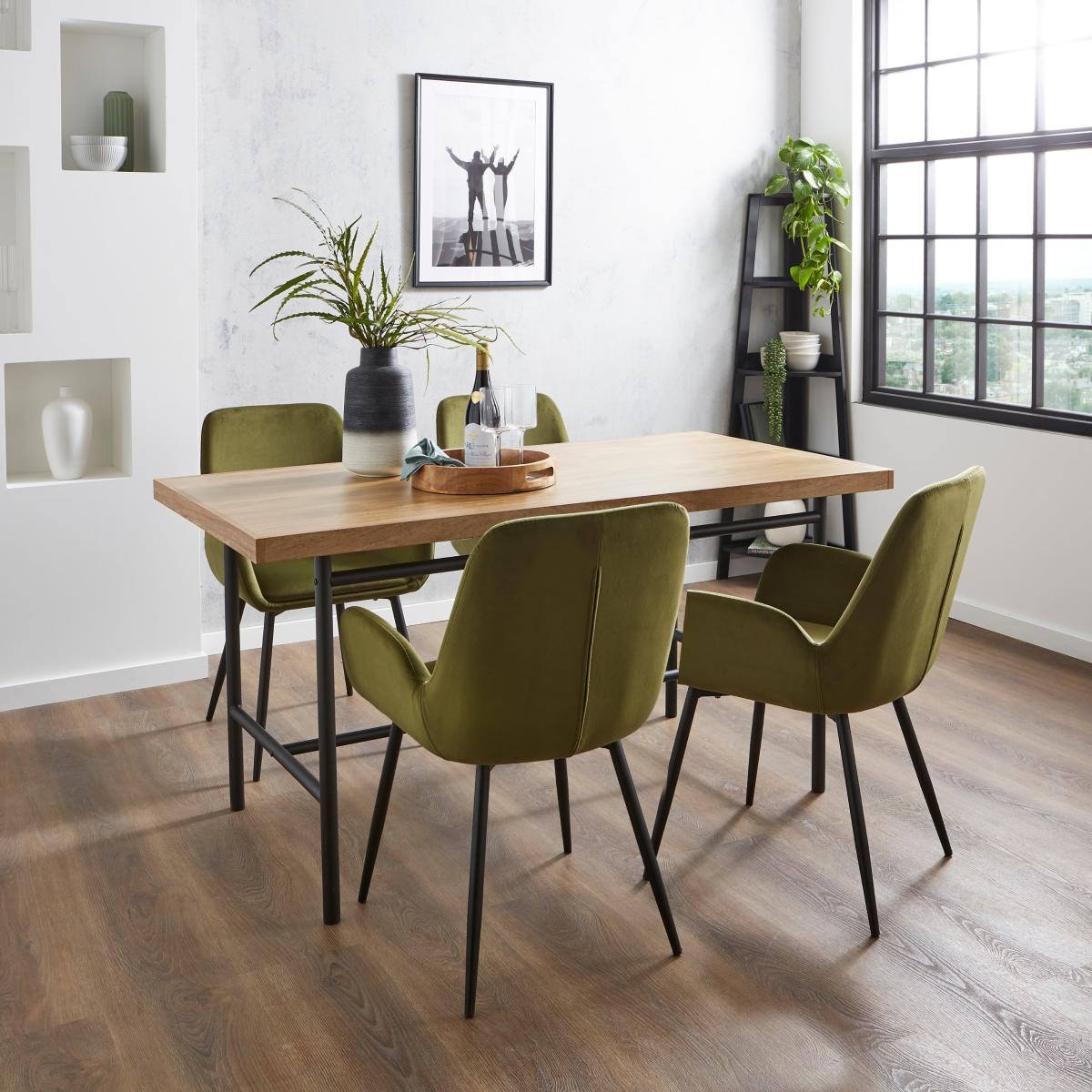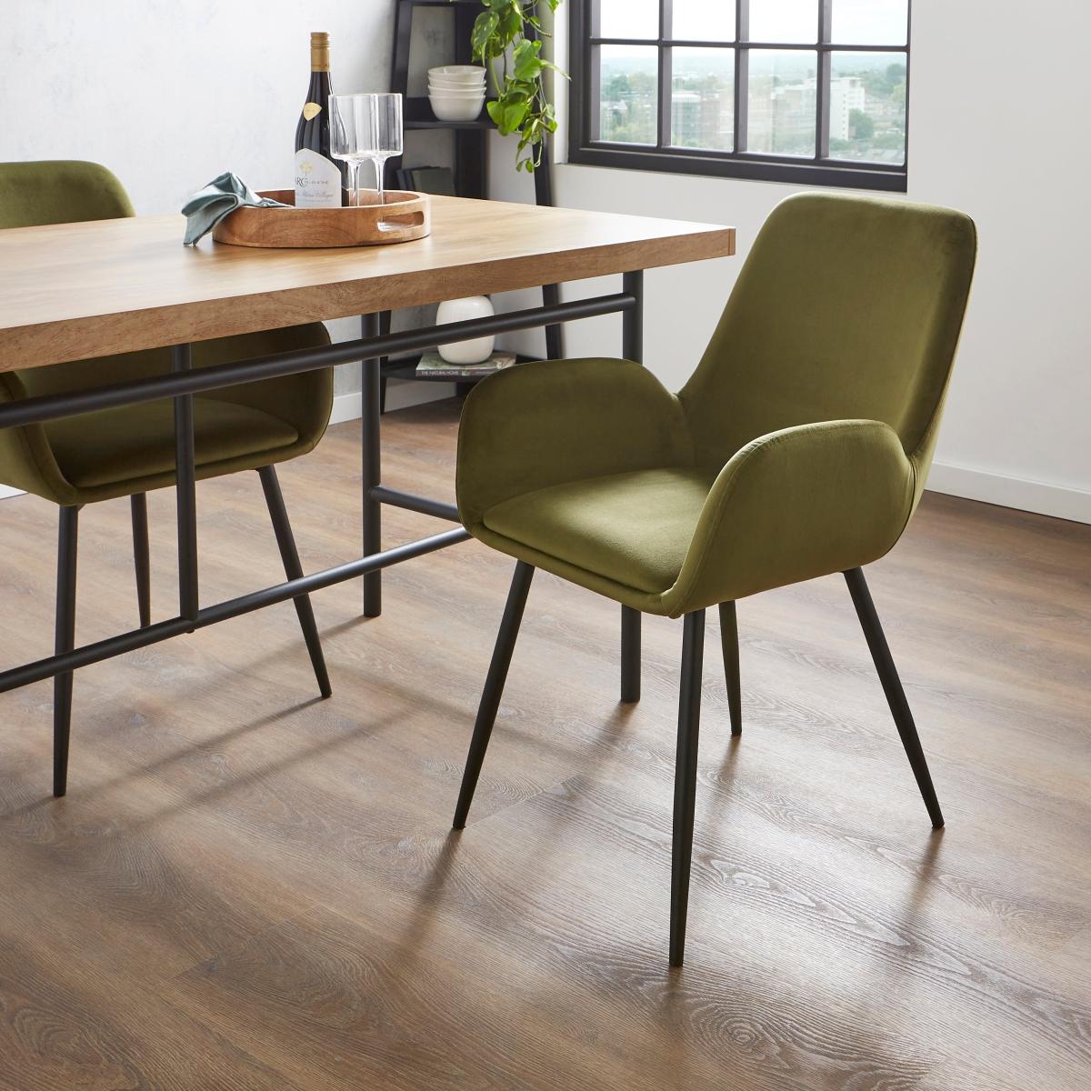 This dining set is a versatile choice that works well in both modern and eclectic interiors. The rectangular table offers a streamlined look that suits contemporary spaces, while the Axel olive velvet chairs add a touch of softness and colour, making the overall look inviting. I love how the velvet chairs bring a rich texture that balances the simplicity of the wooden table-perfect for adding personality without overwhelming the room. Practical styling tips include keeping the tabletop clutter-free with a simple centrepiece, like a sleek vase or a small tray, and using complementary colours in your accessories to unify the space. For smaller dining areas, pairing this set with minimalist decor helps avoid a cramped feel, whereas in larger rooms, it can be paired with statement lighting or artwork to elevate the look.