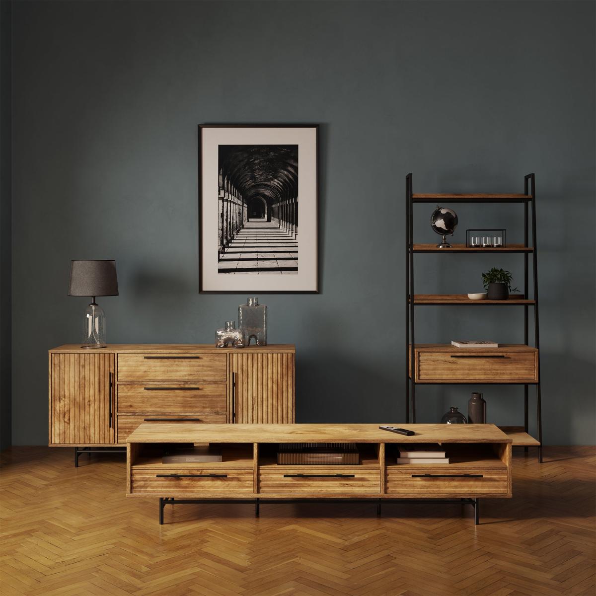 I’m a fan of this mango-effect sideboard for its warm, natural tones and fluted detailing, which add texture without overwhelming a room. It slots neatly into Scandi, mid-century or contemporary schemes and works equally well in a hallway, dining area or living space where you need extra storage without bulk. To style, keep the top surface clear around a statement lamp or low vase, then group smaller objects in threes - think ceramic bowls, a small stack of books and a sculptural candle. Above it, hang a simple round mirror or minimal black-framed print to echo the sideboard’s slim metal legs. Finish with a trailing plant at one end for height contrast and to soften the straight lines.