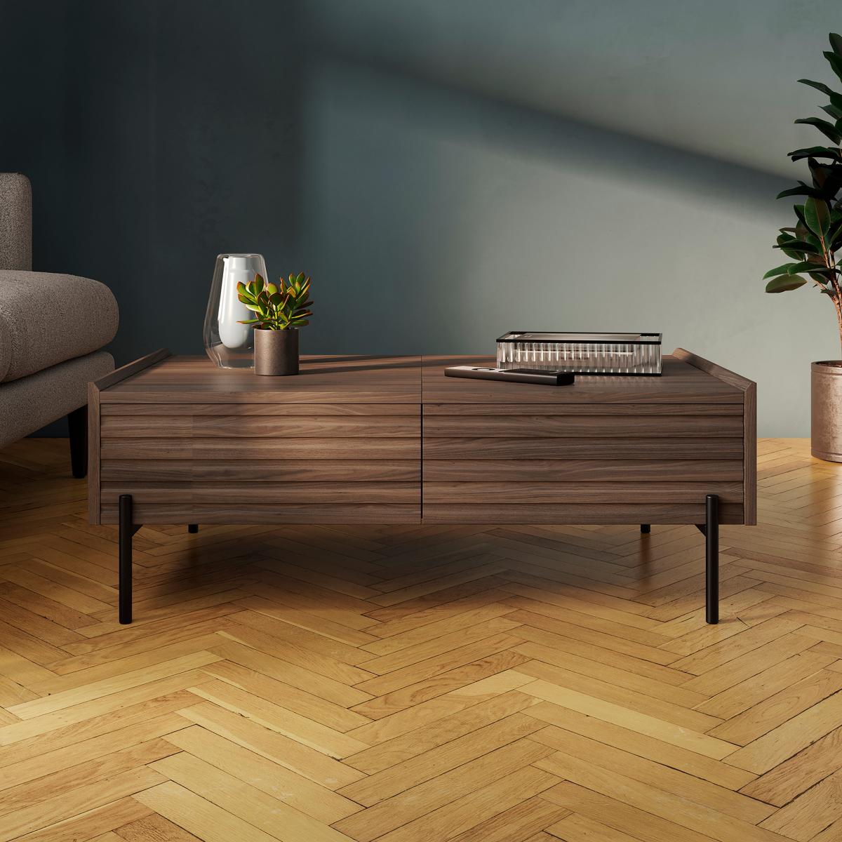 I’m a big fan of this Bryant table in walnut because the warm wood grain and slim black legs give it a neat, mid-century edge while still feeling versatile. It sits comfortably in Scandi, contemporary or even industrial schemes, and the sliding top is genuinely useful for hiding remotes and magazines. Styling-wise, I’d keep one half clear to show off the wood, then group a low tray, a sculptural vase of fresh foliage and a couple of coffee-table books on the other. Placed on a neutral rug in front of a sofa, it becomes both a practical storage solution and a subtle focal point.
