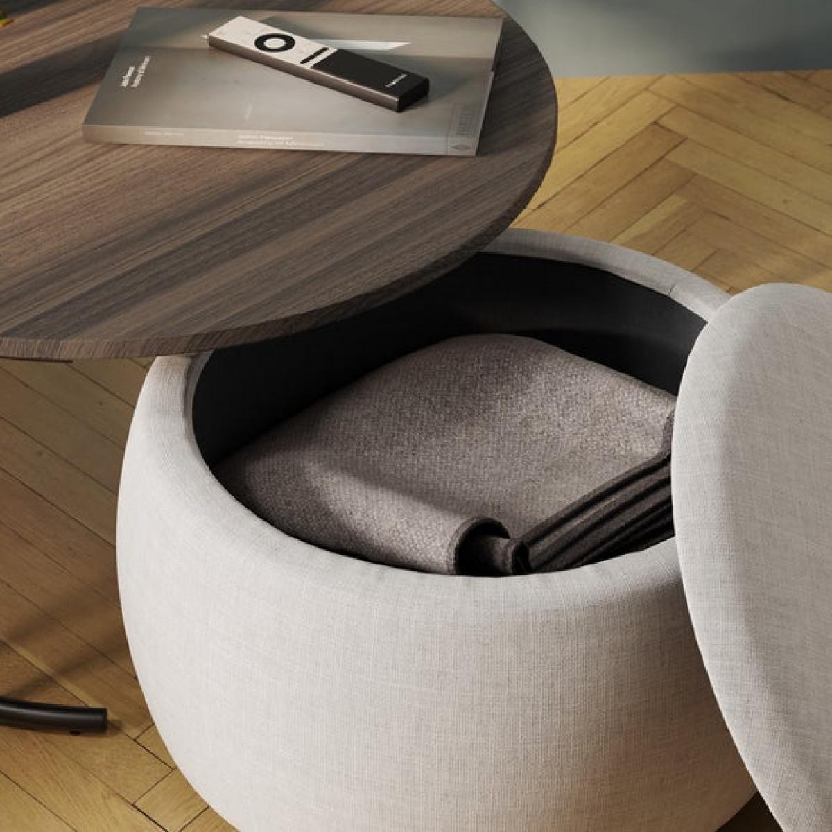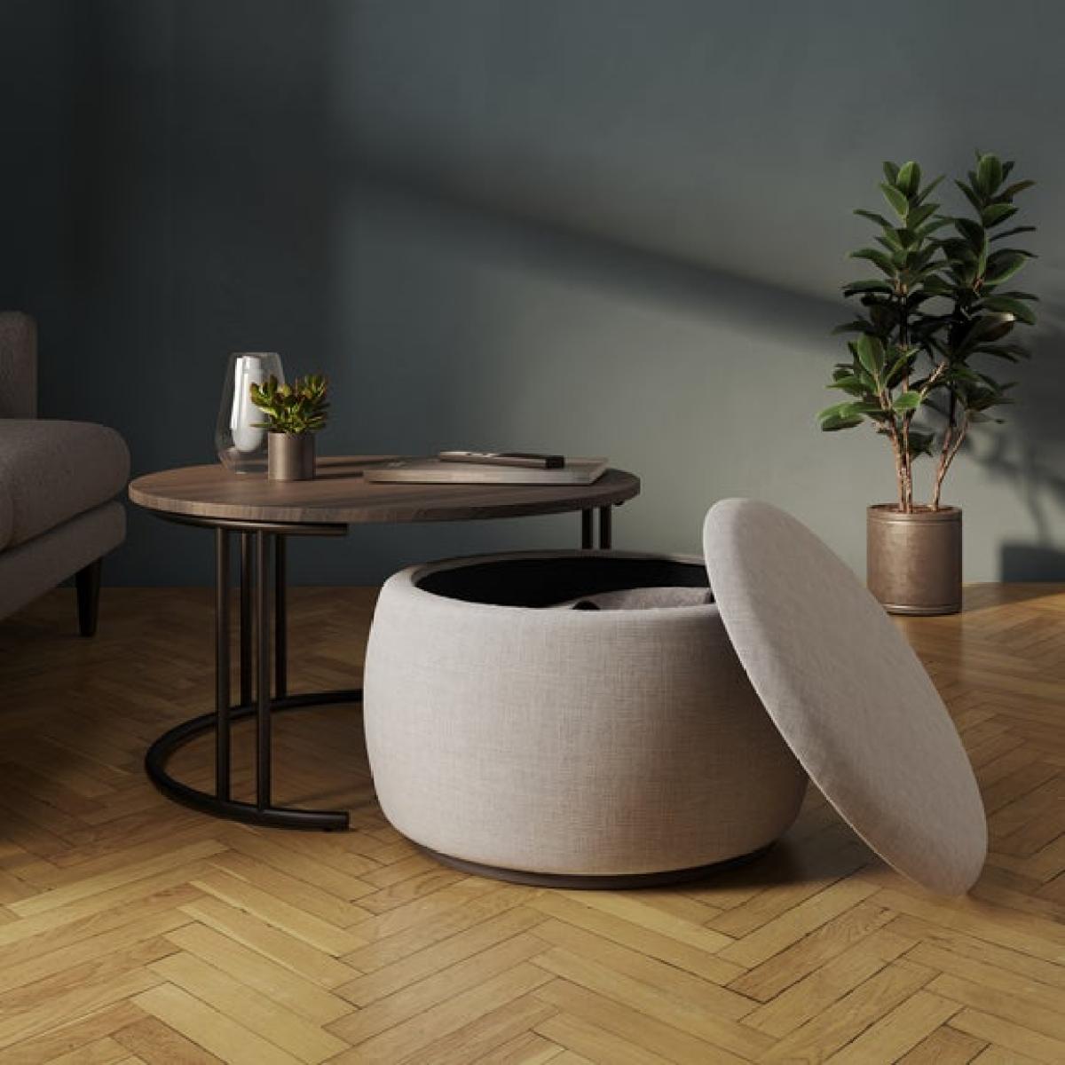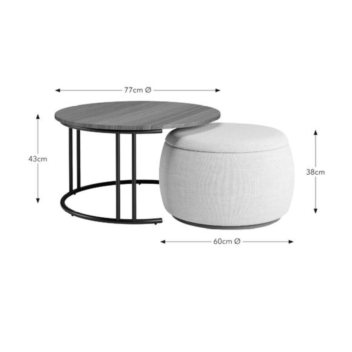 * Nesting Coffee tables * Wood effect finish * Upholstered pouffe * Open top for storage This coffee table nest is a smart and stylish solution for modern living, combining the elegance of a walnut-effect finish with the practicality of hidden storage and flexible seating. This nesting coffee table features a sleek open-top design that houses a fully upholstered pouffe, offering a comfortable extra seat or footrest when needed. The pouffe tucks neatly beneath the table when not in use, helping to keep your space tidy and adaptable.