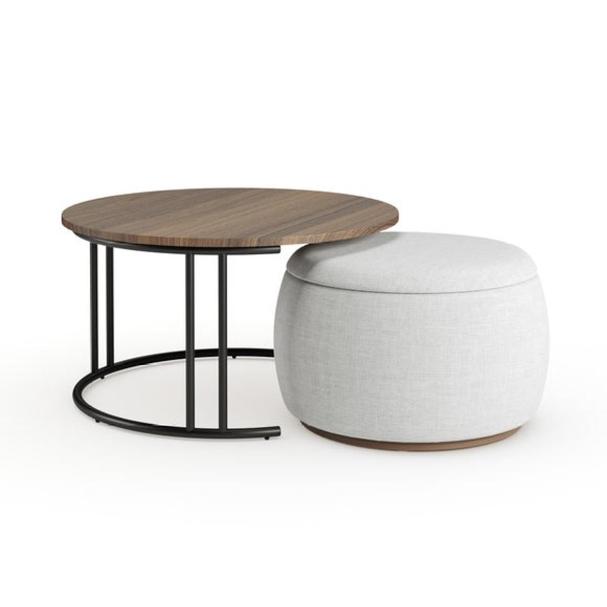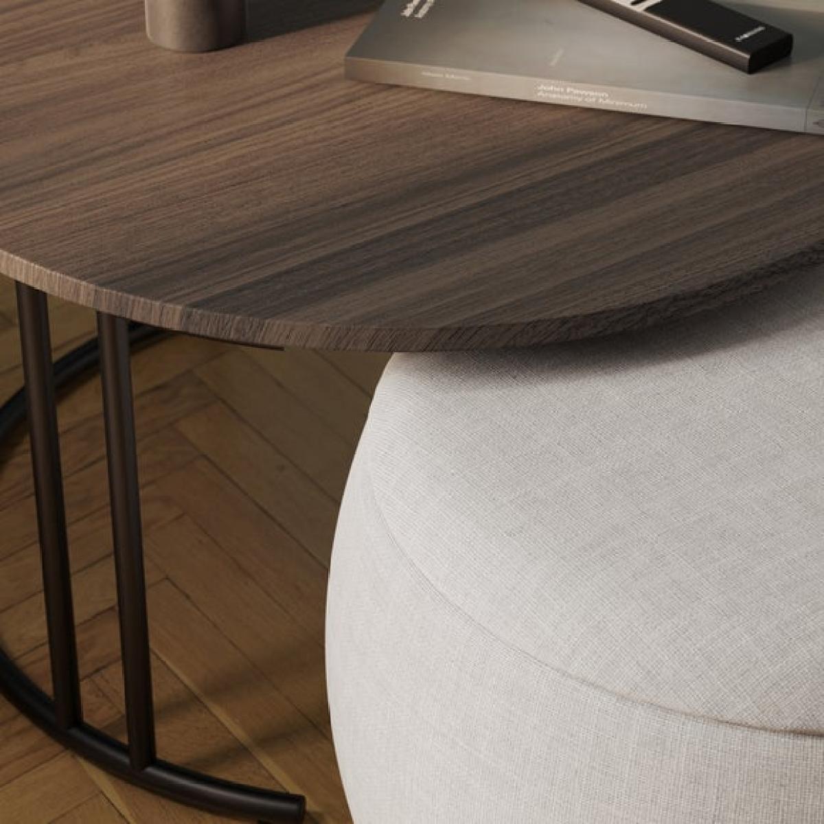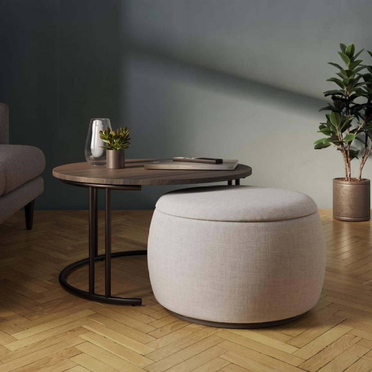 * Nesting Coffee tables * Wood effect finish * Upholstered pouffe * Open top for storage This coffee table nest is a smart and stylish solution for modern living, combining the elegance of a walnut-effect finish with the practicality of hidden storage and flexible seating. This nesting coffee table features a sleek open-top design that houses a fully upholstered pouffe, offering a comfortable extra seat or footrest when needed. The pouffe tucks neatly beneath the table when not in use, helping to keep your space tidy and adaptable.