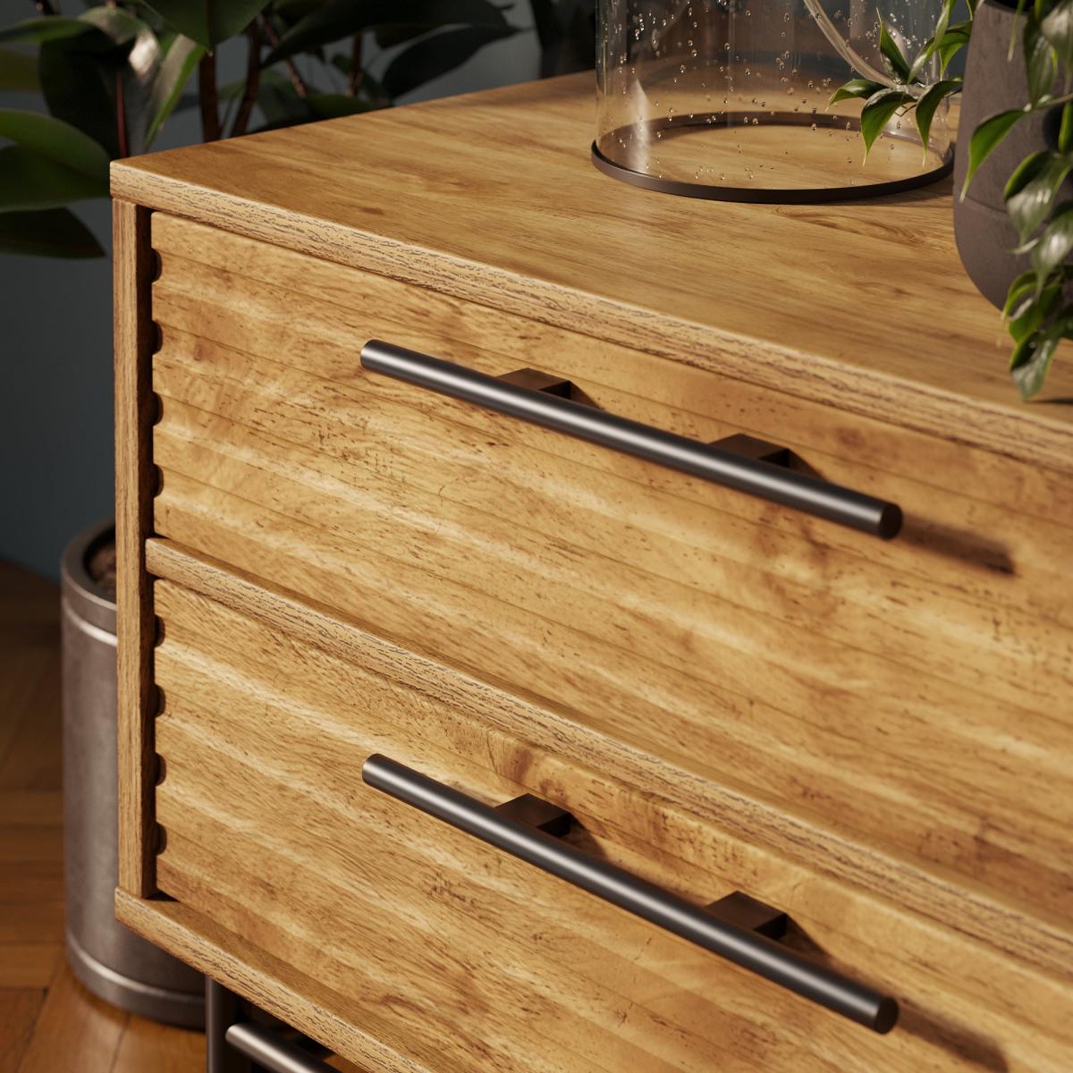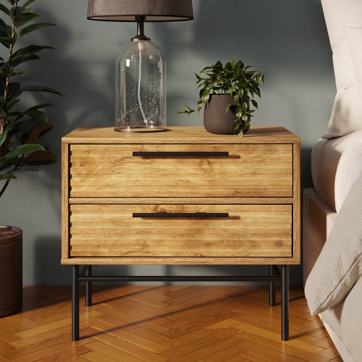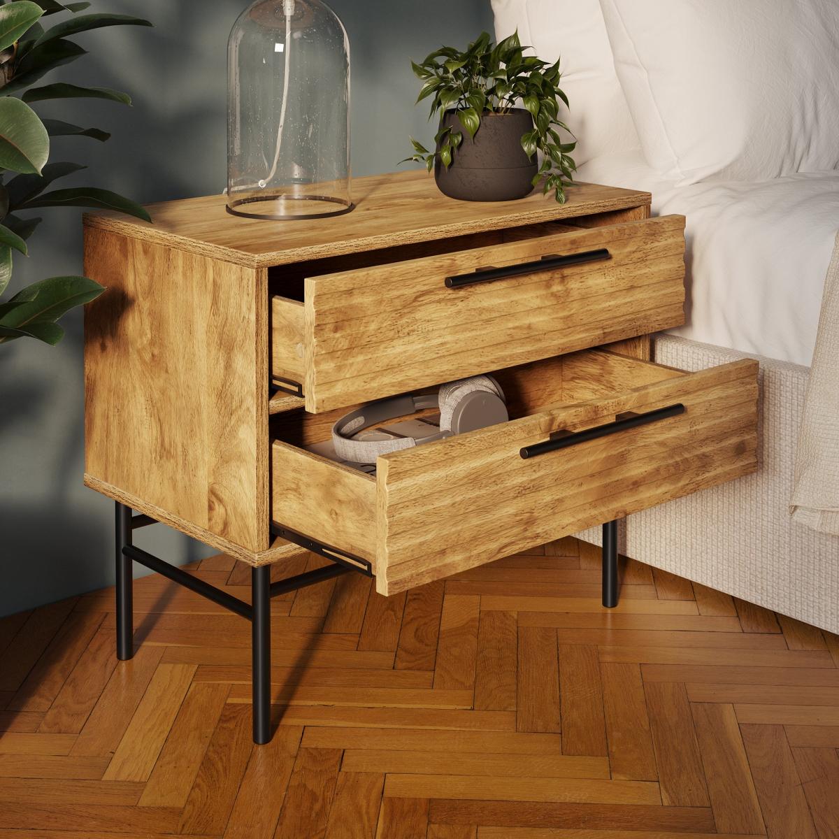 * Wide frame* Ribbed drawer fronts* Black metal handles This table is a practical and stylish solution for those needing extra bedside storage. Its wide design and two generously sized drawers provide plenty of room for your essentials, from books and chargers to nighttime necessities. The ribbed front detailing adds a contemporary touch, while the mango wood effect finish enhances its warm and timeless appeal.