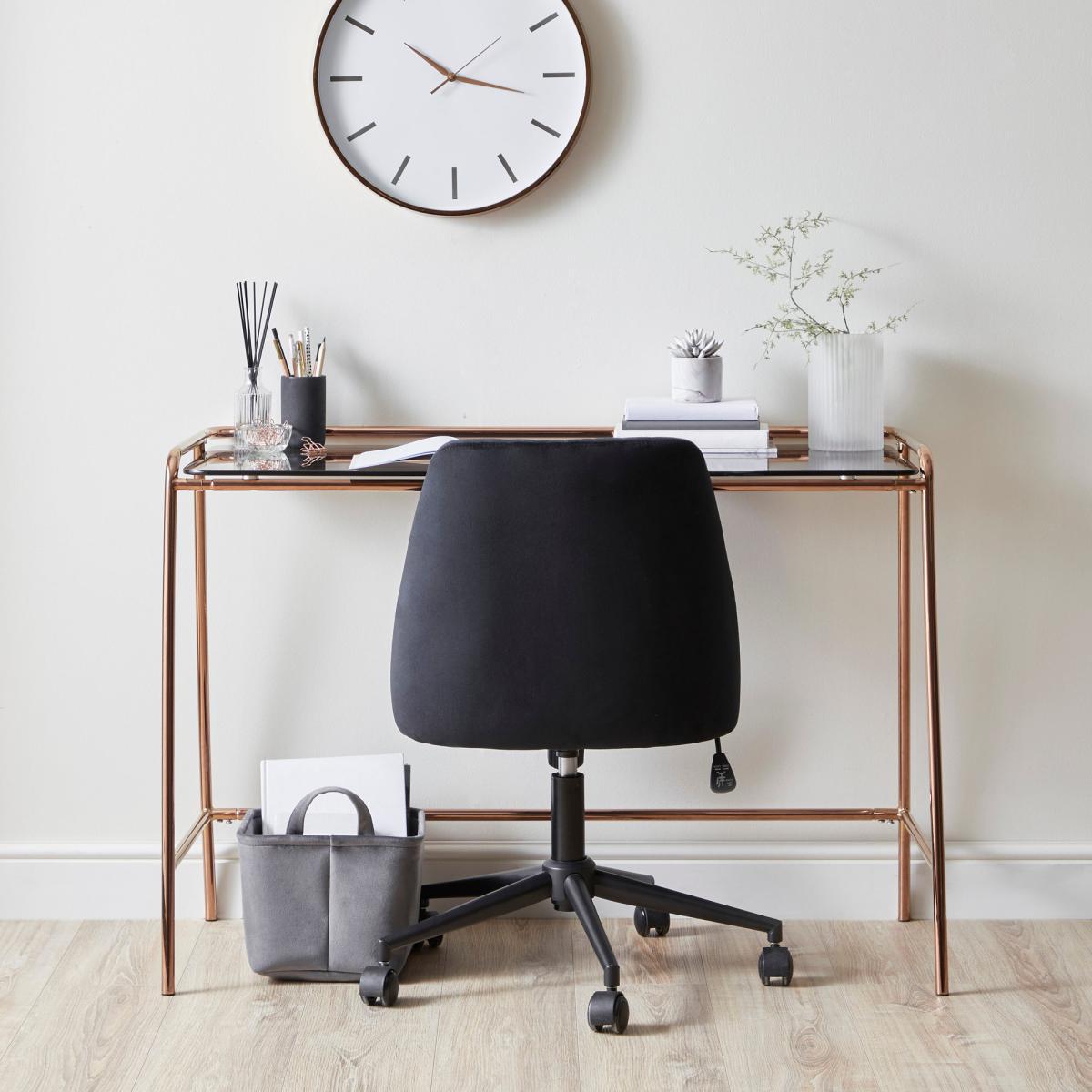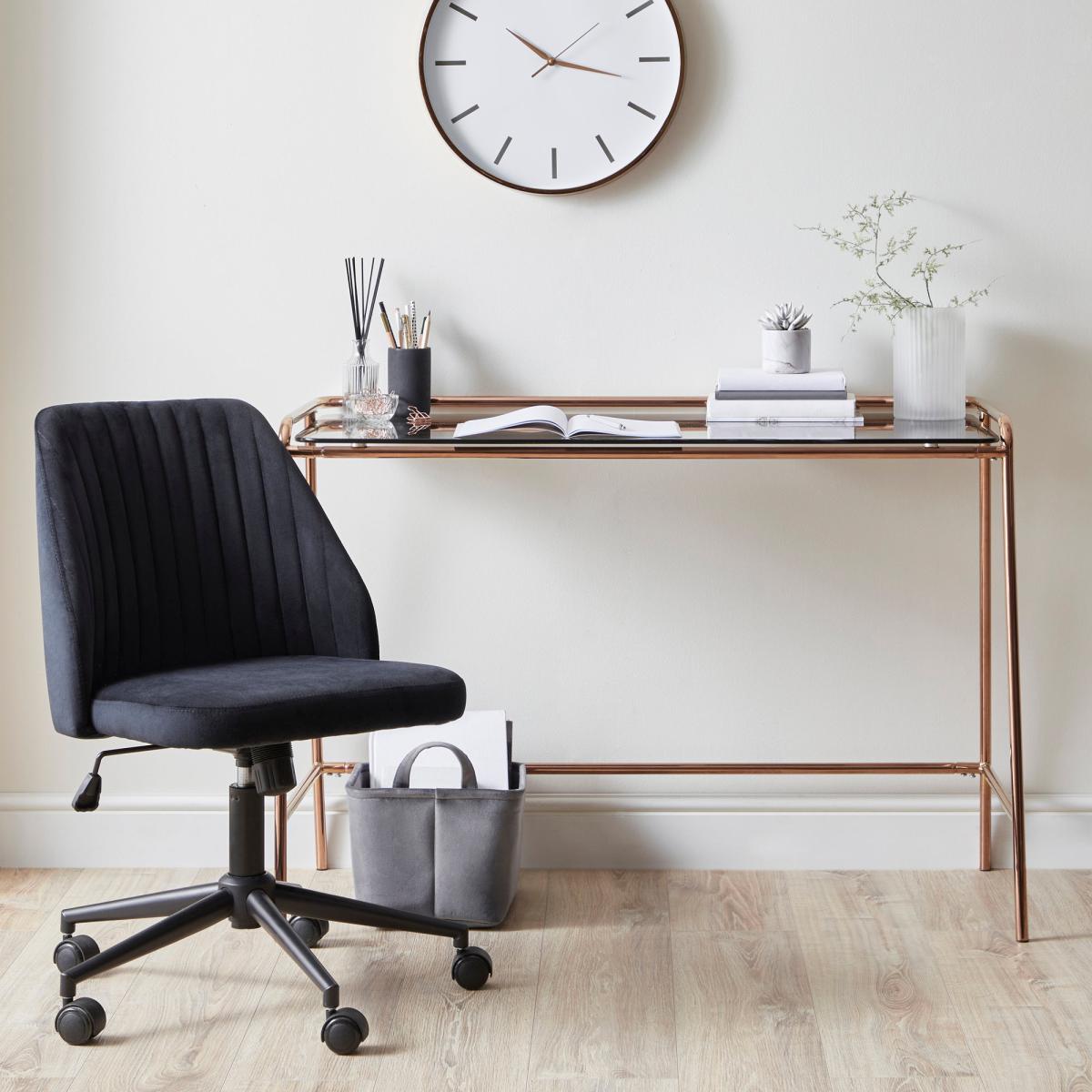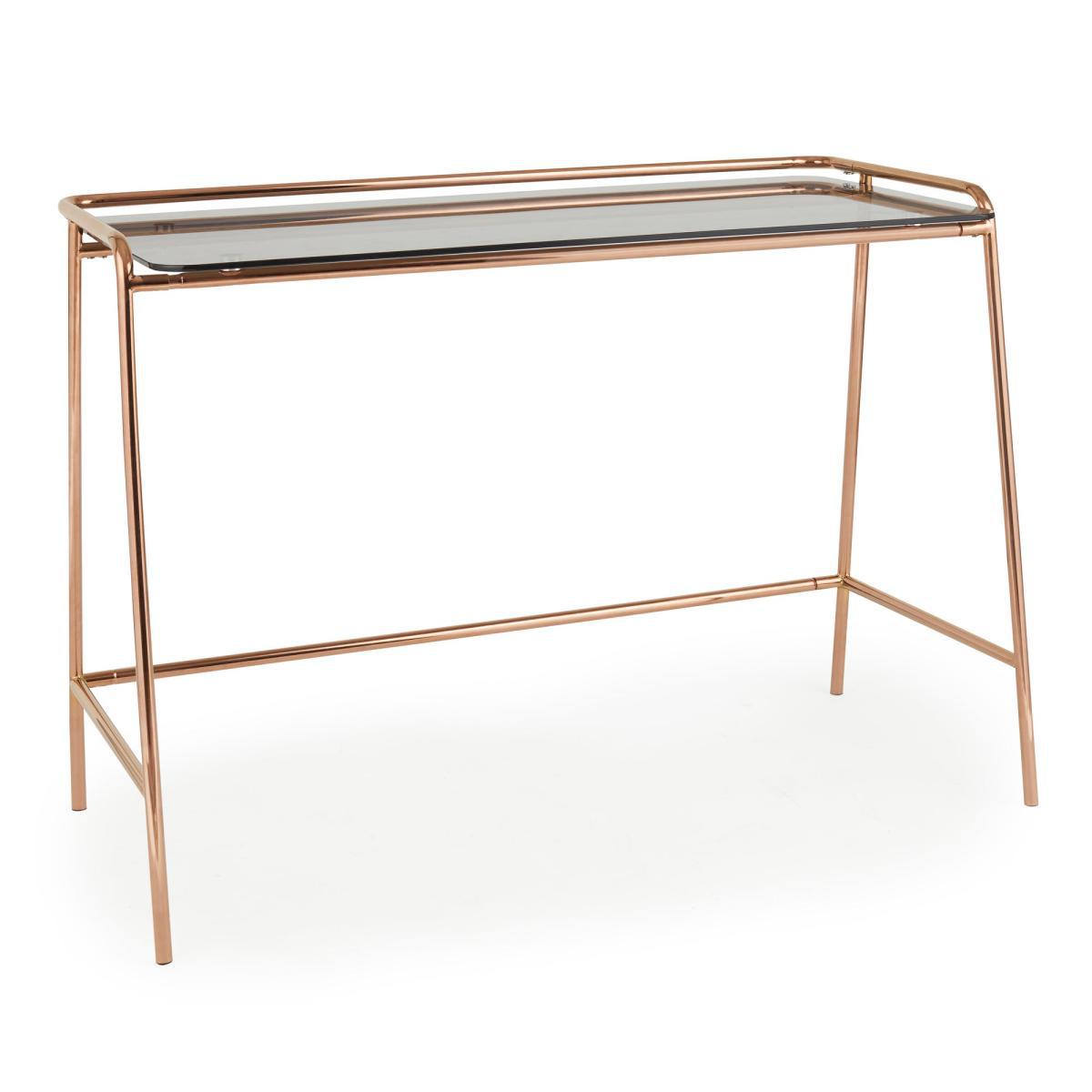 Dunelm Exclusive - Designed and Developed by Dunelm. The stunning Bryony Desk is characterised by its gorgeous rose gold, slender metal legs, beautifully paired with a smoky tempered glass worktop for a luxe finish that would enhance any home office space. This self assembly desk also features a spacious worktop making it practical as well as undoubtedly stylish.