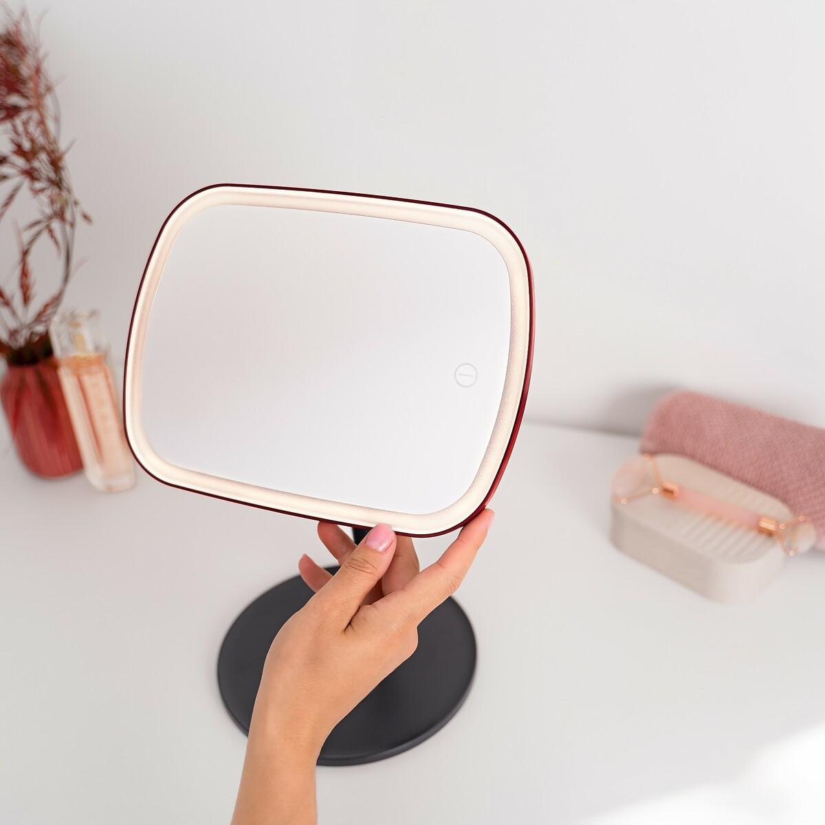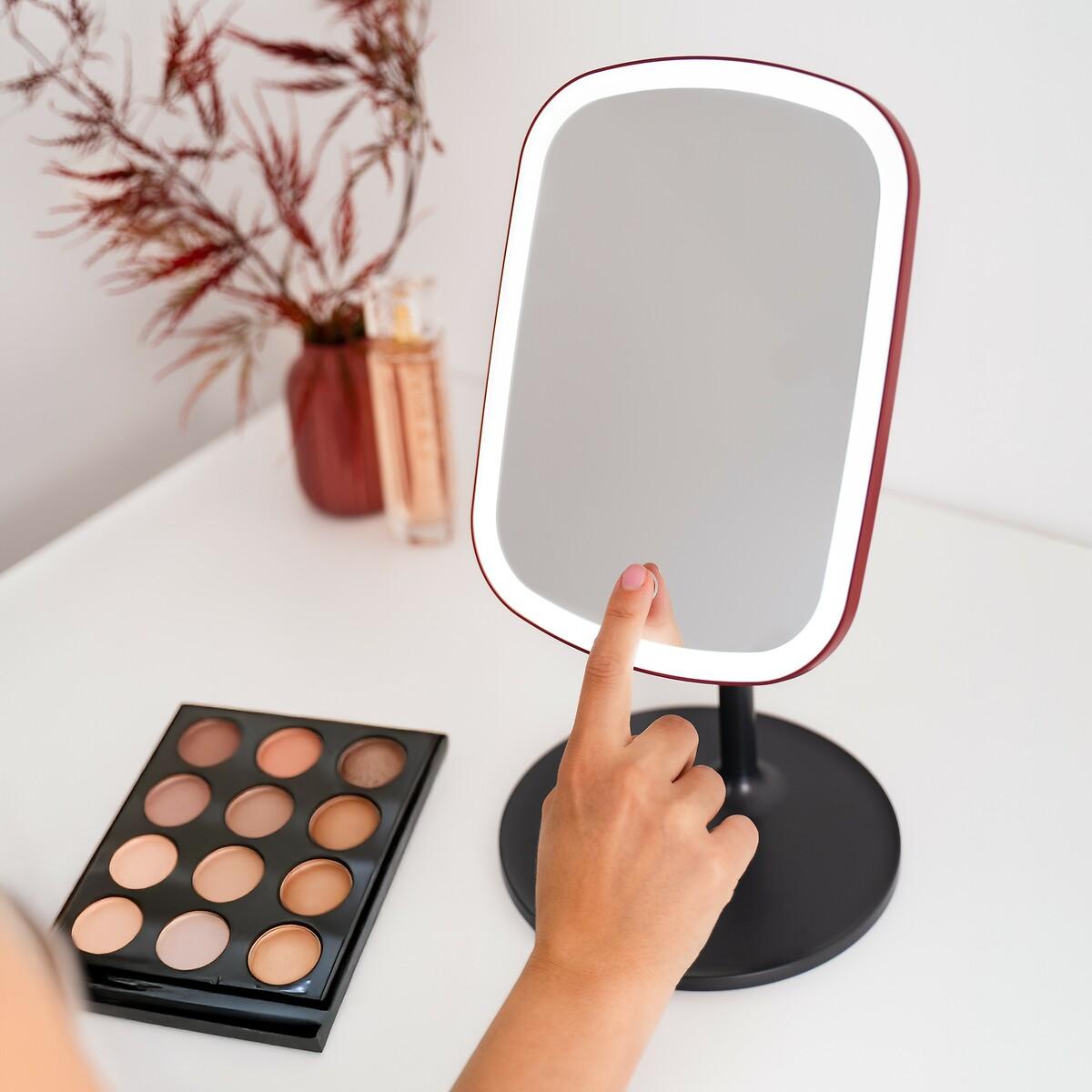 Product description: • Three adjustable lighting options for a clear, precise image in the Mirror • Magnetic support for greater flexibility when positioning and removing the mirror • Easy to use thanks to the touch sensor on the mirror surface • Sparkly LED light with 33 LEDs : warm, cool and neutral light • Dimming function : infinitely variable light intensity • Extra large mirror surface 15 x 21 cm • USB - C cable for easy charging • Battery operation • Powerful lithium battery for up to 3 hours of operation : 2.5 to 3 h charging time • With storage space on the stand • Automatic switch-off after 15 minutes