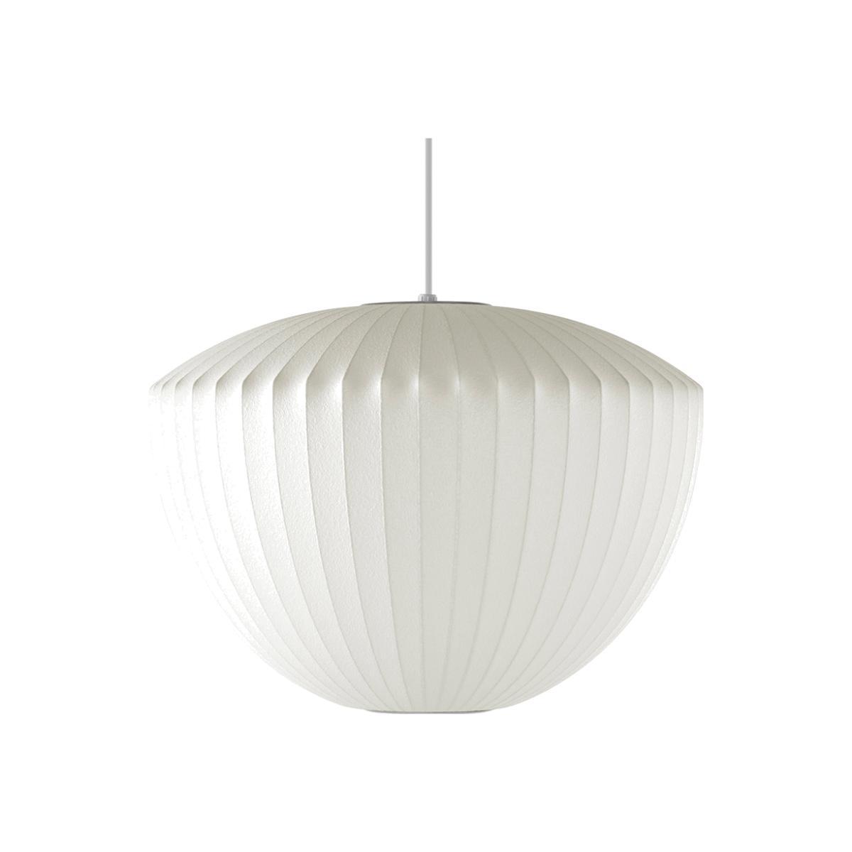 Designed by George Nelson for Herman Miller, the iconic apple Bubble Pendant is a lauded classic that has become synonymous with 1950s design thanks to its striking aesthetic. Forming part of the permanent collection at New York’s Museum of Modern Art, this celebrated globular apple pendant was inspired by a set of Swedish hanging lamps that George Nelson encountered on his travels. Expertly crafted using a cocooning white plastic spray that was originally developed for the U. S. Military, the Bubble Pendant has been on the forefront of innovation since it’s conception. In using this innovative technique, Nelson has succeeded in providing the lamp with a smooth and translucent finish reminiscent of the silk cocoons spun by butterflies. Secured with a brushed nickel ceiling plate, the symmetrical light appears to float in the air whilst it casts a soft, even glow throughout the room. A striking design classic, the apple Bubble Pendant would lend a warm atmosphere to any space whether showcased alone or in a group. Widely considered to be one of the founders of American modernism, George Nelson is renowned for his collaborations with Vitra and has created many products that are now exemplary designs in their respective genres. Requires: 1 x Max 60W E27 bulb (not included).