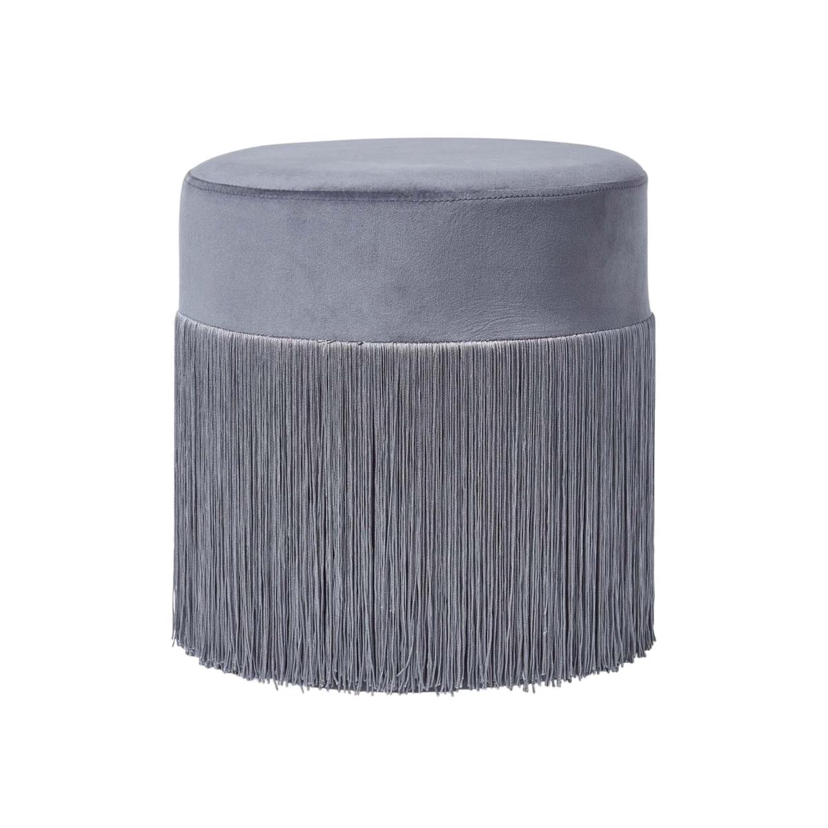 The Buckingham pouffe, an exclusively designed statement-making velvet footstool from Homescapes. Add a touch of luxury to your interiors with this super soft round velvet pouffe, expertly designed to complement traditional and on-trend styles and handcrafted by skilled artisans. Measuring 39cm tall, the Buckingham footstool is inspired by a vintage design and is upholstered in a soft grey velvet and decorated with a retro-style fringe tassel trim. A multifunctional pouffe that can be used as a footrest, vanity stool, occasional seat or as a simple yet stunning room accessory that will compliment both modern and traditional interior styles. A lightweight round pouffe measuring 36 x 36 x 39 cm, Buckingham is available in a range of 2 complimentary colours (grey and oyster) and is part of Homescapes exclusive collection of velvet pouffes and footstools. Wipe clean only. No assembly required.