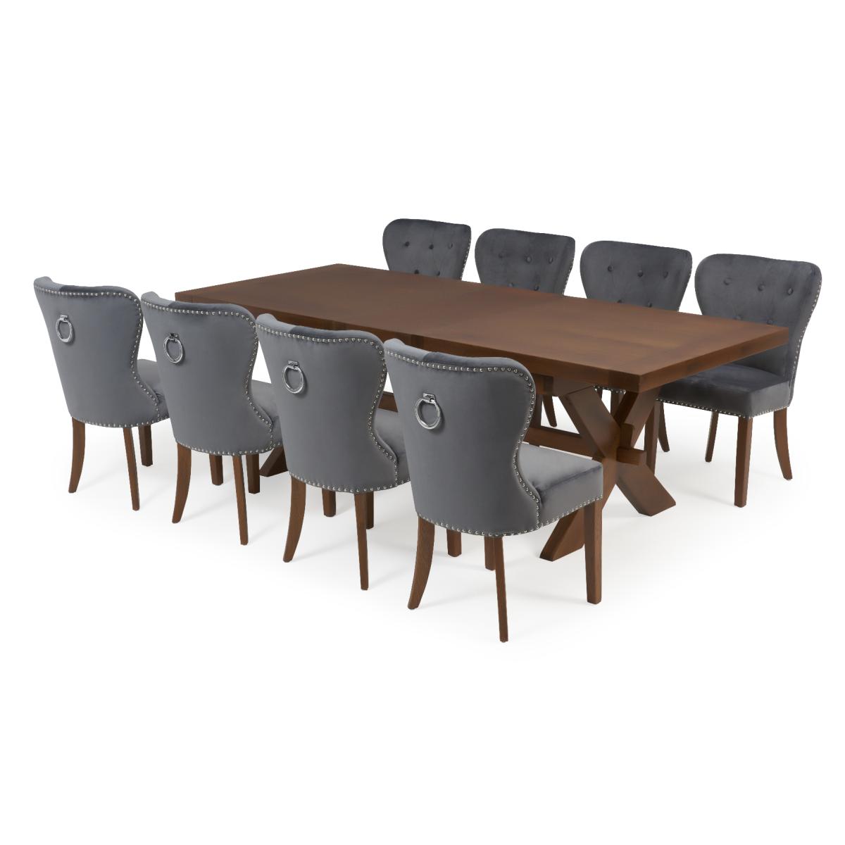 The Buckley dark solid oak table and Keswick velvet dining chair set is a gorgeous and royal addition to your dining room