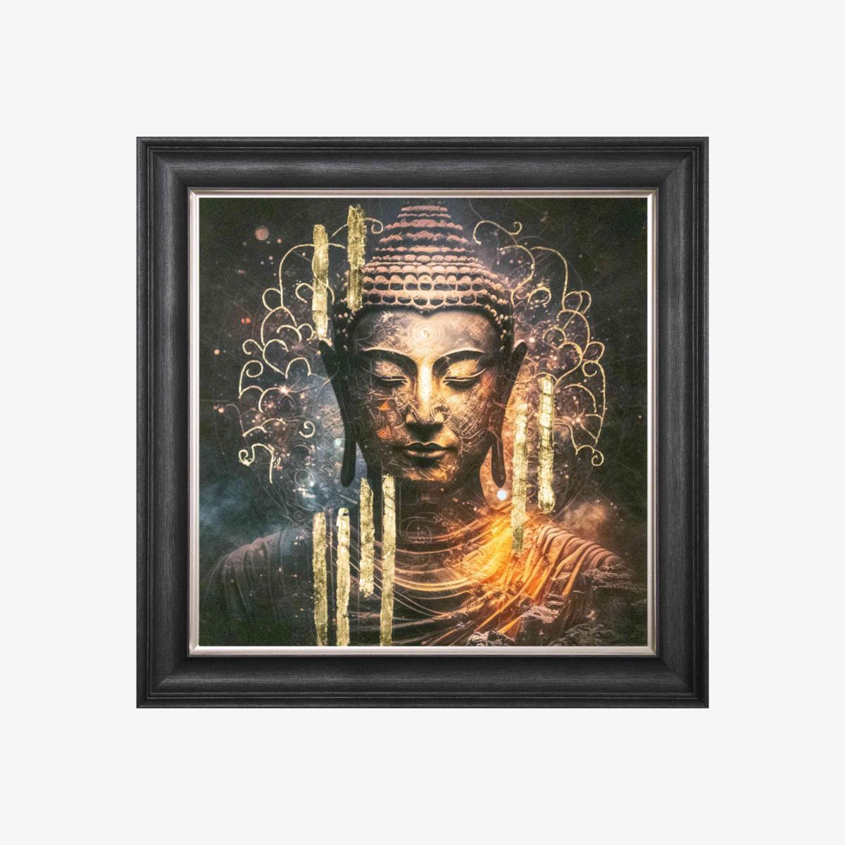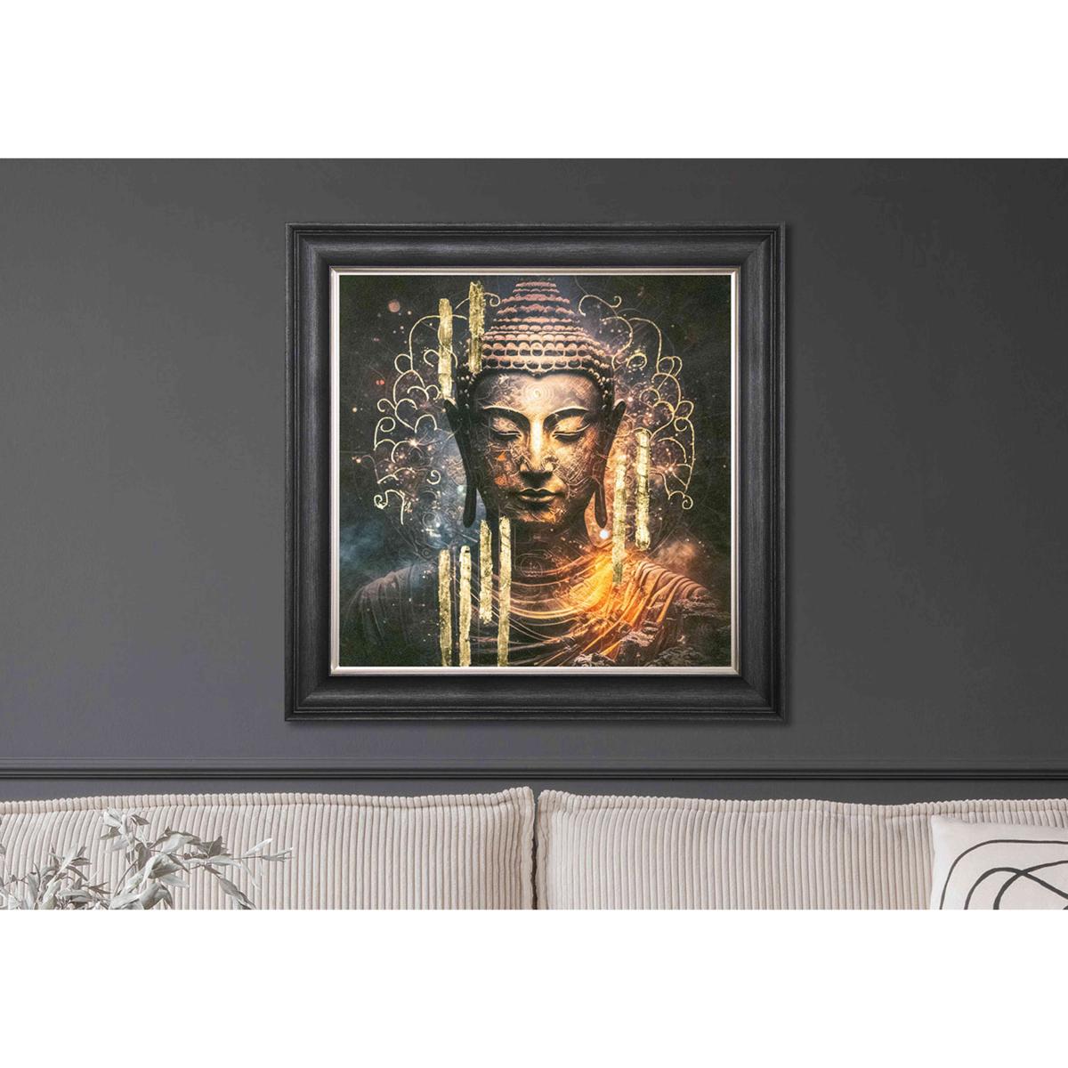 Find daily inspiration in this beautiful framed picture of the Buddha. Hand-finished with gold foil, it’s a stunning piece of wall art. Why you'll love it Warm and vibrant, this gold-toned framed Buddha picture captivates and inspires. This striking square framed picture suits all kinds of living spaces. Hand-embellished with gold foil. Dramatic black frame. Handmade in the UK. This framed picture is part of the Furniture Village home accessories collection. What you need to know Indoor use only. Dimensions Height: 75 cm (30 in). Width: 75 cm (30 in). Depth: 8 cm (4 in).