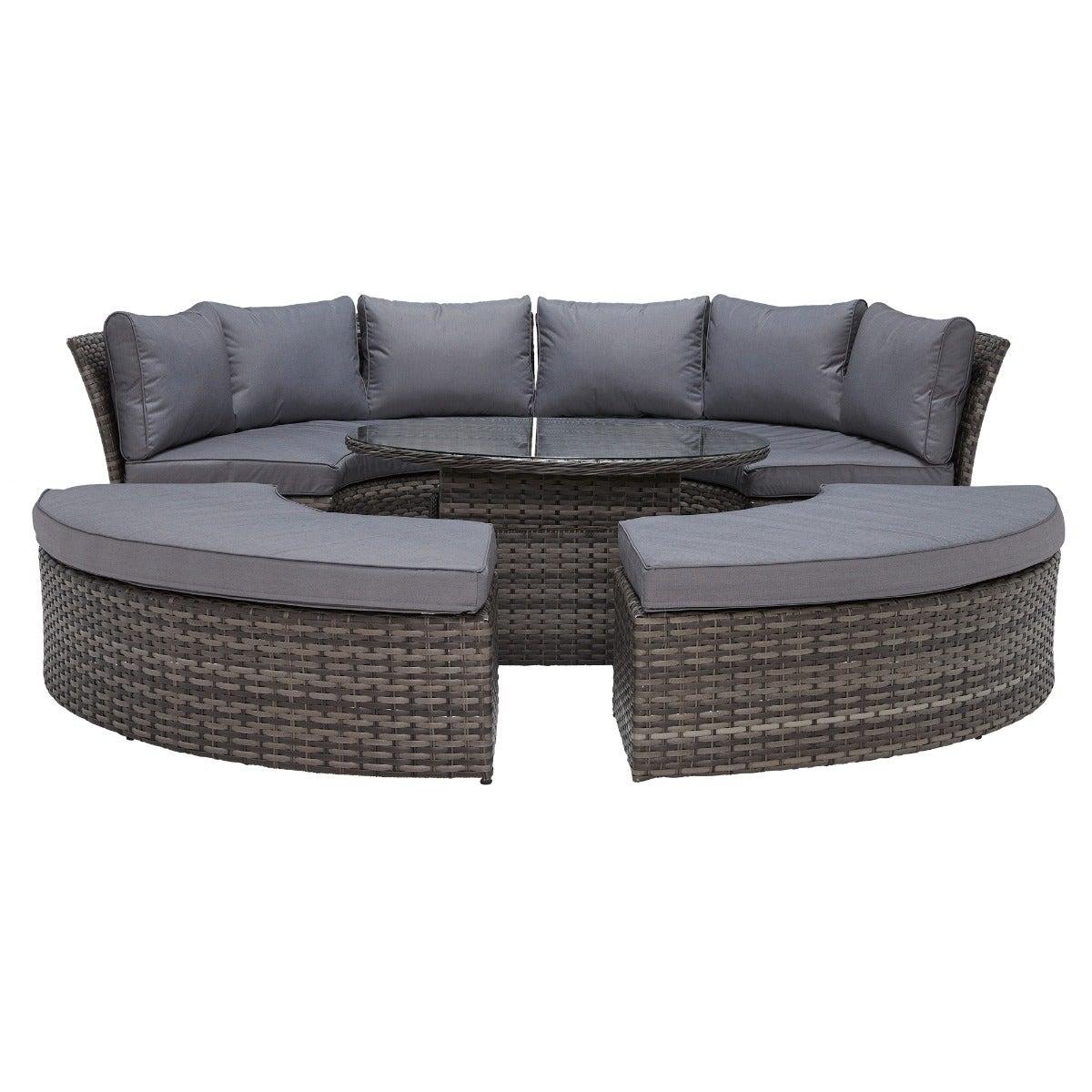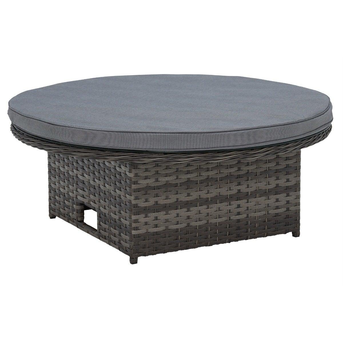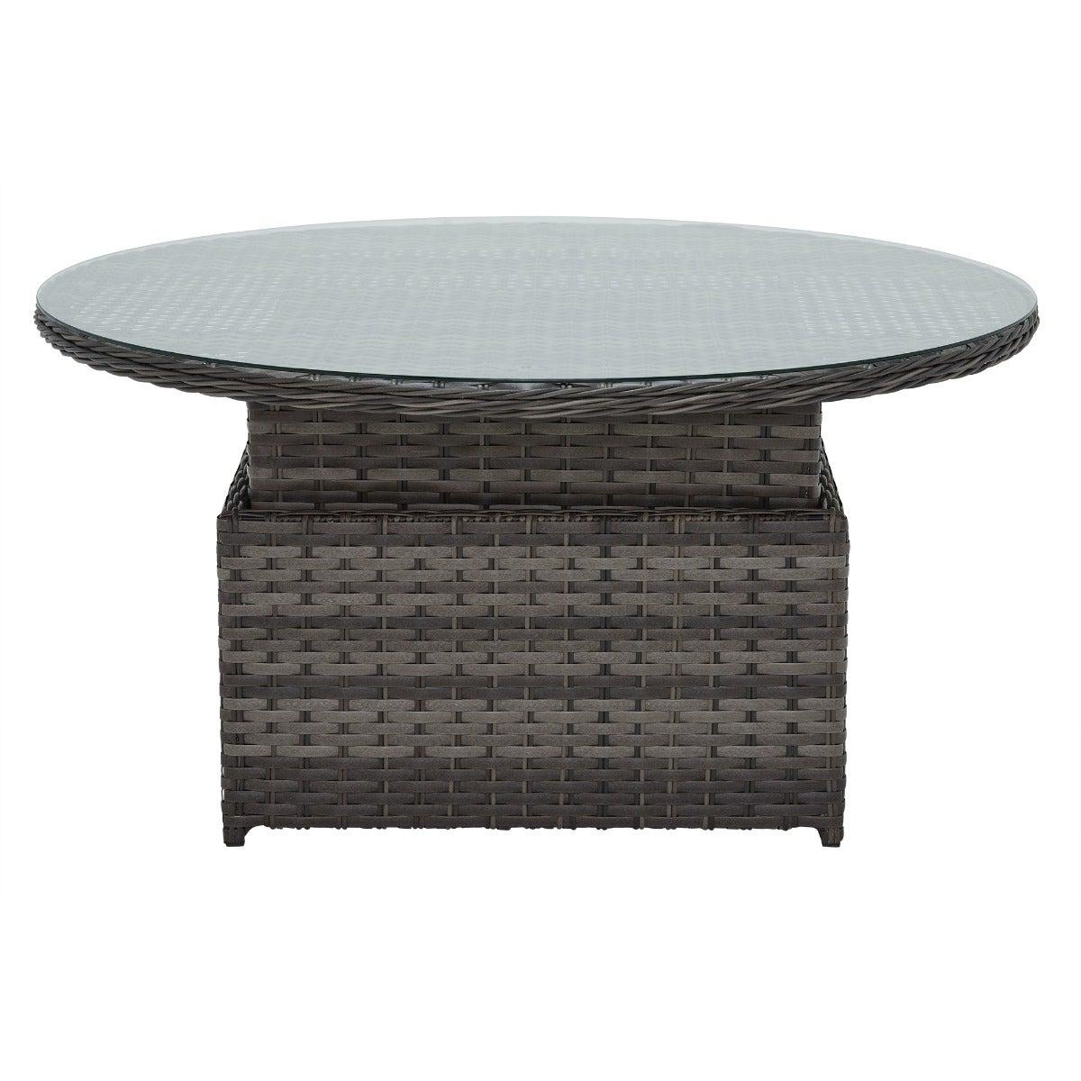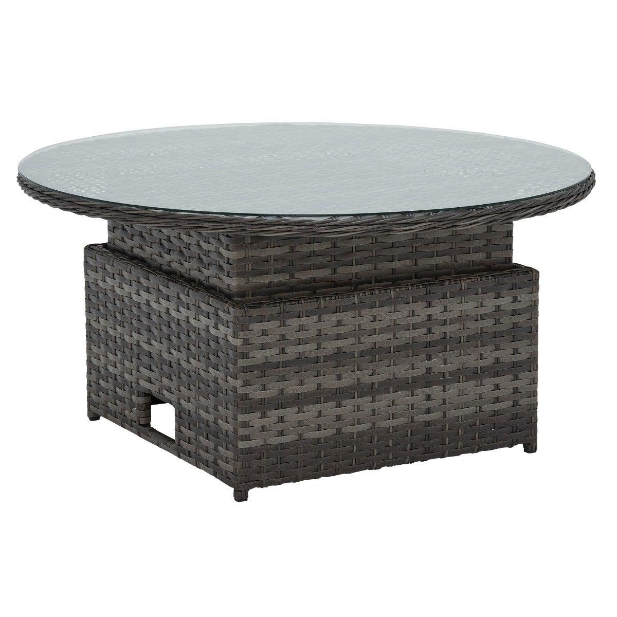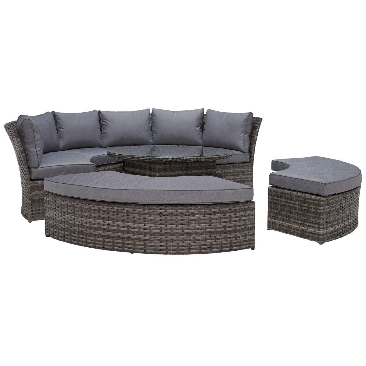 Design. If al fresco entertaining is your forte the Bude Garden Dining Set with Rising Table is exactly what your outdoor space calls for. The soft grey cushions set atop quality weatherproof rattan produces a practical yet stylish combination. The circular, modern design of the Bude Garden Dining Set creates quite the statement, transforming from a huge daybed and the perfect afternoon spot for reading, into a dining set with enough seating for all your family and friends, plus revealing a handy table ready to hold your cold drinks.