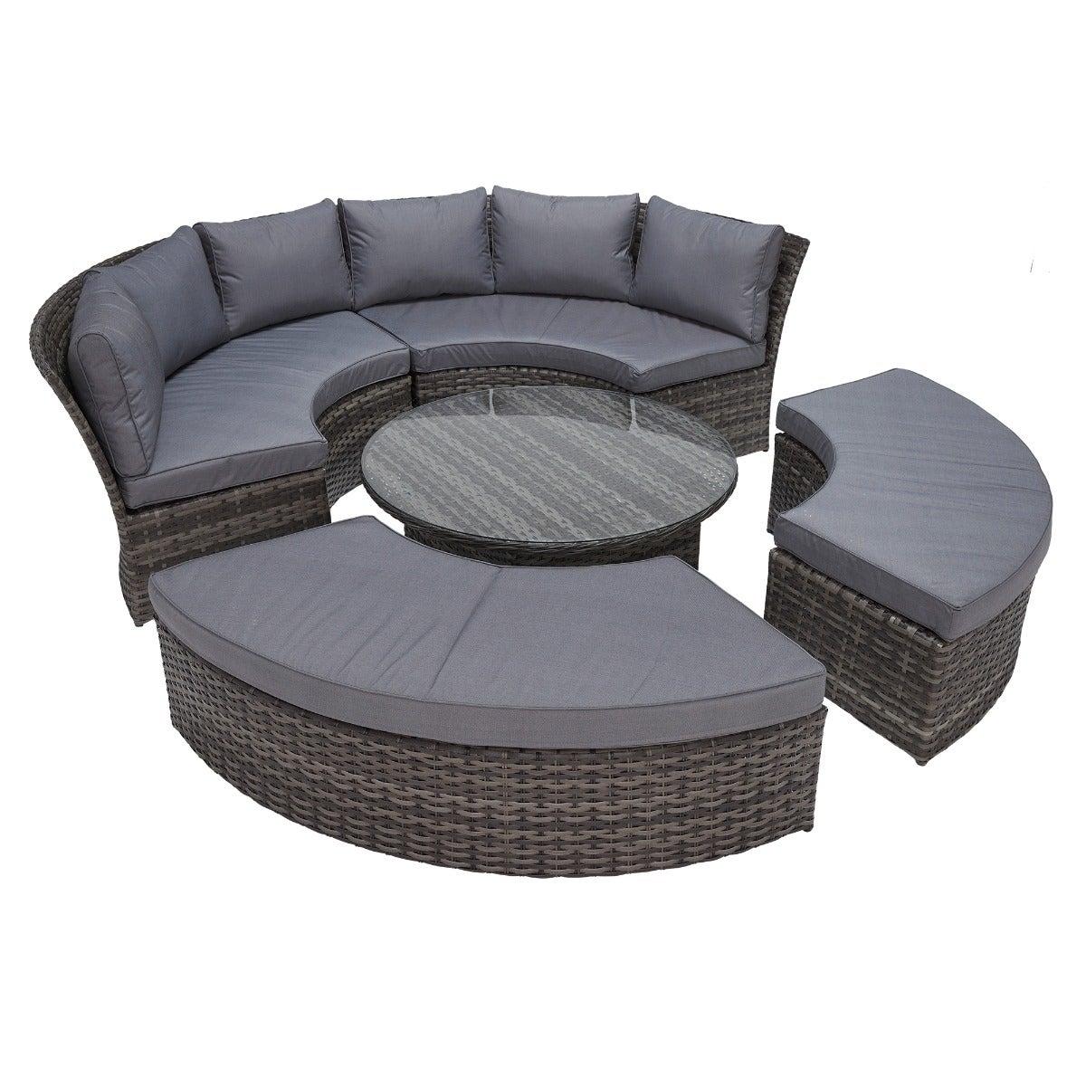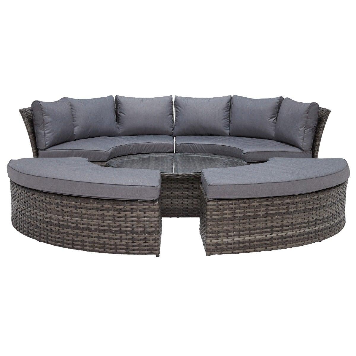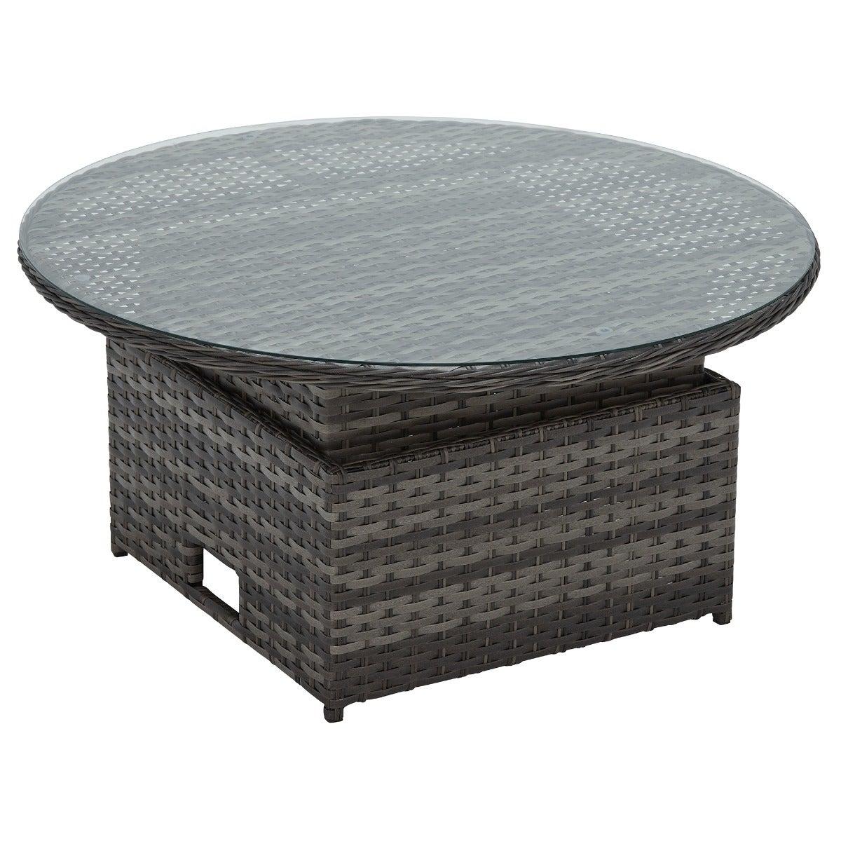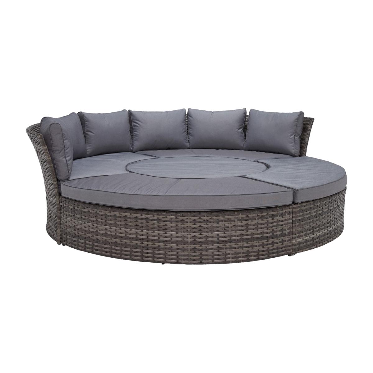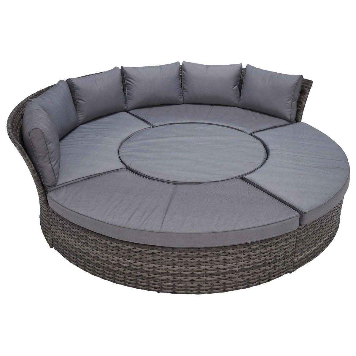 Design. If al fresco entertaining is your forte the Bude Garden Dining Set with Rising Table is exactly what your outdoor space calls for. The soft grey cushions set atop quality weatherproof rattan produces a practical yet stylish combination. The circular, modern design of the Bude Garden Dining Set creates quite the statement, transforming from a huge daybed and the perfect afternoon spot for reading, into a dining set with enough seating for all your family and friends, plus revealing a handy table ready to hold your cold drinks.