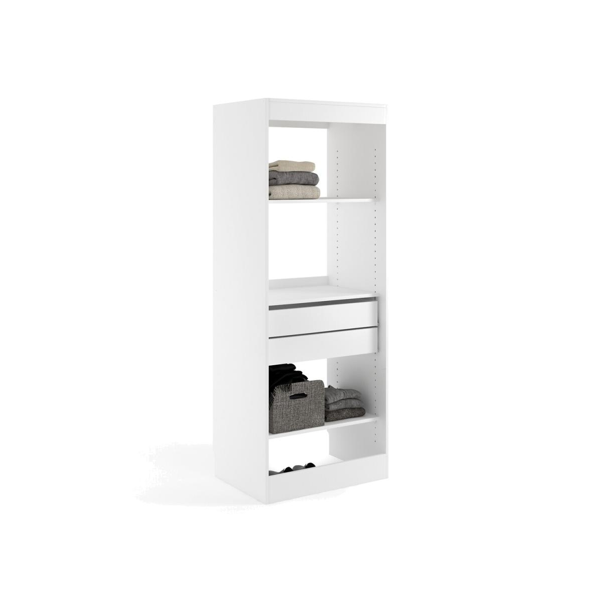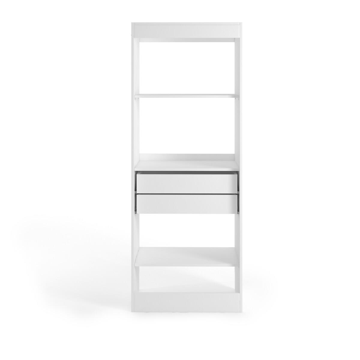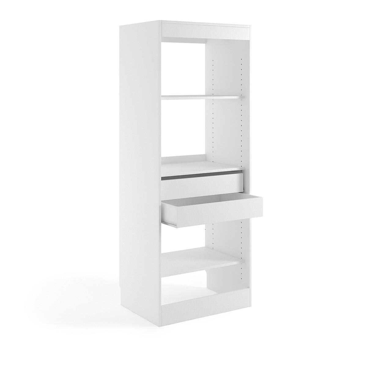 Build your own wardrobe! The Build 3-shelf and 2-drawer dressing room module adapts to your needs and your space. Choose from 6 wardrobe modules, then select your favourite blind colour. Product Details • 1 chrome steel hanging rail • 3 height-adjustable shelves, D45cm • 2 drawers • Made of PEFC certified melamine particleboard • Must be fixed to wall • Wall mounting system included, screws and dowels not provided • Blind sold separately, size 2 (L63 x H190cm) suitable for this moduleDimensions. Total • Length: 69cm • Height: 180cm • Depth: 50cm • Weight: 40kg. Usable dimensions • Inner drawer :L60.1 x H10.4 x D41.8cmDelivery:. This product is sold ready to assemble. Note! Please check that all access points are large enough to accommodate your delivery (doors, stairs, lifts). • Made in France. • WOOD FROM SUSTAINABLY MANAGED FORESTS. PEFC™ certified wood comes from sustainably managed forests and controlled sources. PEFC™ contributes to ensuring sustainability and renewal through natural regeneration or planting by preserving trees of the future and promoting the diversity of species. Dimensions and weight of parcel2 parcels • L71 x H13 x D54.5cm. 31kg. • L185 x H4 x D54.5cm. 20.5kg.