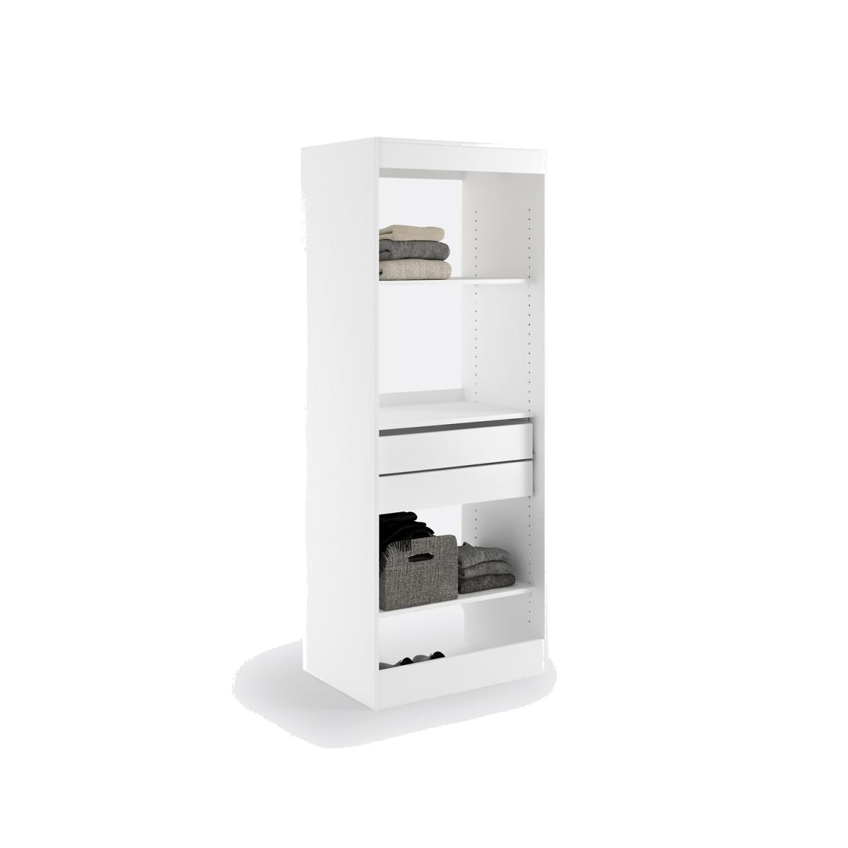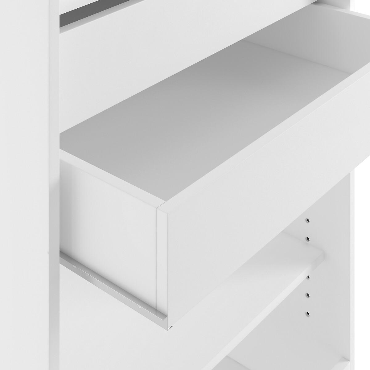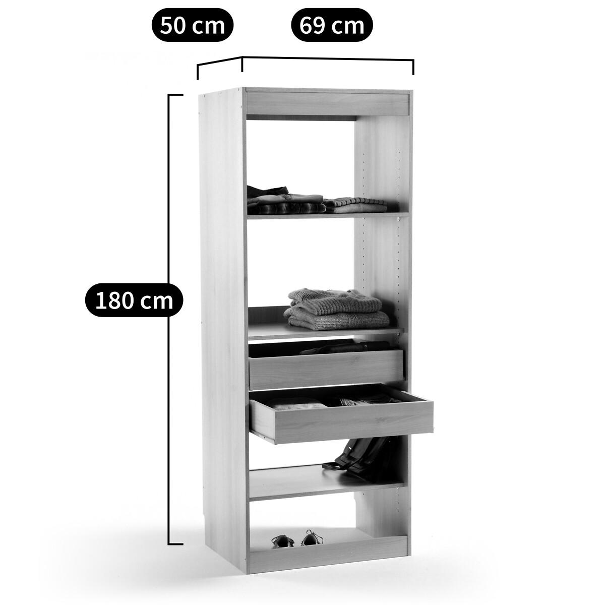 Build your own wardrobe! The Build 3-shelf and 2-drawer dressing room module adapts to your needs and your space. Choose from 6 wardrobe modules, then select your favourite blind colour. Product Details • 1 chrome steel hanging rail • 3 height-adjustable shelves, D45cm • 2 drawers • Made of PEFC certified melamine particleboard • Must be fixed to wall • Wall mounting system included, screws and dowels not provided • Blind sold separately, size 2 (L63 x H190cm) suitable for this moduleDimensions. Total • Length: 69cm • Height: 180cm • Depth: 50cm • Weight: 40kg. Usable dimensions • Inner drawer :L60.1 x H10.4 x D41.8cmDelivery:. Assembly required. Available for home delivery. Note! Please check that all access points are large enough to accommodate your delivery (doors, stairs, lifts). • Made in France. • WOOD FROM SUSTAINABLY MANAGED FORESTS. PEFC certified wood comes from sustainably managed forests and controlled sources. PEFC contributes to ensuring sustainability and renewal through natural regeneration or planting by preserving trees of the future and promoting the diversity of species. Dimensions and weight of parcel2 parcels • L71 x H13 x D54.5cm. 31kg. • L185 x H4 x D54.5cm. 20.5kg.