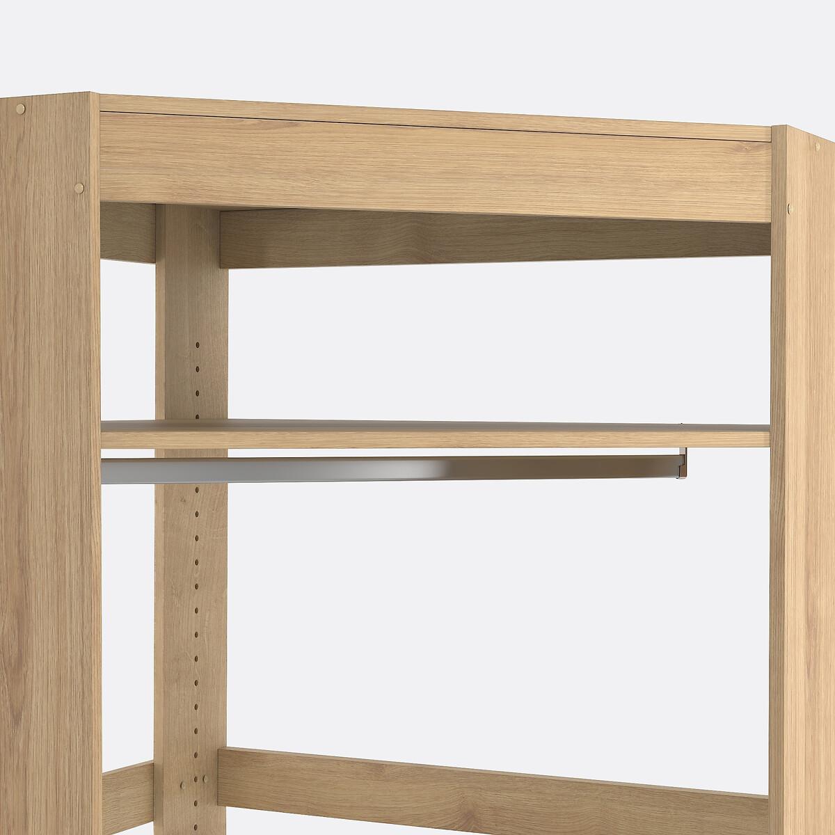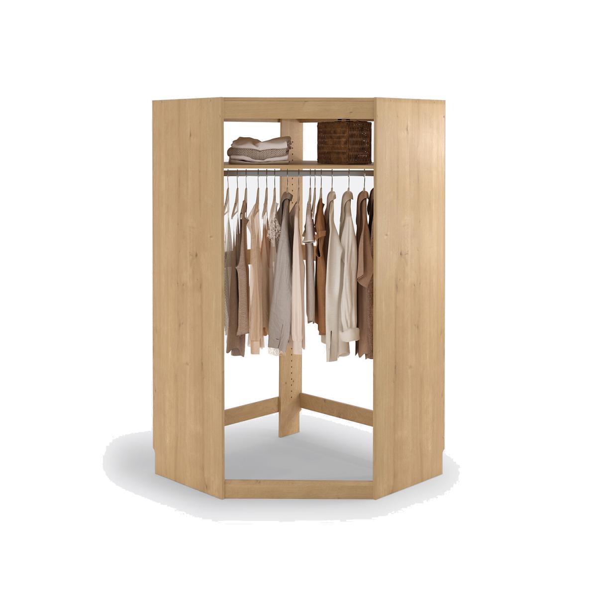 Build your own wardrobe! The Build corner dressing module adapts to your needs and your space. Choose from 6 wardrobe modules, then select your favourite blind colour. Product Details • 1 chrome steel hanging rail • 1 shelf at the top, adjustable in height, D96.5cm • Made of PEFC certified melamine particleboard • Must be fixed to wall • Wall mounting system included, screws and dowels not provided • Blind sold separately, size 3 (L74 x H190 m) suitable for this moduleDimensions. Total • Width: 100cm • Height: 180cm • Depth: 100cm • Weight: 54kg. Usable space • Face width: 141.5cm • Width of opening: 68.4cm • Depth from corner to plinth: 104.7cmDelivery:. Assembly required. Available for home delivery. Note! Please check that all access points are large enough to accommodate your delivery (doors, stairs, lifts). • Made in France. • WOOD FROM SUSTAINABLY MANAGED FORESTS. PEFC certified wood comes from sustainably managed forests and controlled sources. PEFC contributes to ensuring sustainability and renewal through natural regeneration or planting by preserving trees of the future and promoting the diversity of species. Dimensions and weight of parcel2 parcels • L103 x H6 x D103cm. 28kg • L185 x H6 x D54cm. 26kg